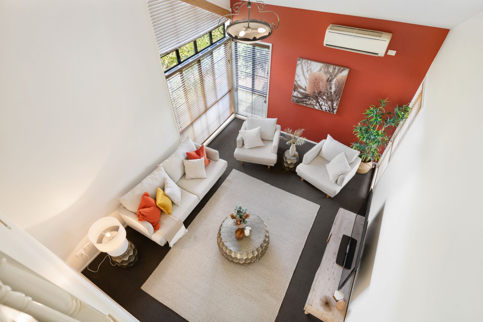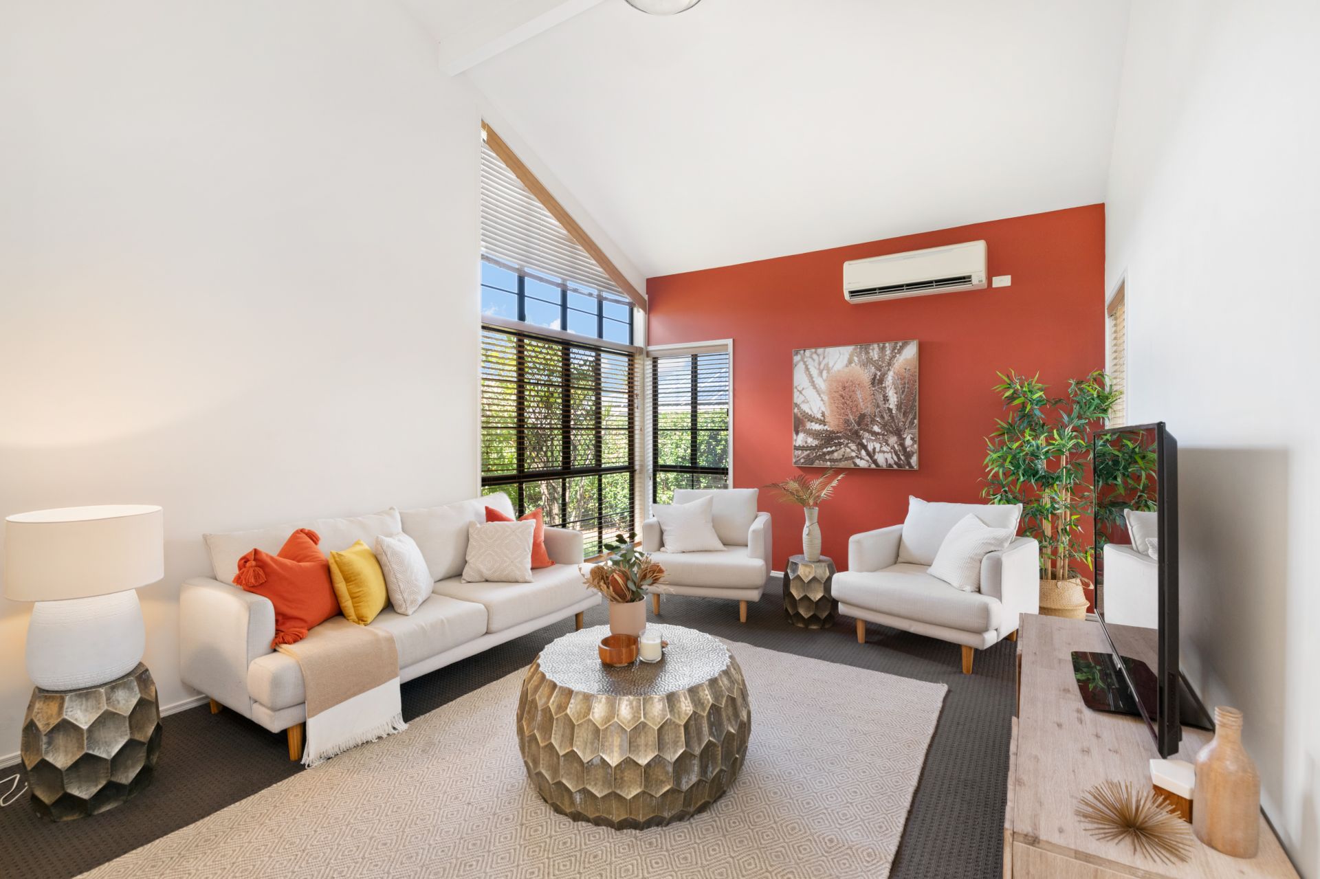 - The home features both formal lounge and dining, neatly positioned across the hallway from each other. Both feature carpeted flooring, with the lounge featuring a striking raked ceiling and split-system air-conditioning.
