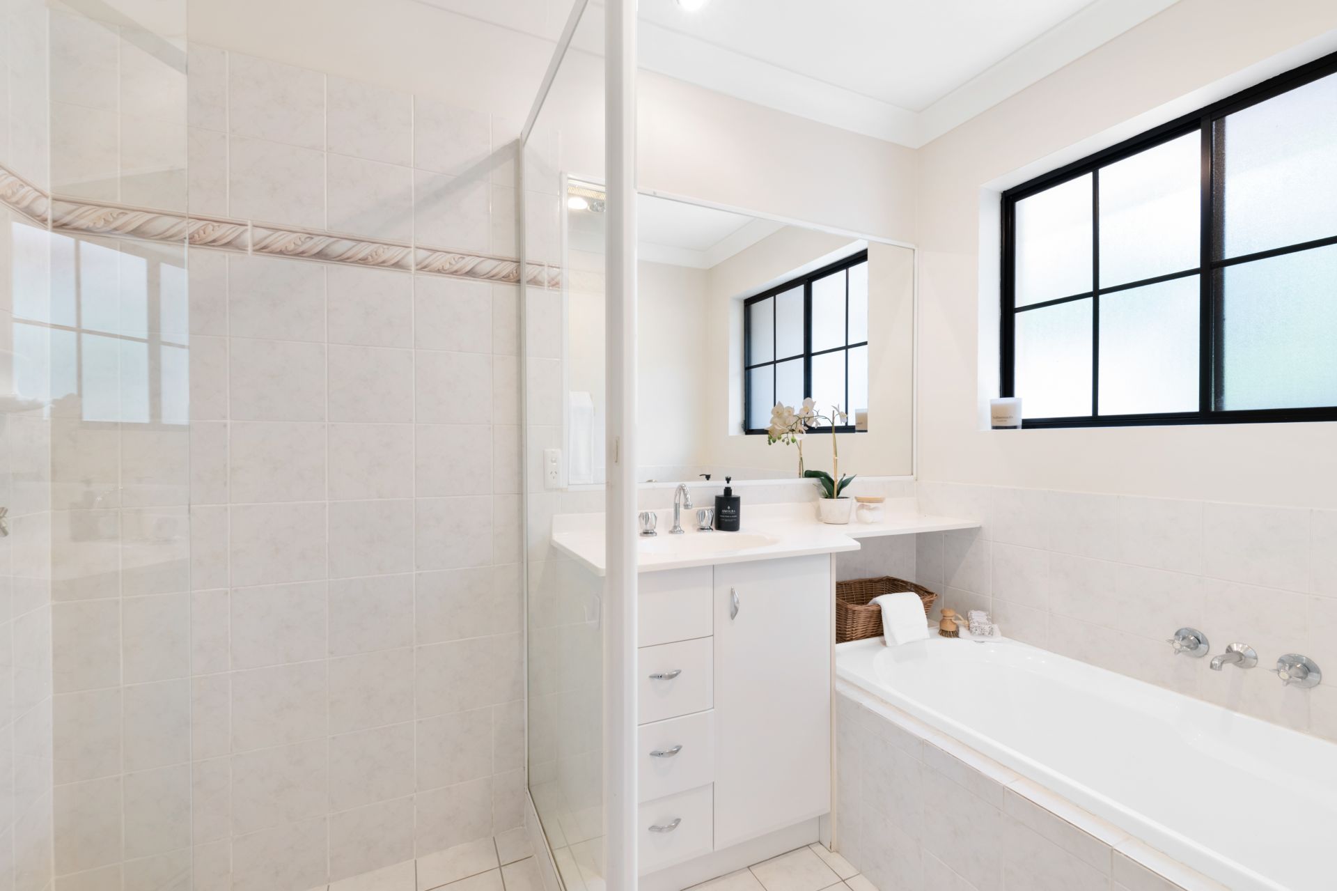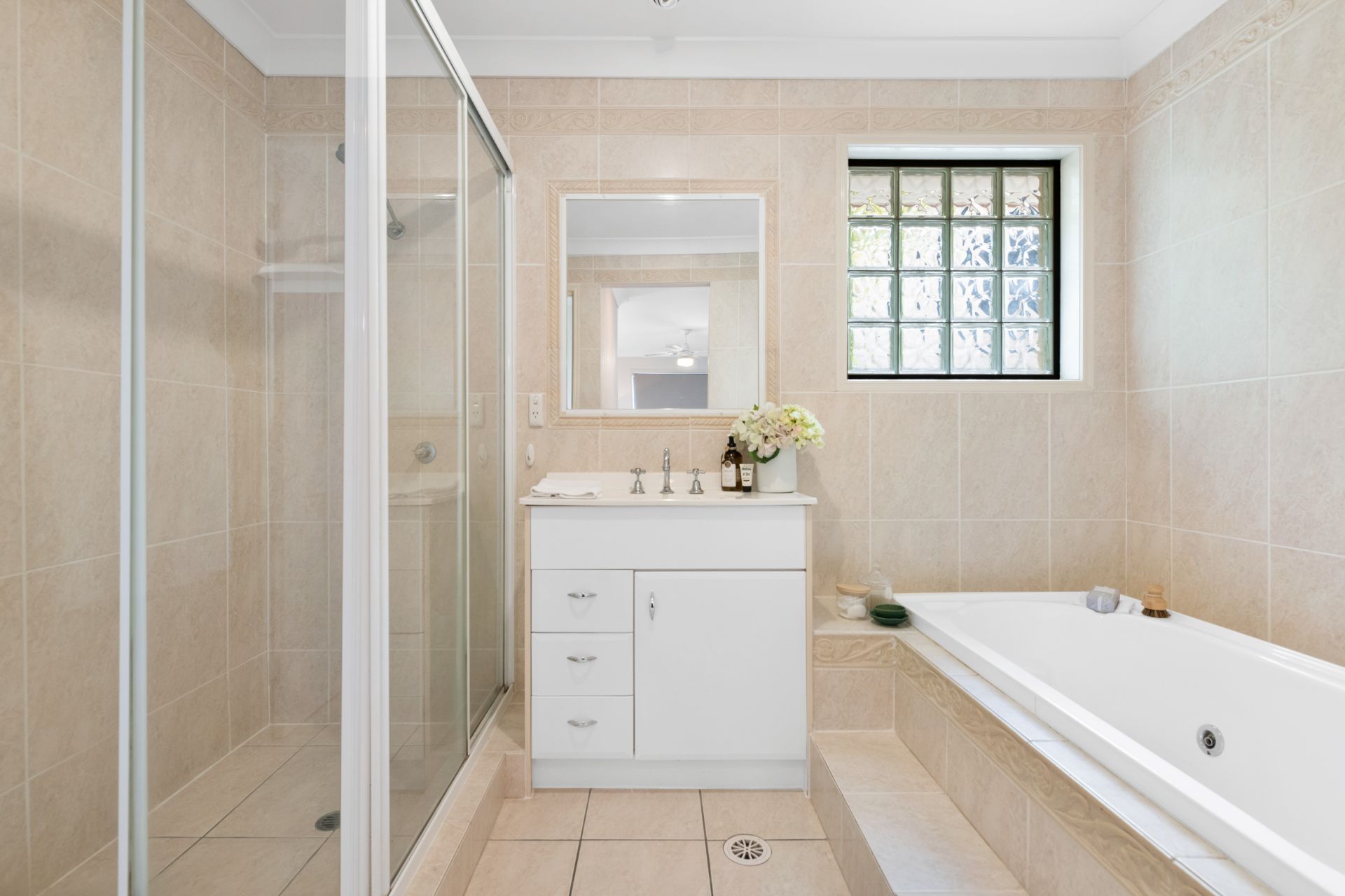 - Bathroom two is the ensuite to the master bedroom and features over-sized shower, spa bath, single vanity, floor-to-ceiling tiles and toilet.