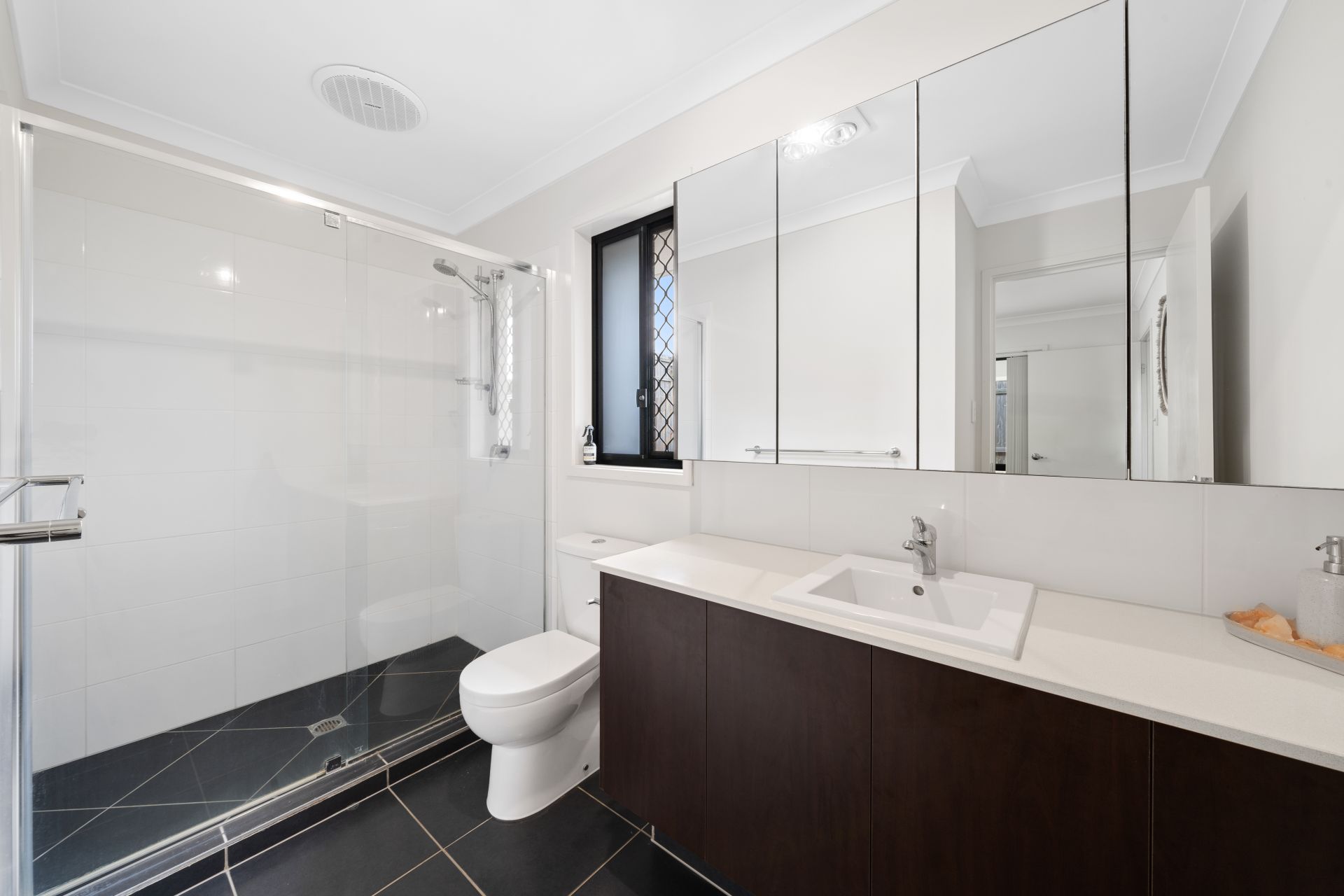 > The ensuite bathroom features a large shower with detachable showerhead, single basin stone topped vanity with plenty of storage, large mirror fronted medicine cabinets, towel rack, light/extractor/heat combo, sliding glass window with security screens and toilet.