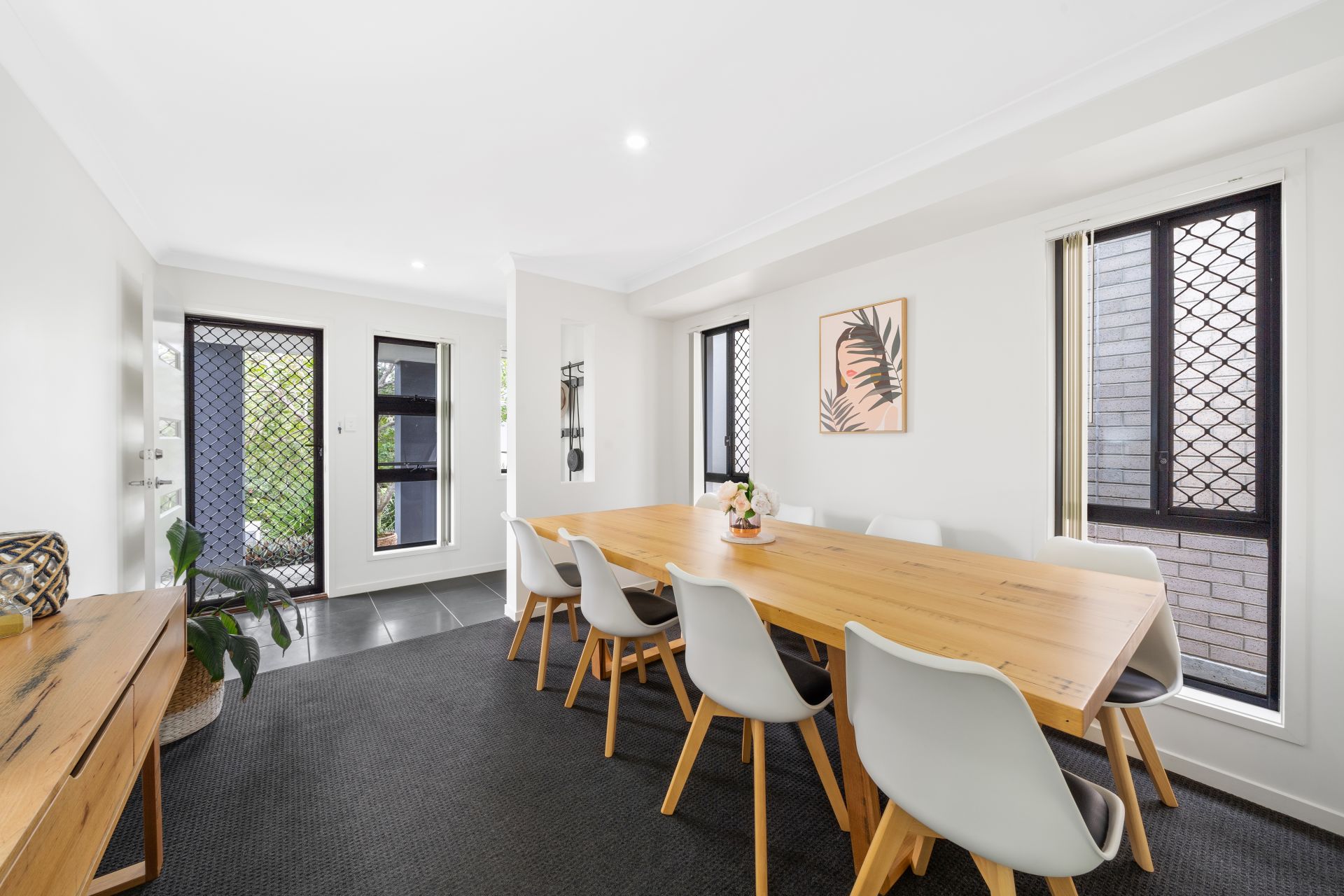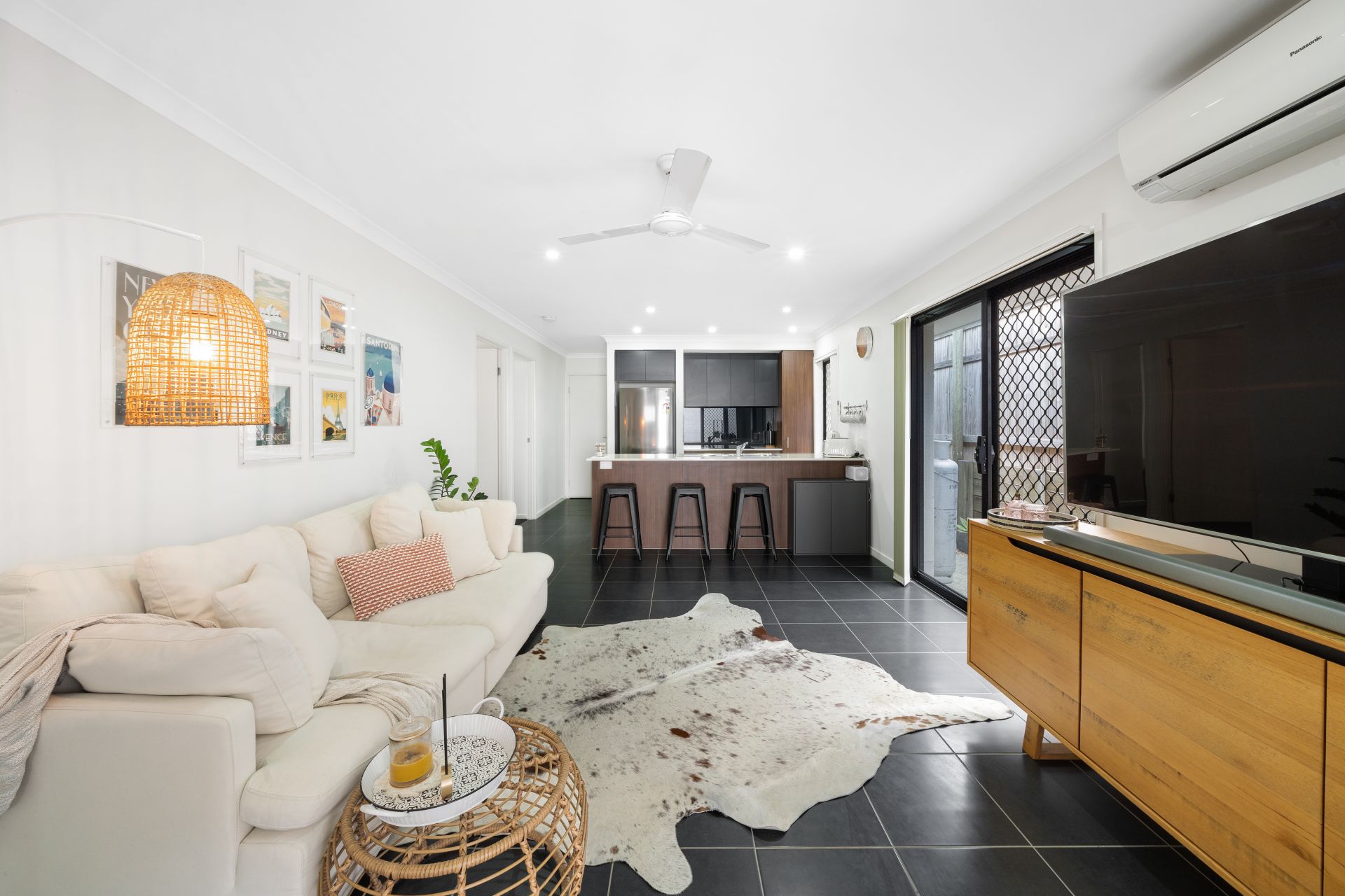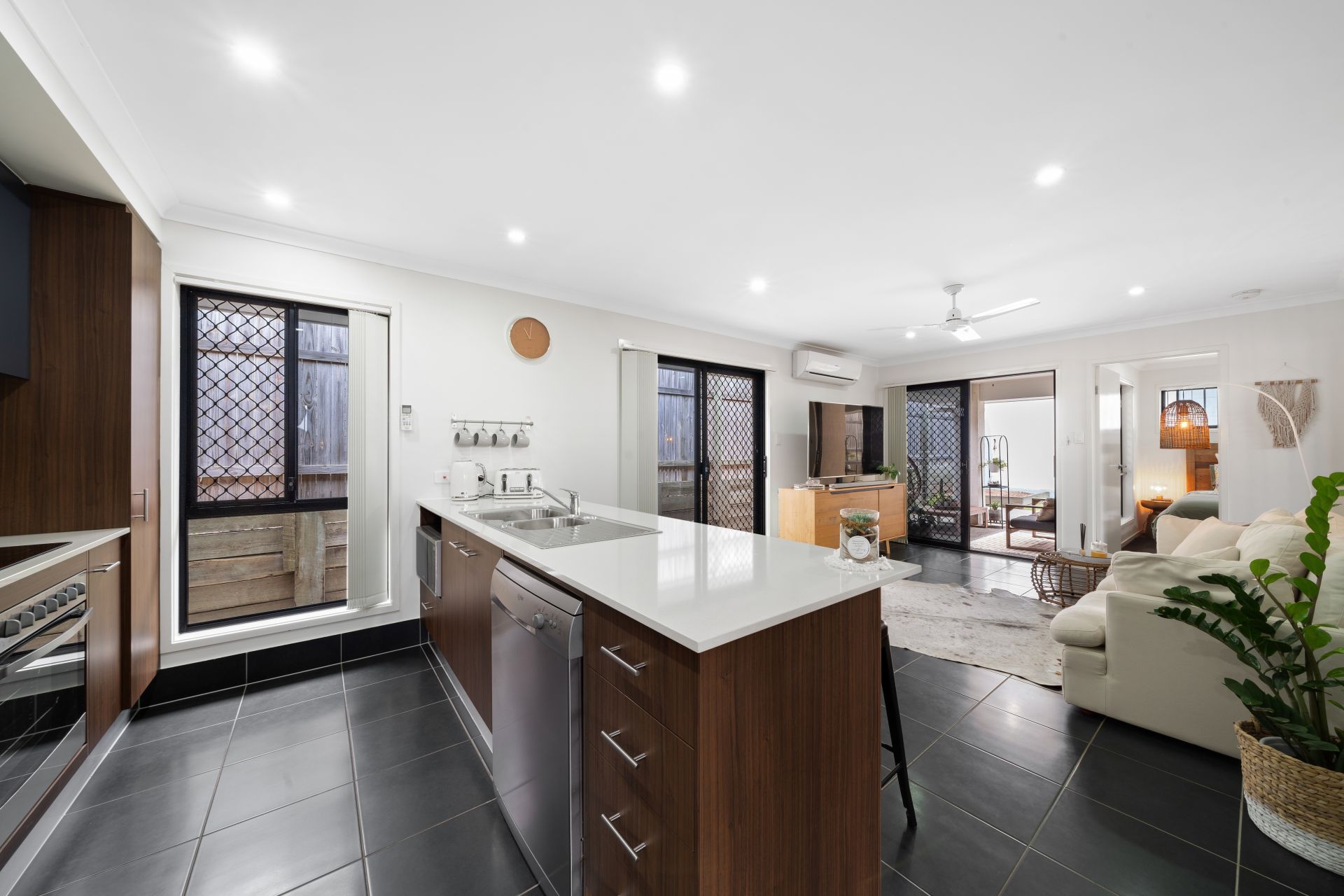 > The living and dining areas extend effortlessly from the front of the home to the kitchen and out through the glass sliding doors to the low maintenance yard and outdoor entertaining patio. The many windows and doors add to the expansive nature of the home featuring Panasonic split system air-conditioning, combination of tiled and carpet flooring, security screens, sliding windows with vertical blinds and down-lighting throughout.