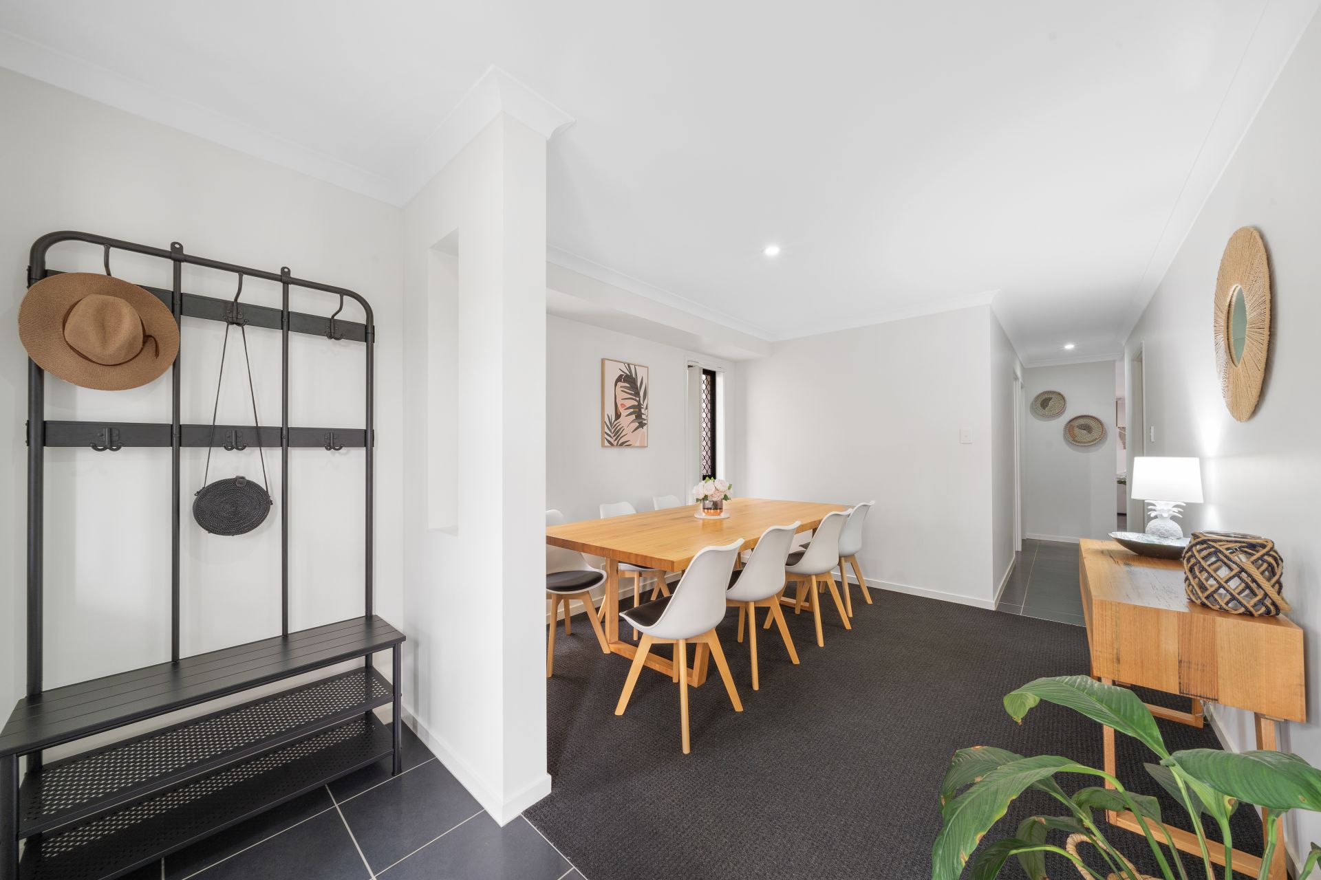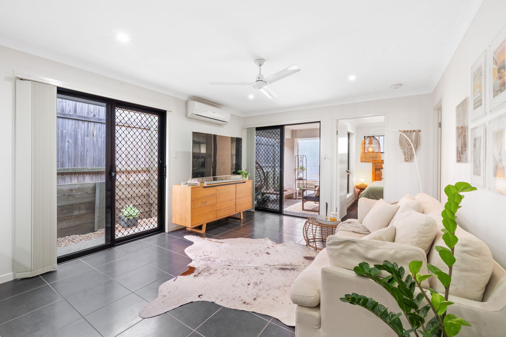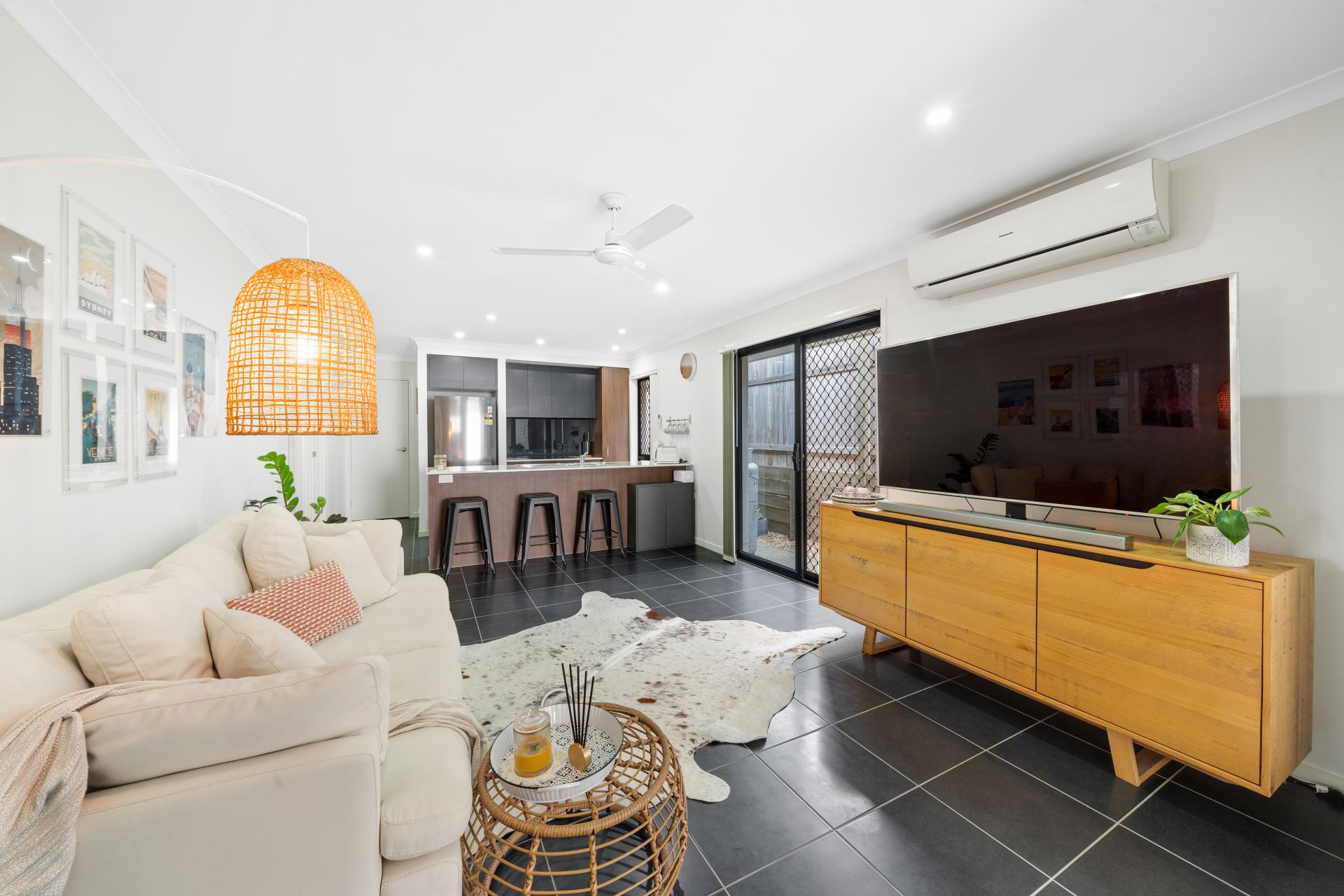 > The living and dining areas extend effortlessly from the front of the home to the kitchen and out through the glass sliding doors to the low maintenance yard and outdoor entertaining patio. The many windows and doors add to the expansive nature of the home featuring Panasonic split system air-conditioning, combination of tiled and carpet flooring, security screens, sliding windows with vertical blinds and down-lighting throughout.