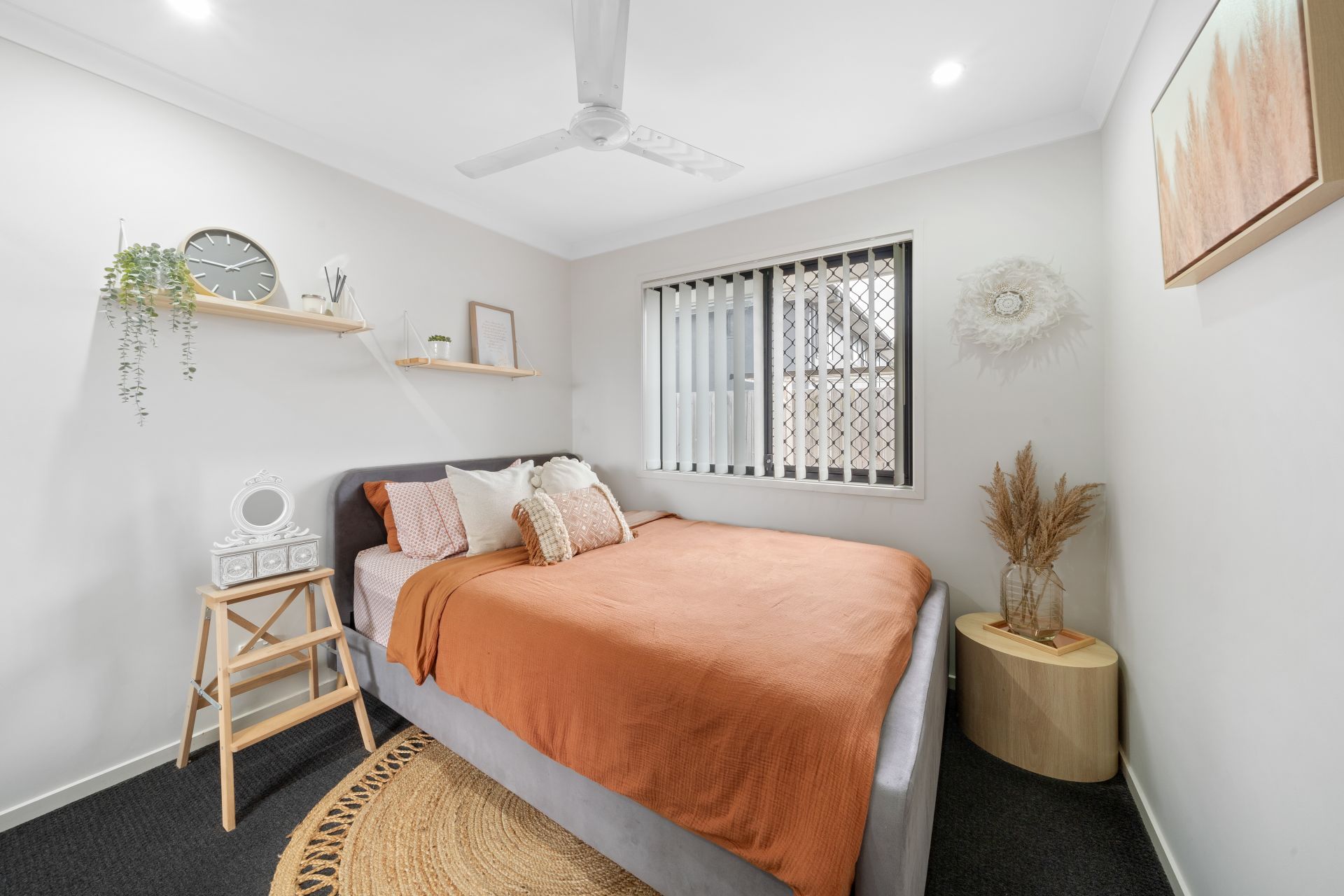 > The master features carpet flooring, mirror fronted built-in robe, ensuite bathroom, ceiling fan, down-lighting, security screens with traditional sliding windows and vertical blinds.