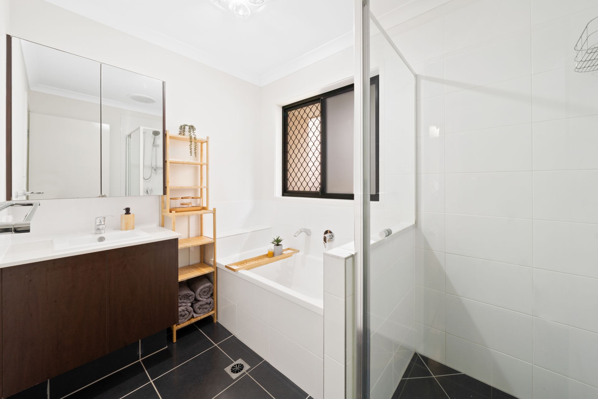 > The main bathroom features a shower with detachable showerhead, bath, single basin stone topped vanity with plenty of storage, large mirror fronted medicine cabinet, towel rack, light/extractor/heat combo, sliding glass window with security screens and separate toilet.