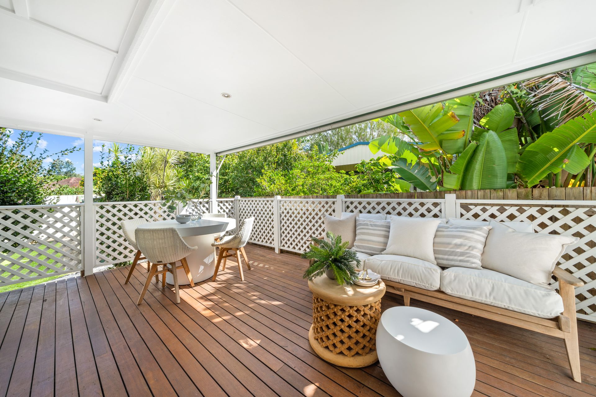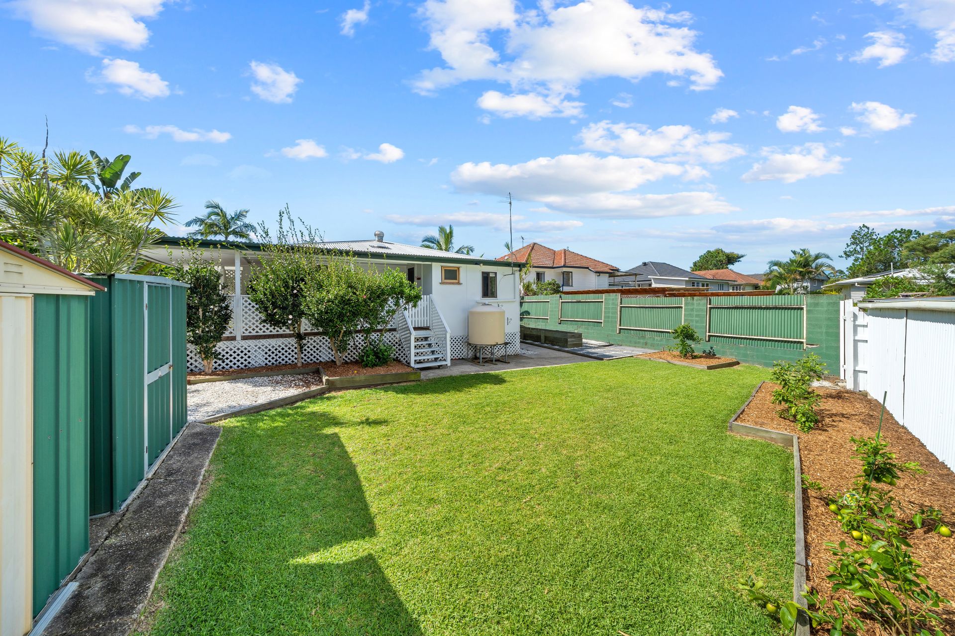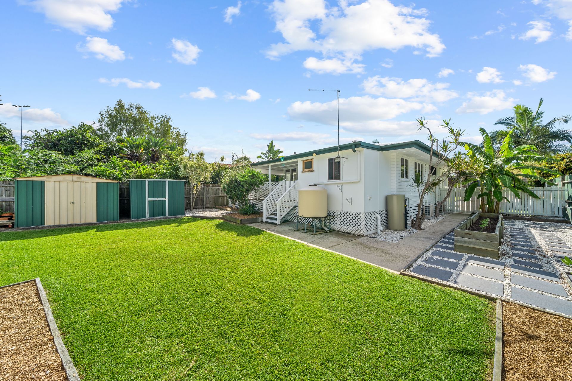 > Outdoor entertaining will be a breeze thanks to the rear deck giving you views over the fully enclosed backyard. Perfect for relaxing and unwinding boasting timber deck, down-lighting and stairs leading to the spacious kid and pet friendly yard. An array of fruit trees and raised garden beds, 2 sheds and rainwater tank encapsulating everything there is to love about our Queensland lifestyle.