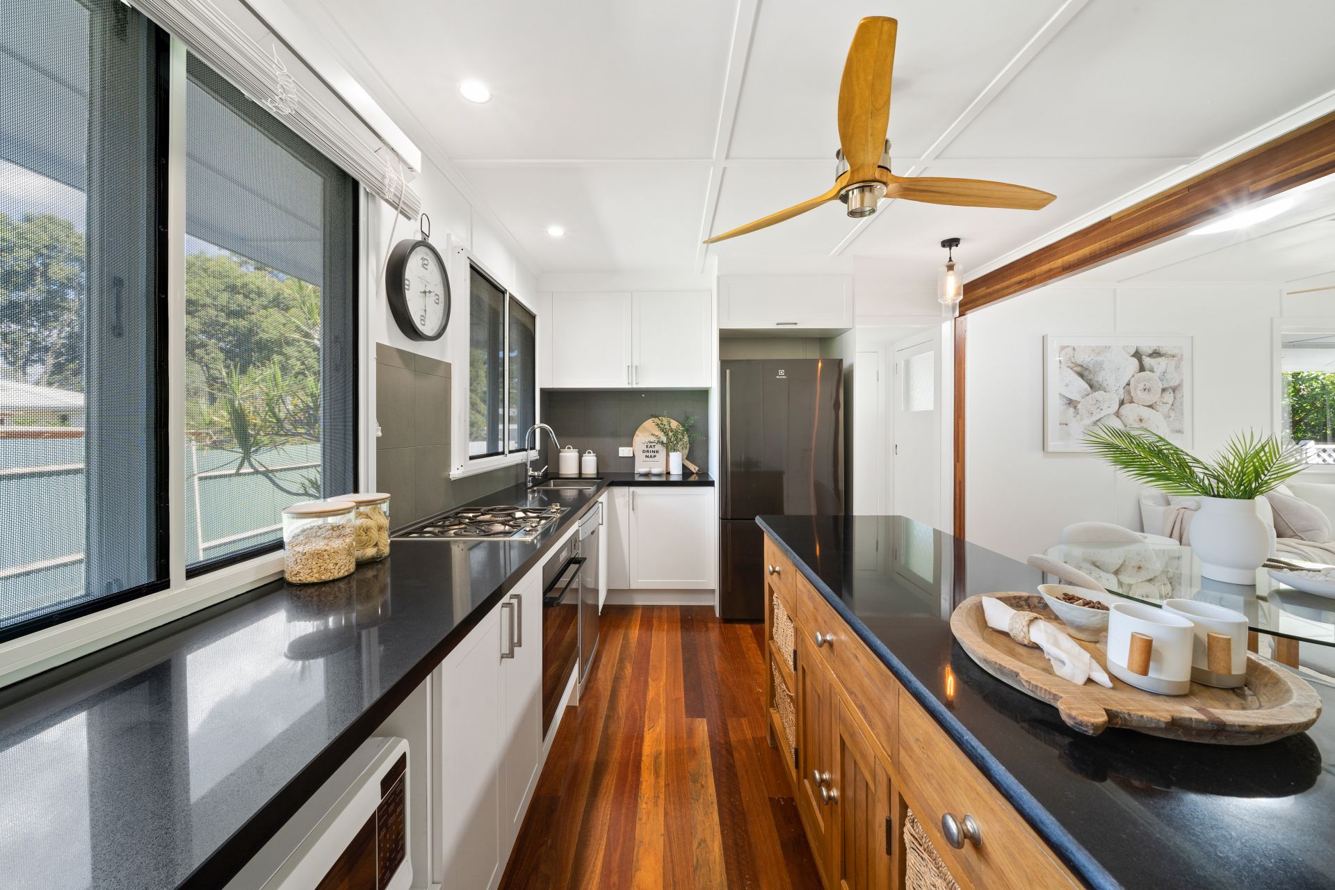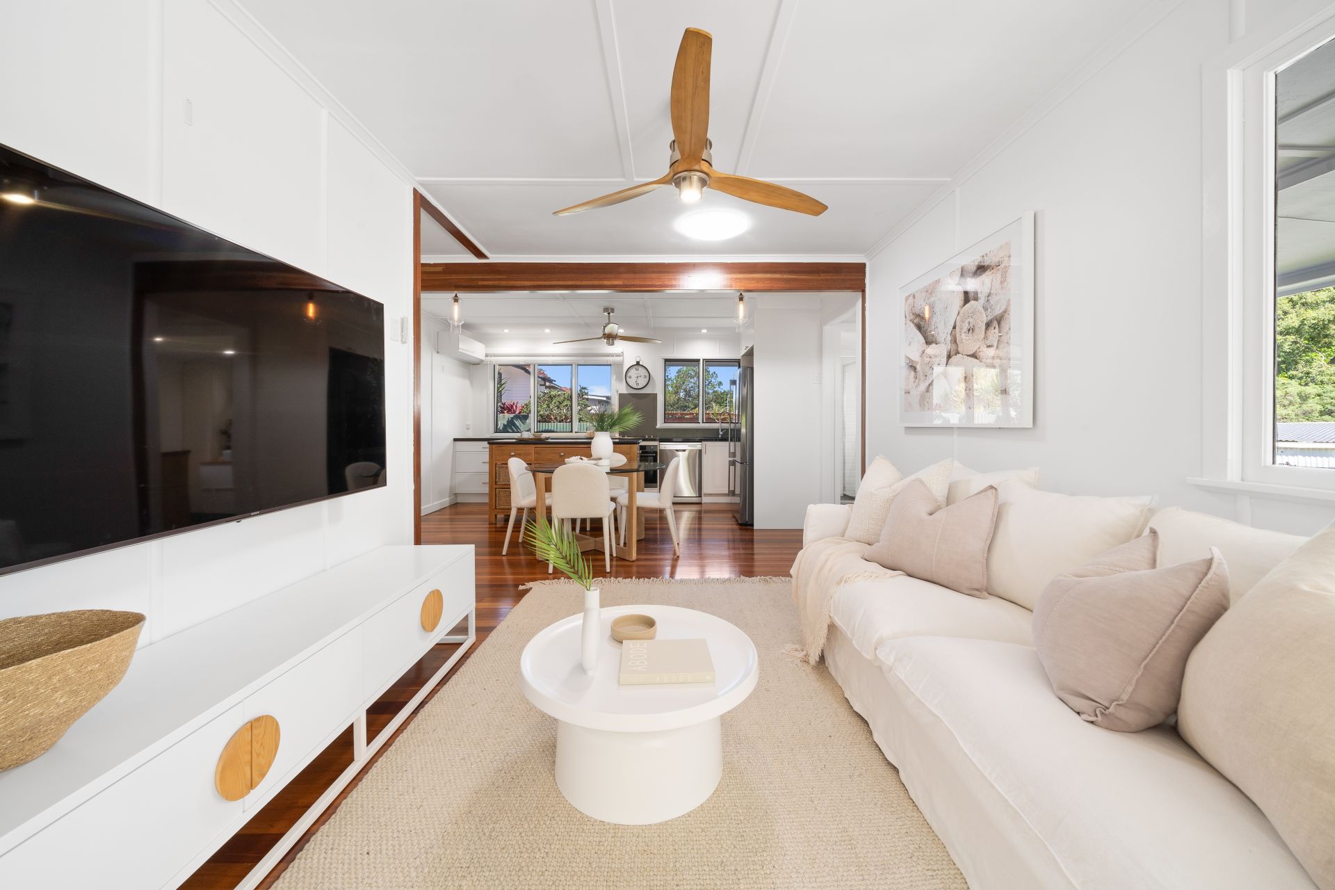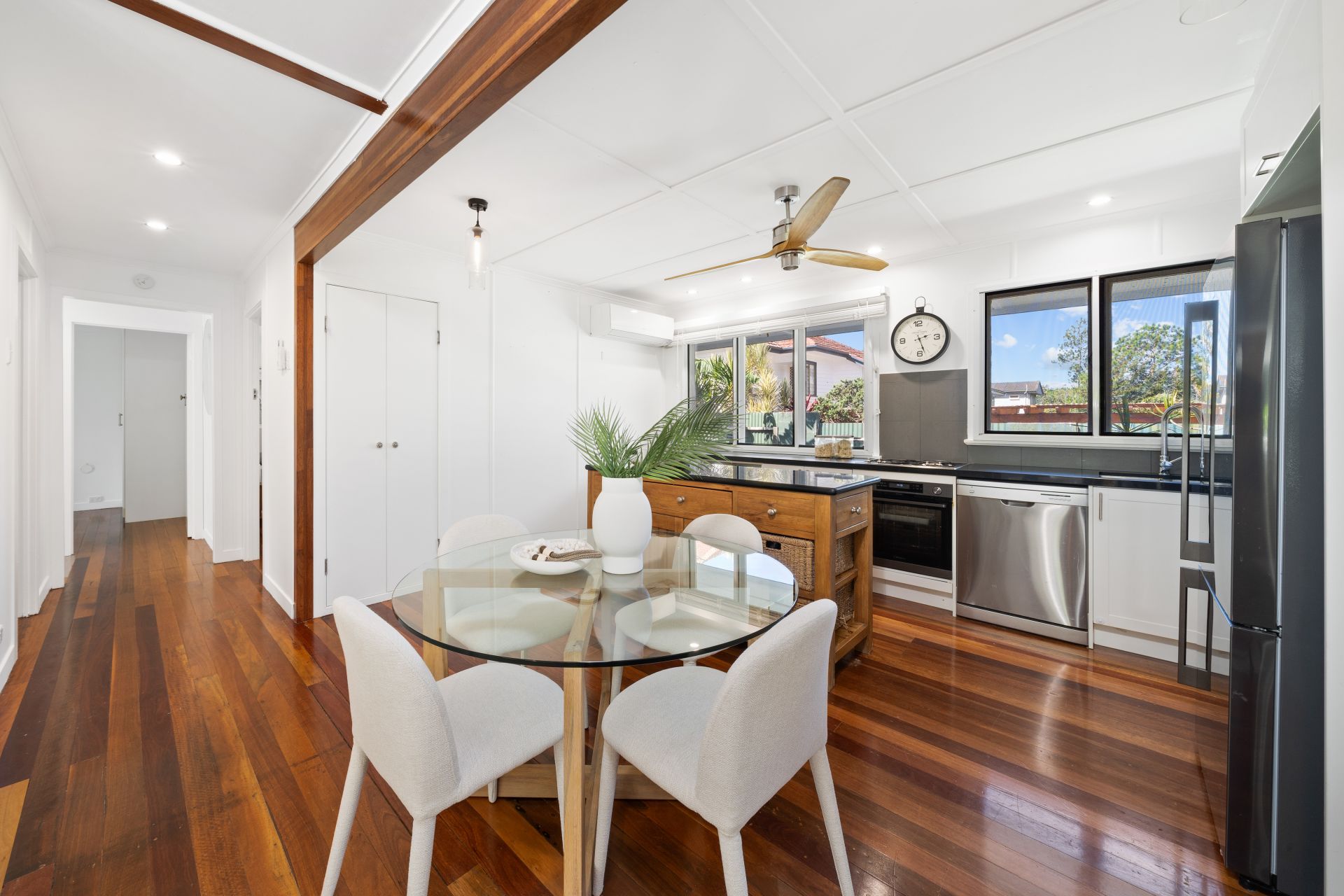 > The light-filled living and dining area flows effortlessly to the kitchen and through glass French doors to the wrap around rear deck. Featuring polished timber flooring, ceiling fan, sky light, down-lighting and casement windows creating a seamless flow of living space.