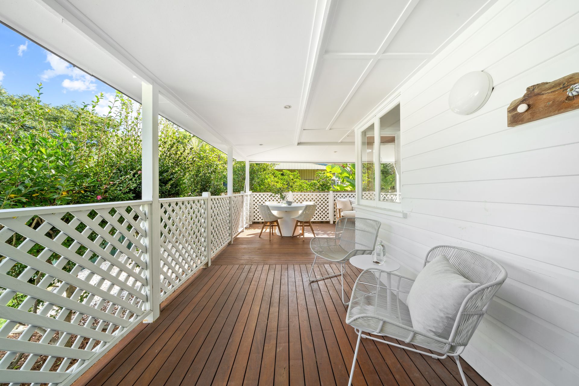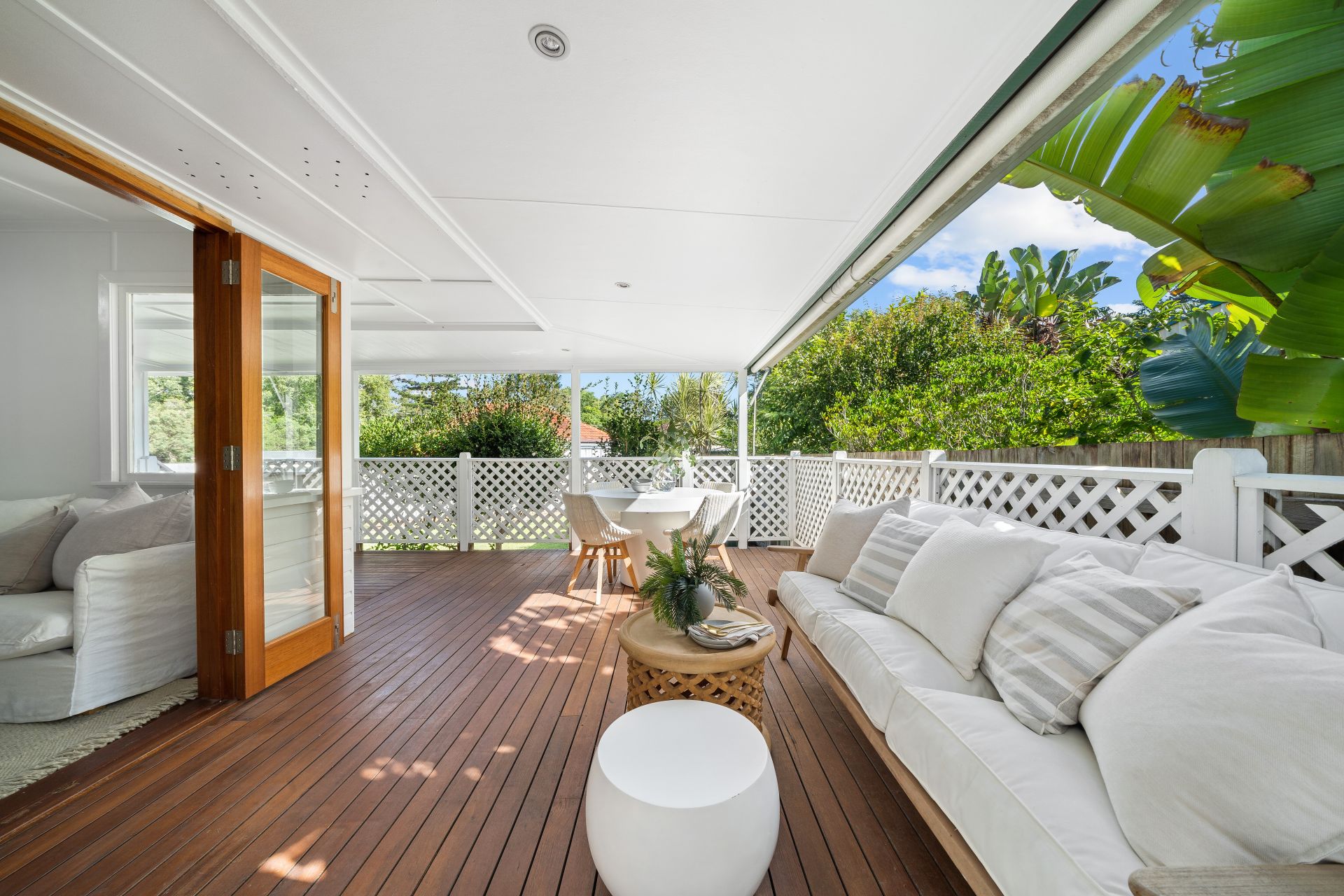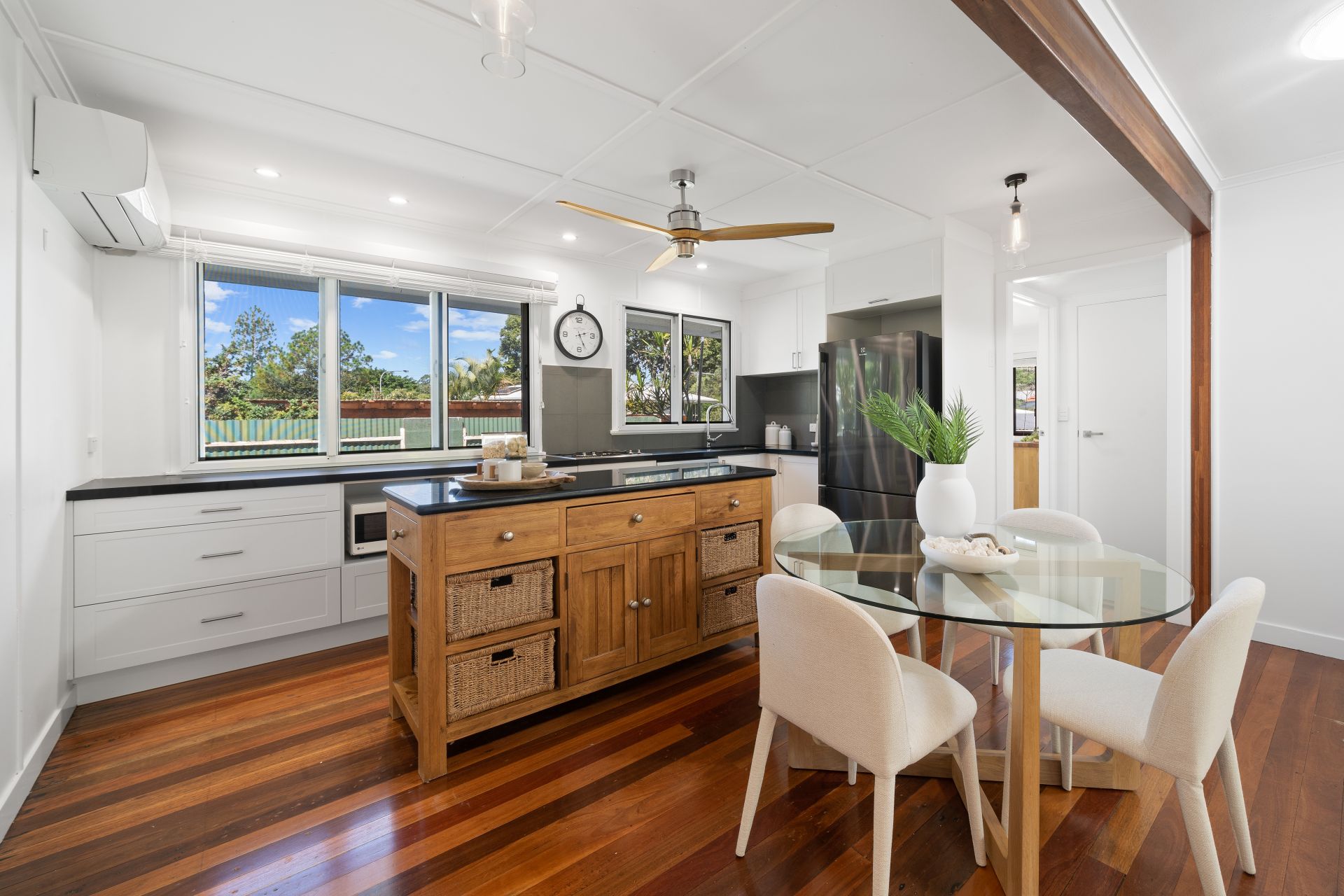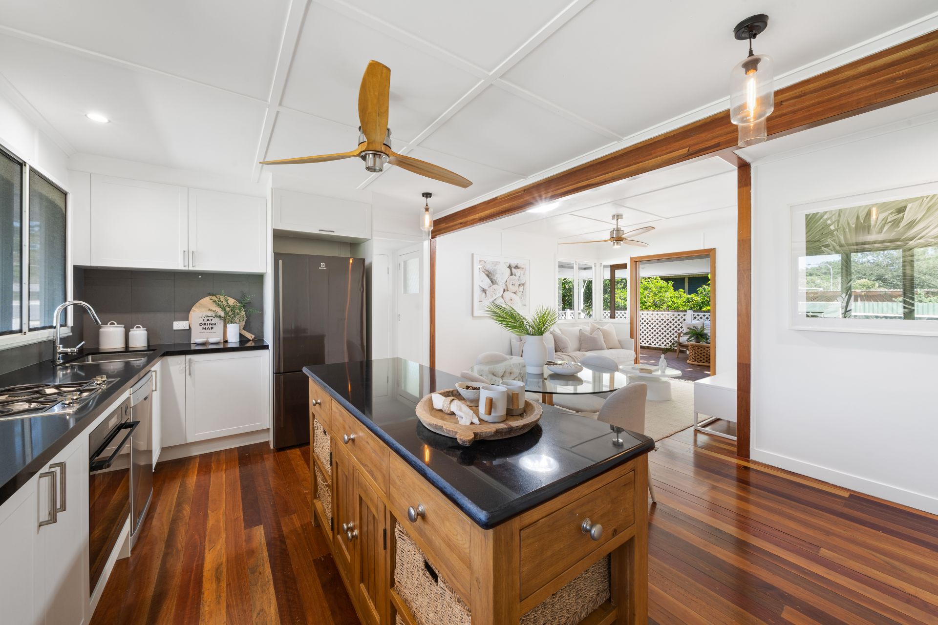 > The light-filled living and dining area flows effortlessly to the kitchen and through glass French doors to the wrap around rear deck. Featuring polished timber flooring, ceiling fan, sky light, down-lighting and casement windows creating a seamless flow of living space.