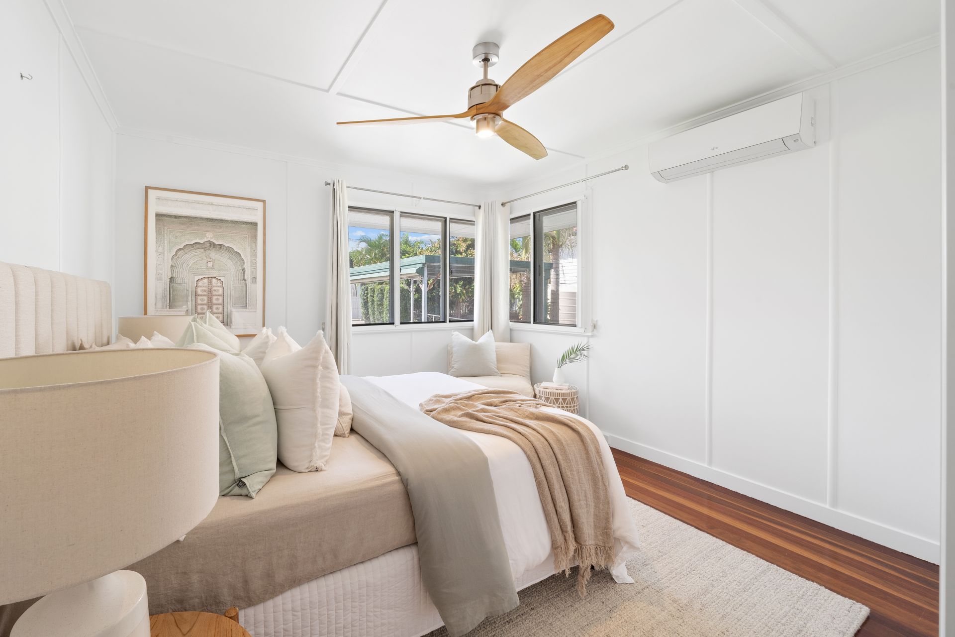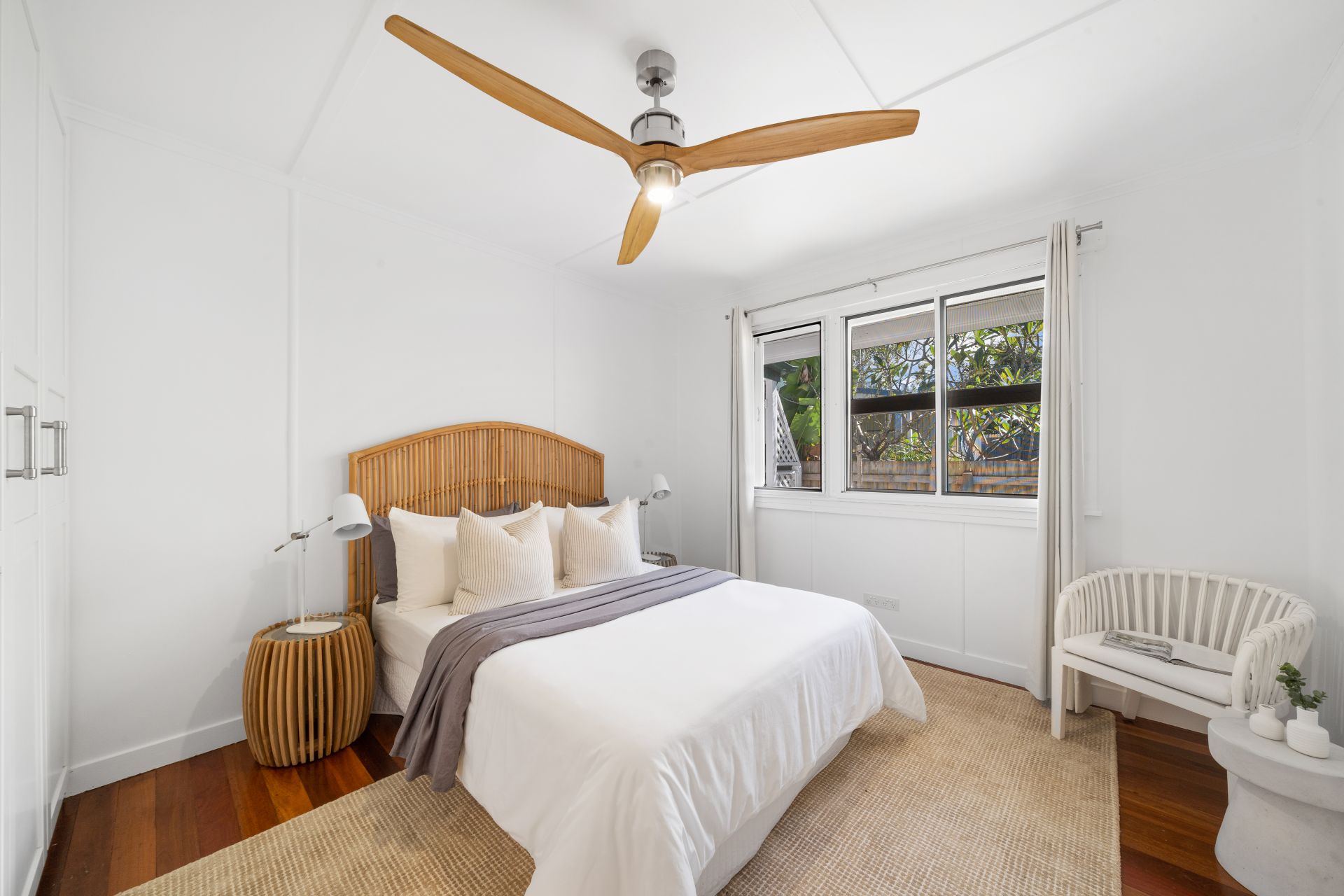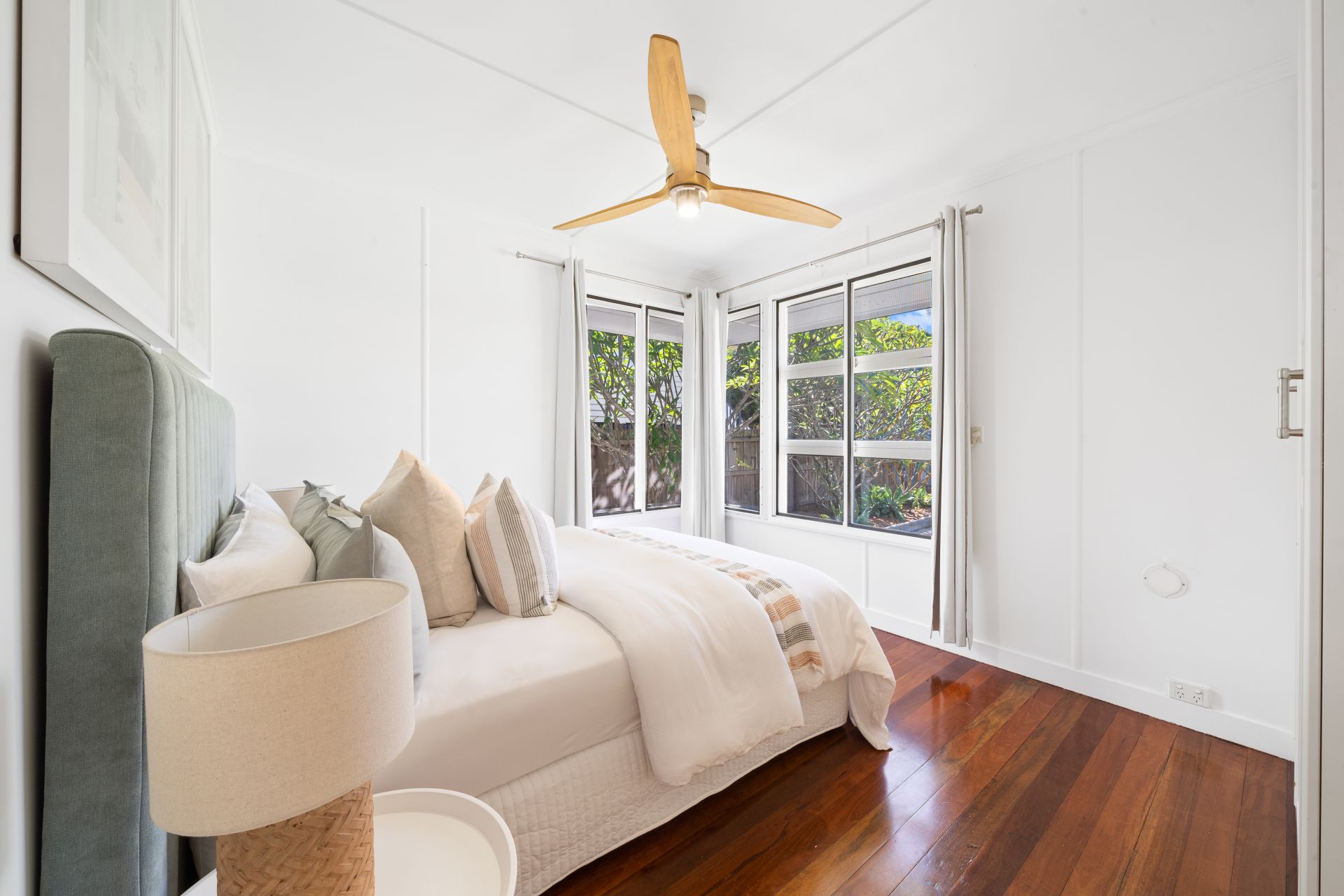 > Bedrooms 2 and 3 feature polished timber flooring, casement windows, security mesh, curtains, ceiling fan with light and built-in wardrobes.