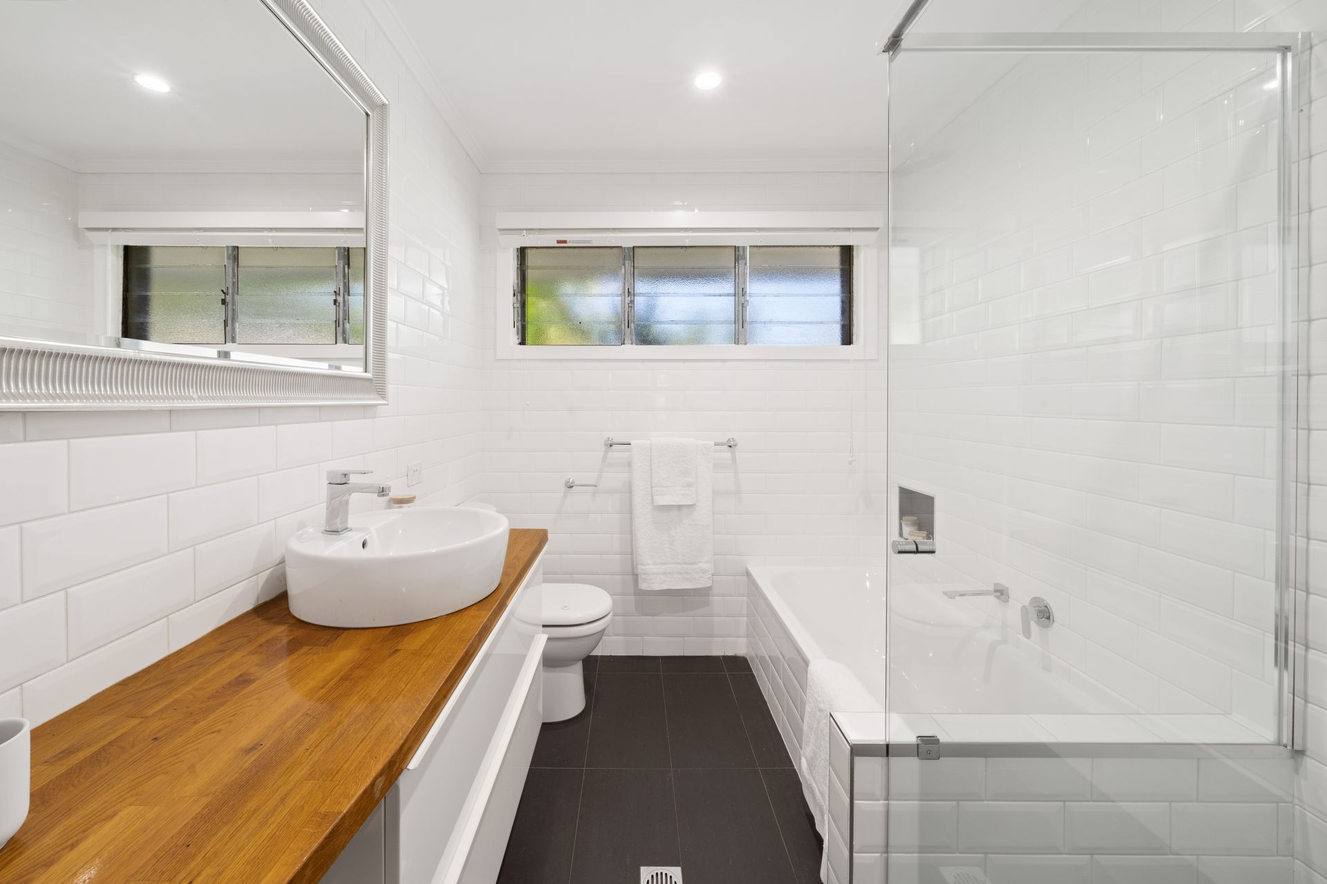 > The main bathroom features floor-to-ceiling tiles, walk-in shower with wall niche, raindrop showerhead, bath with wall niche, vessel vanity with timber countertop and soft-close drawers, large framed wall mirror, down-lighting, exhaust fan, frosted louver windows, venetian blinds and toilet.
