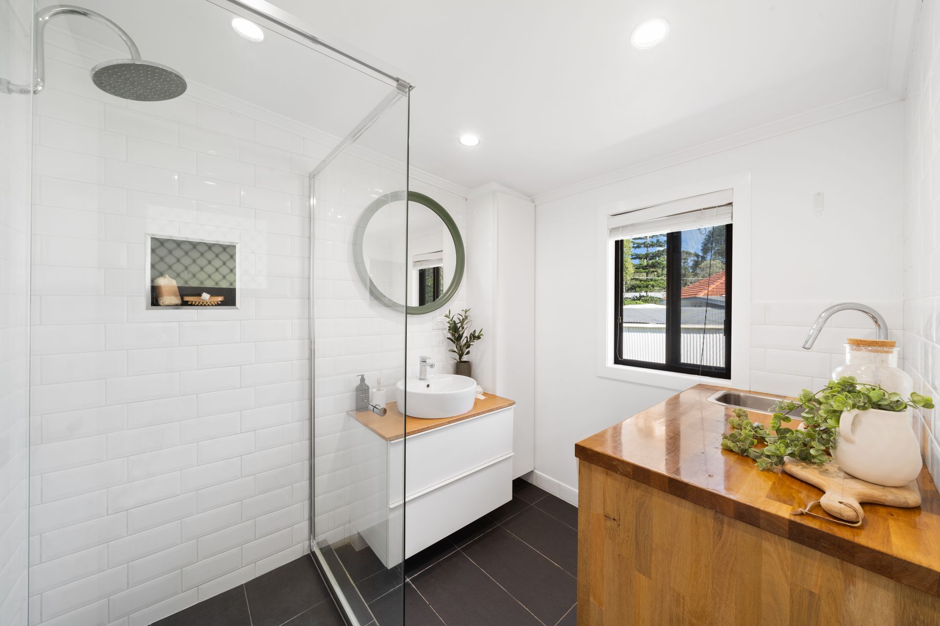 > The combined bathroom/laundry features floor-to-ceiling tiles, walk-in shower with wall niche, raindrop showerhead, vessel vanity with timber countertop and soft-close drawers, linen cupboard, custom cabinetry with laundry stainless-steel basin and timber countertop, down-lighting, sliding window with security mesh and venetian blinds.