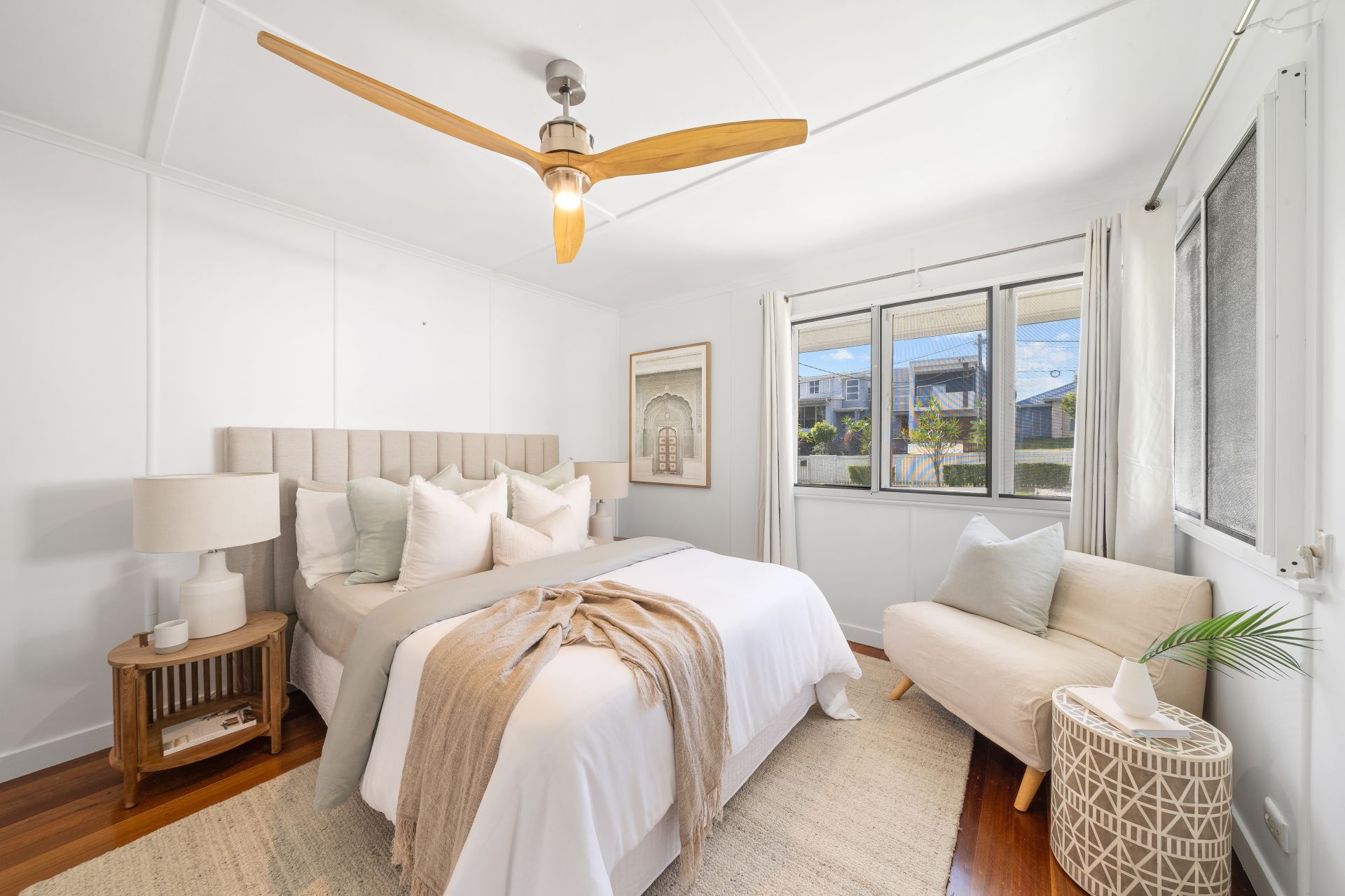 > The master boasts polished timber flooring, casement windows, security mesh, curtains, ceiling fan with light and built-in wardrobe.