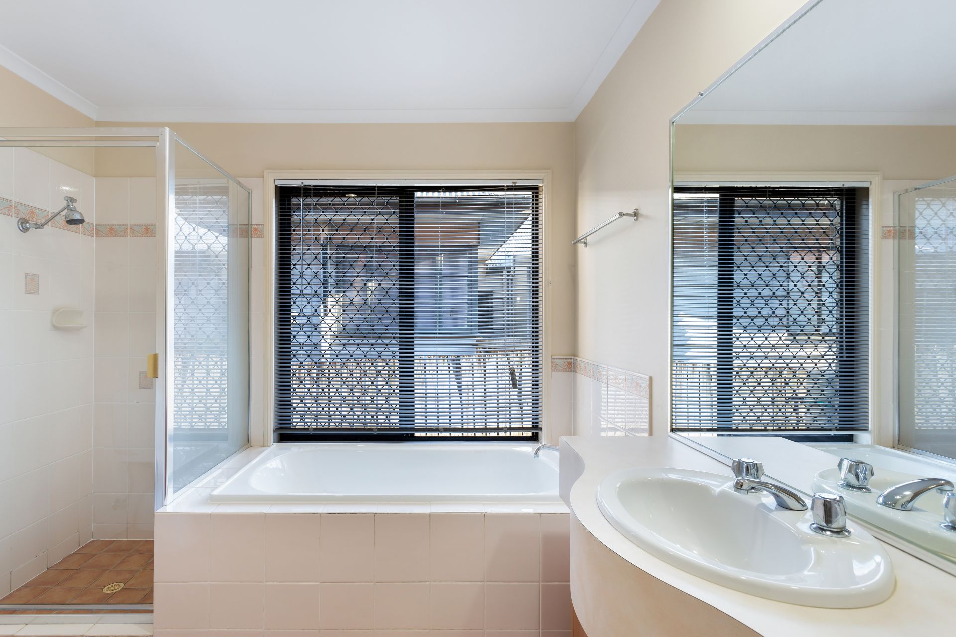 > The main bathroom is centrally located and features security screen, vanity with three doors, large mirror, venetian blinds, 2 x towel rails, large bath, separate shower cubical, combo exhaust fan/light and toilet