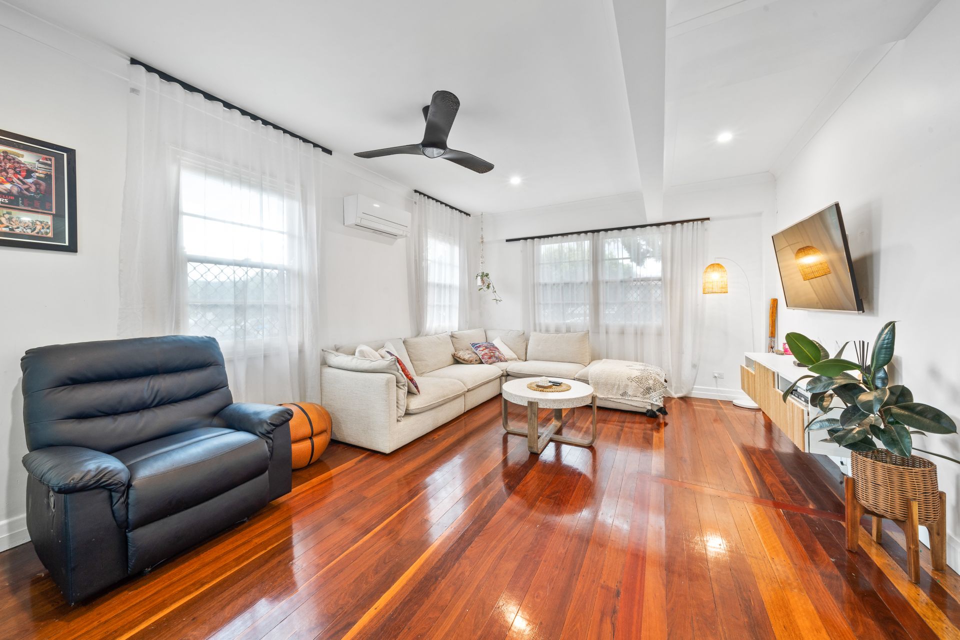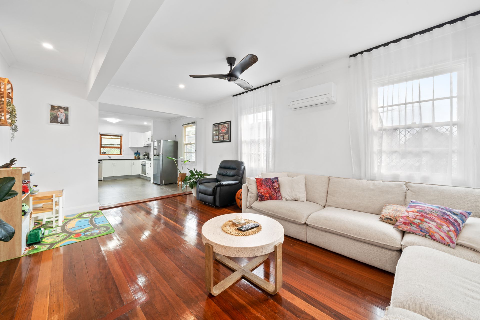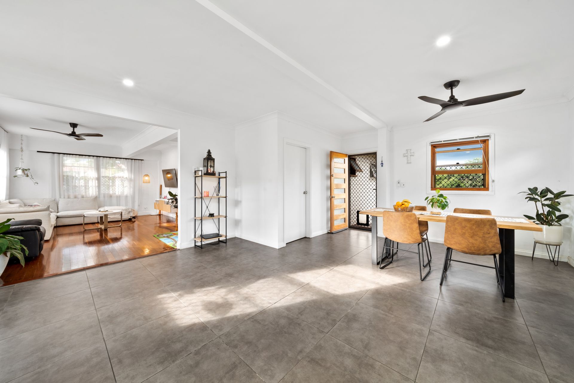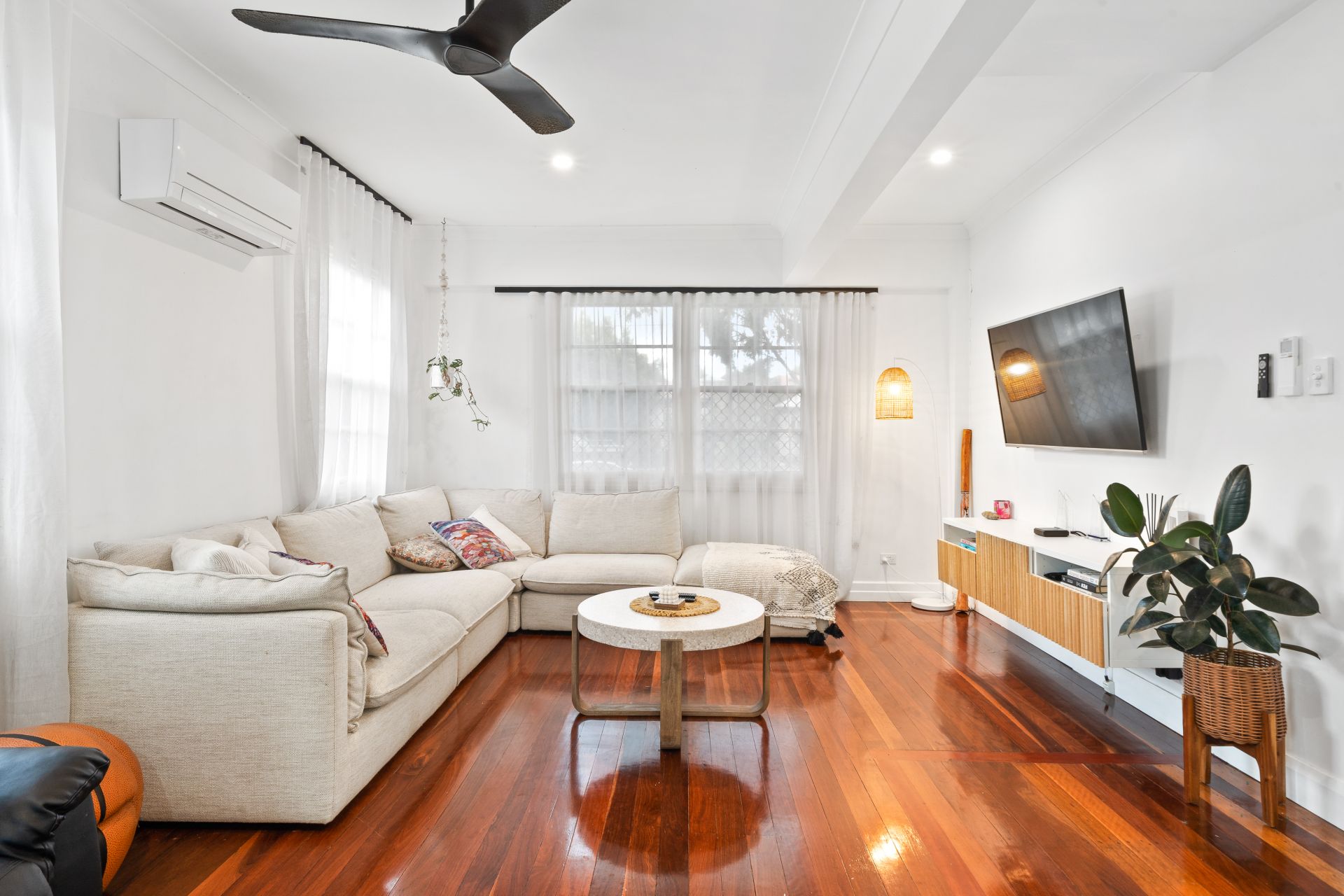> The living area flows effortlessly to the kitchen/dining and through to the rear alfresco deck. Featuring extra-high ceilings with ornate cornicing, combination of tiled and polished timber flooring, down-lighting, sash windows with security screens, curtains, custom floating wall unit and with access to the front porch a seamless flow of living space.