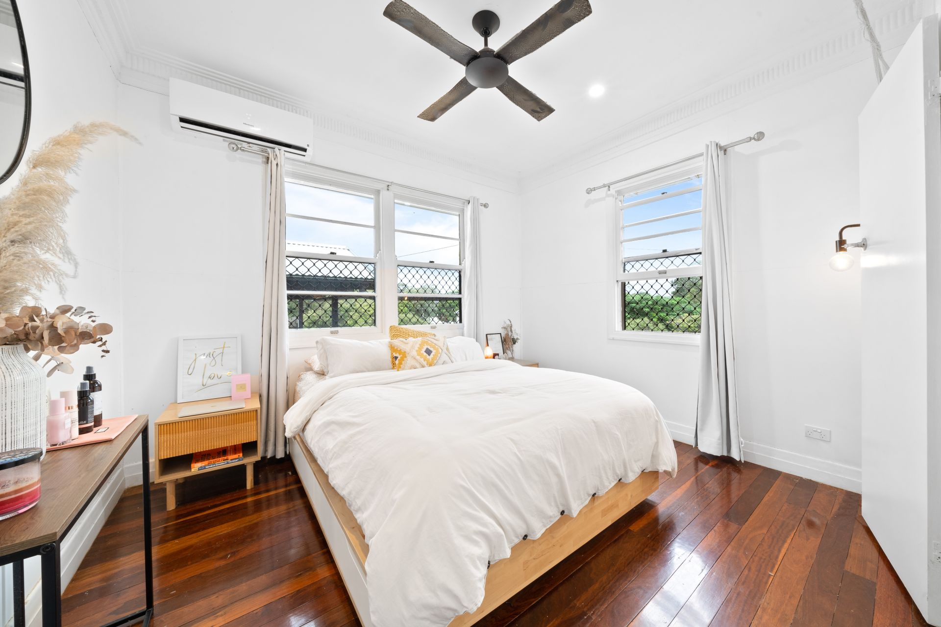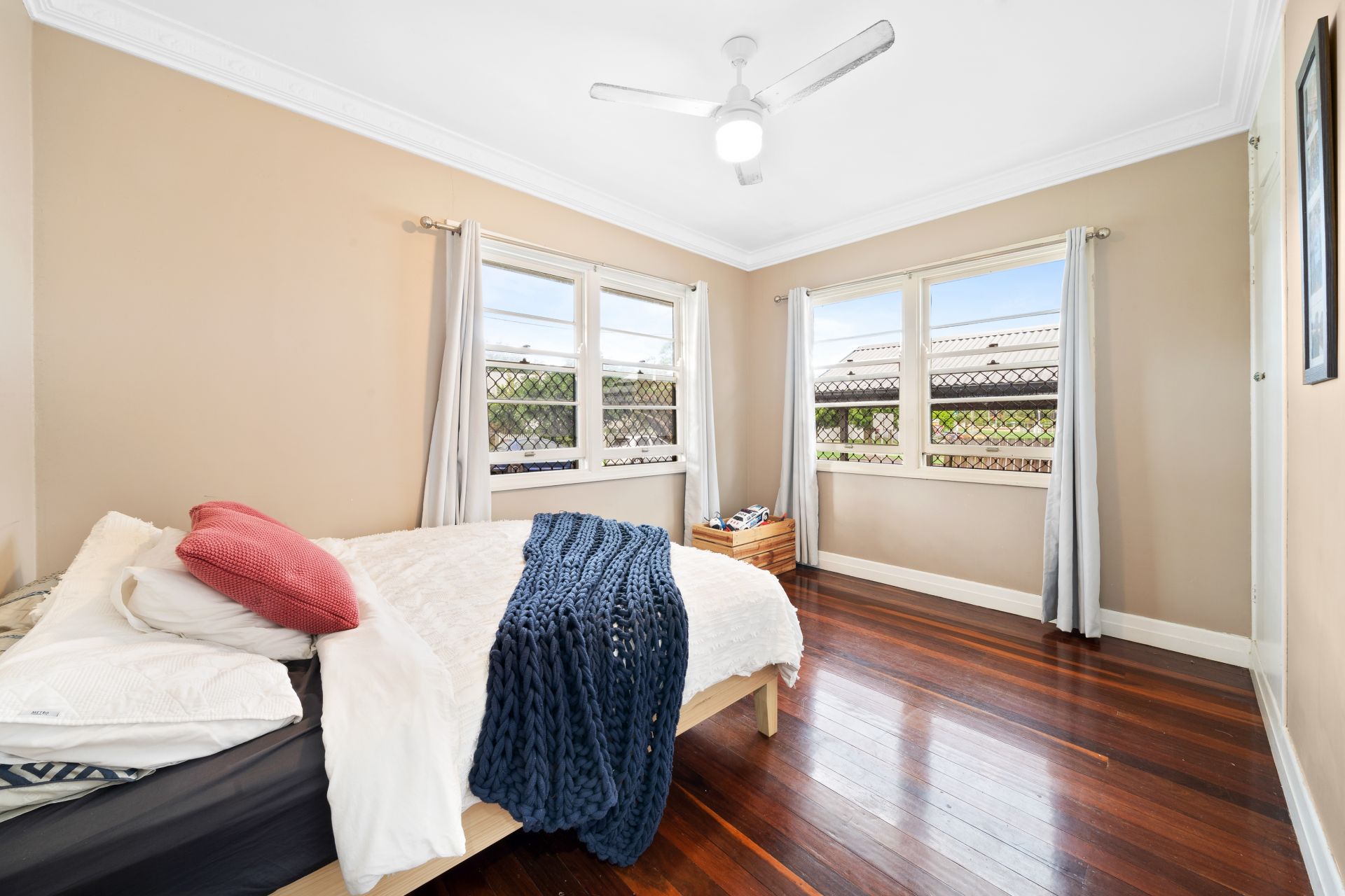 > Bedroom 2 features extra-high ceilings with ornate cornicing, rich timber flooring, built-in robe, ceiling fan, sash windows, security screens, and curtains.