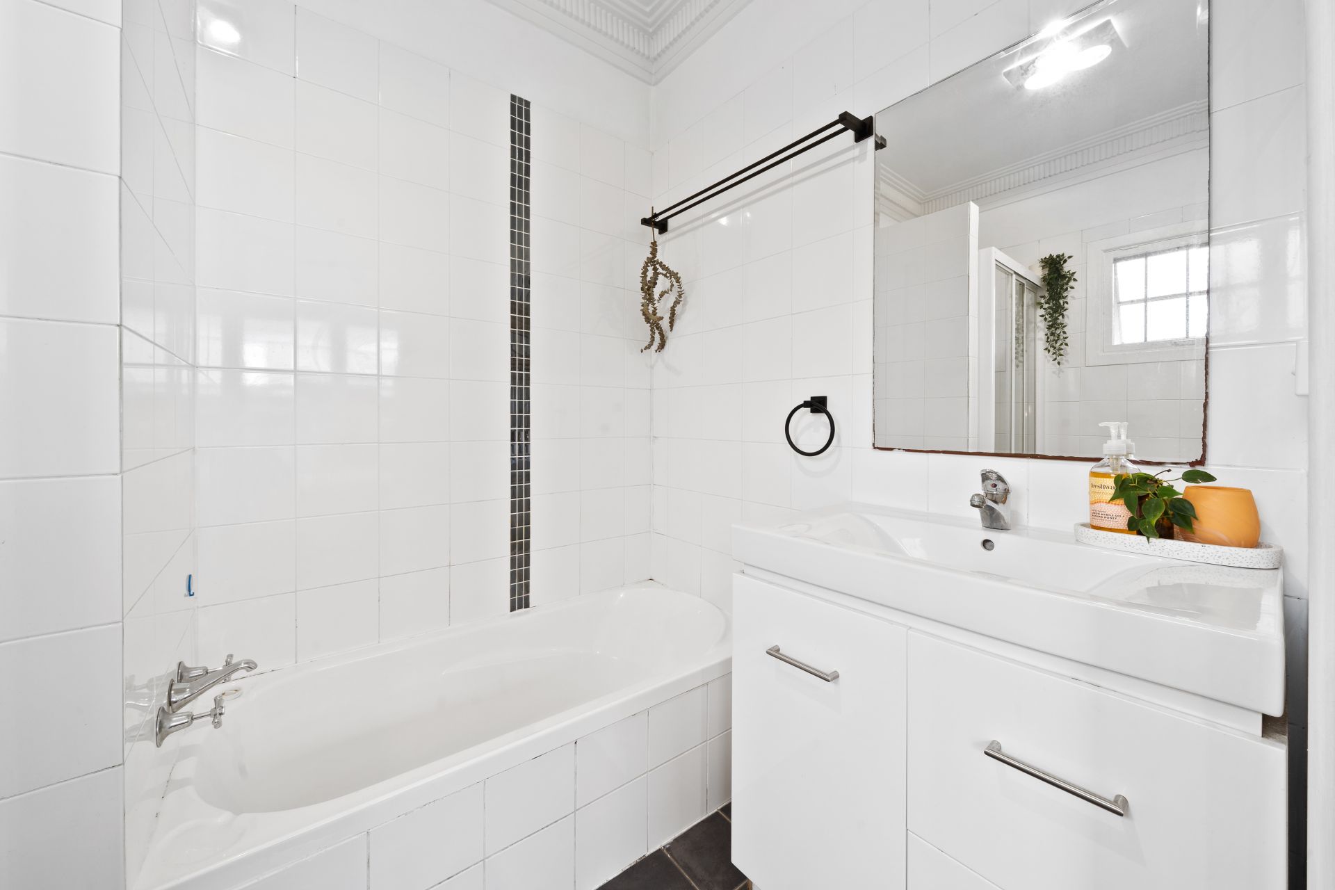 > The master ensuite features extra-high ceiling with ornate cornicing, shower, bath, single basin vanity with plenty of storage, wall mounted mirror, tile splashback, casement window with security bars, tile flooring, and toilet.