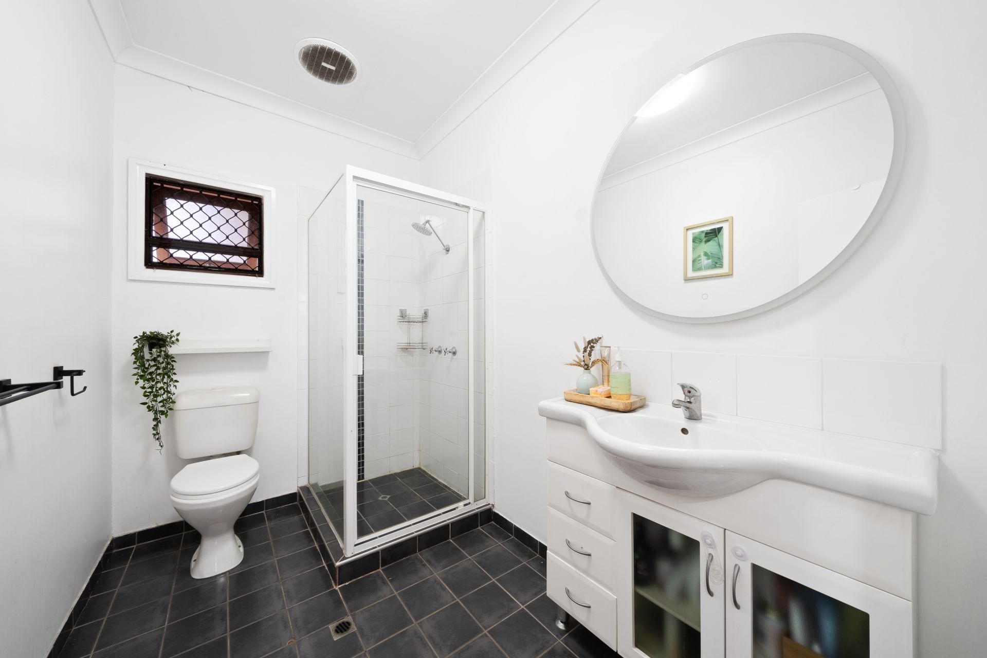 > The well-appointed main bathroom located in the heart of the home features an extra-high ceiling, shower, single basin vanity with plenty of storage, large frameless vanity mirror, towel rail, standard lighting, exhaust fan, casement window, security screens and toilet.