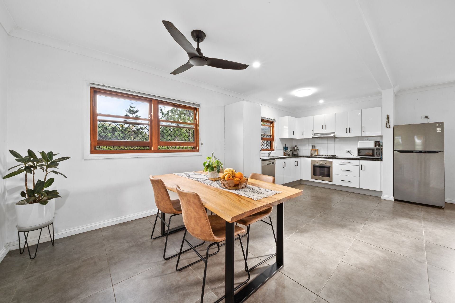 - Laundry located just off the kitchen features extra-high ceilings, tiled flooring, wash tub and extraction fan.