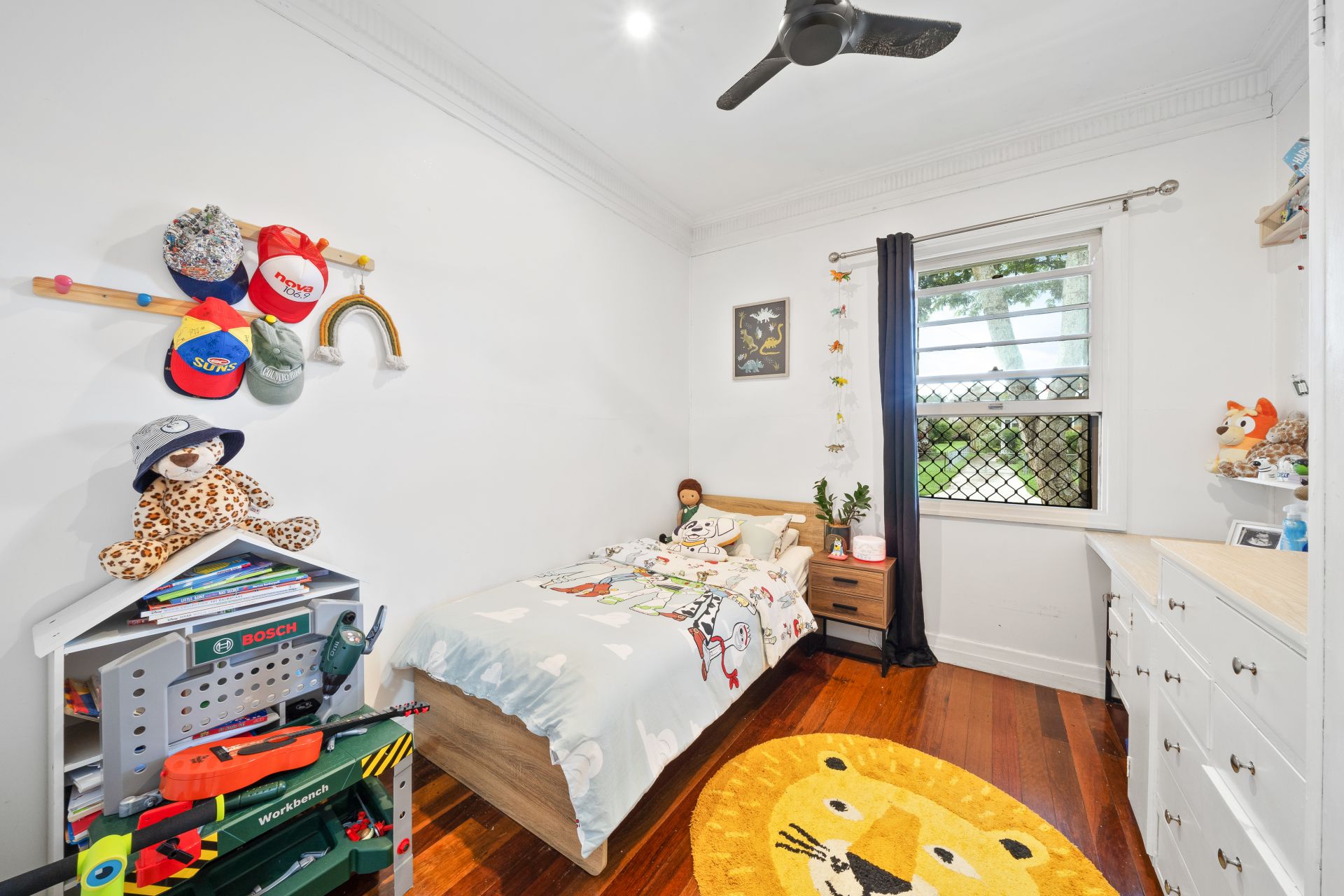 > Bedroom 3 features extra-high ceilings with ornate cornicing, rich timber flooring, built-in robe, built-in desk, ceiling fan, sash windows, security screens, and curtains.