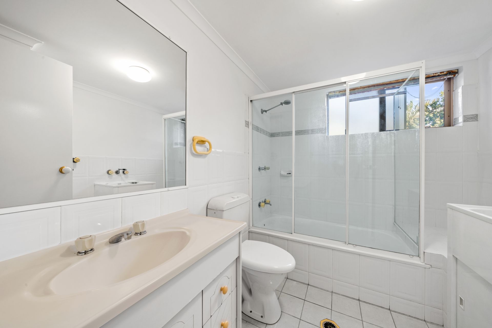 - Main bathroom features a shower over bath with glass shower screen, vanity with storage, window with mirror, security screen and compact laundry with tub.