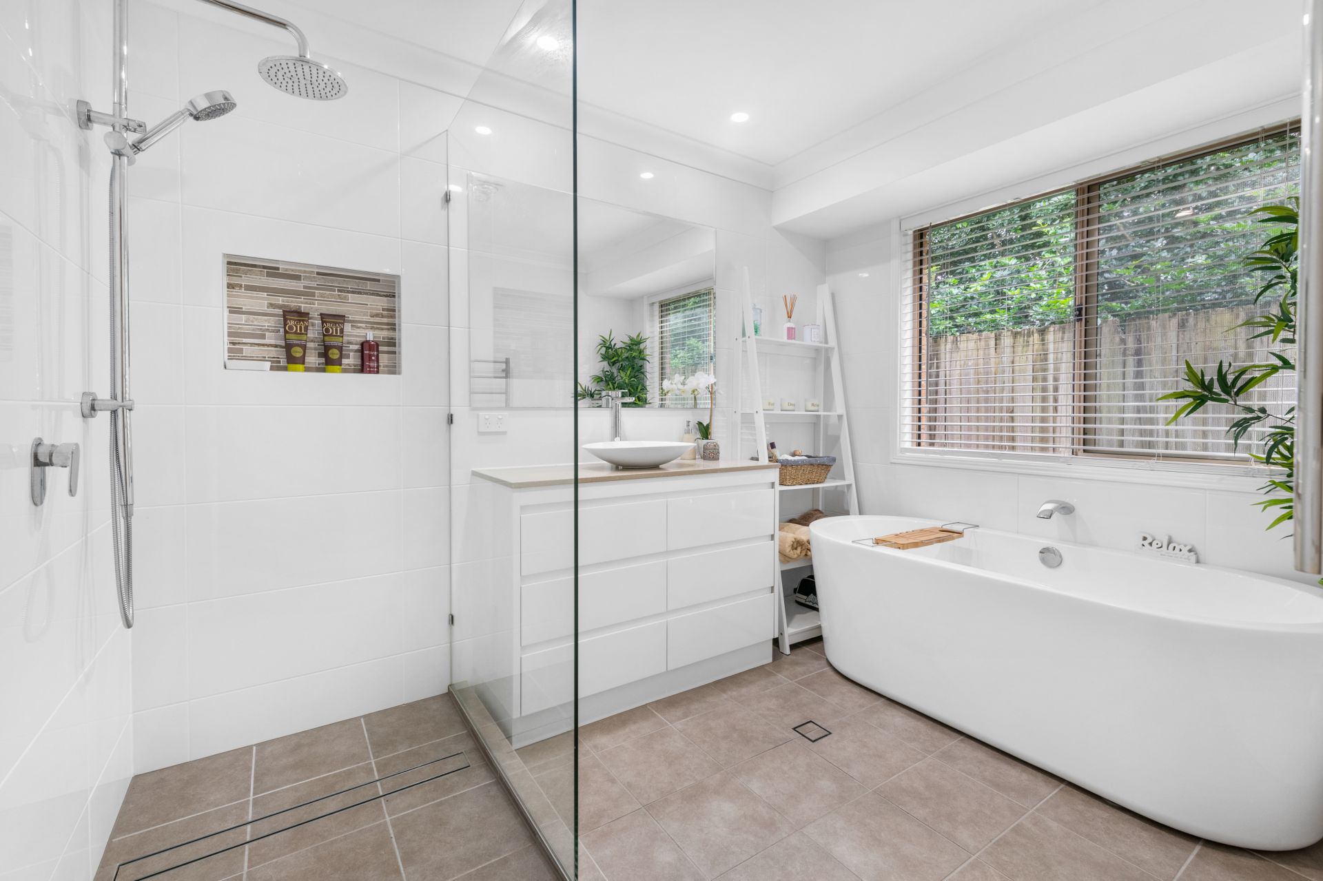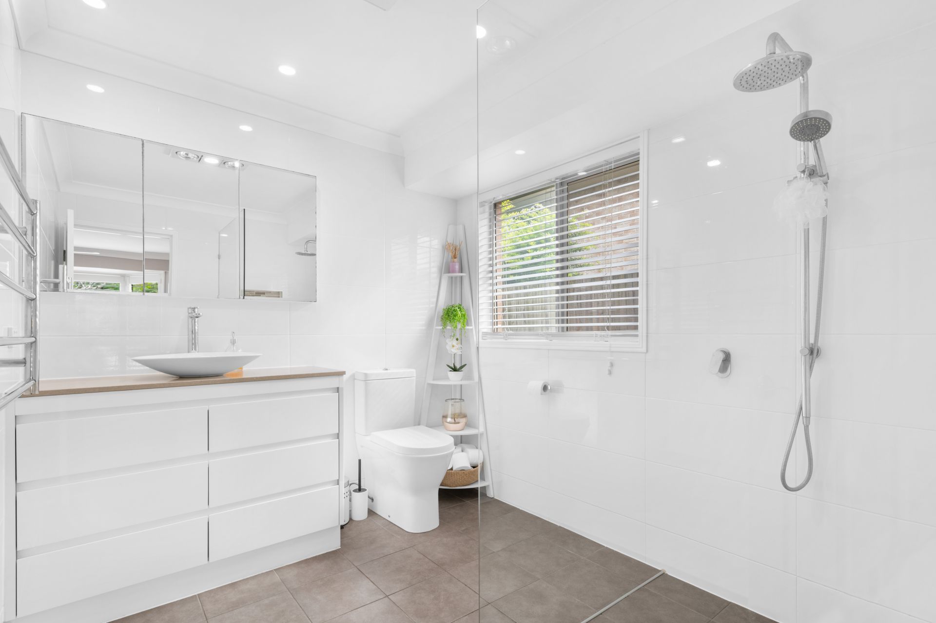 - Bathroom one is the home's beautifully renovated main bathroom featuring tiled flooring, walk-in shower with rainfall & detachable showerheads, deep-soaker bath, single vanity with stone benchtop and soft-close cabinetry, floor-to-ceiling tiles, towel rail and separate toilet.