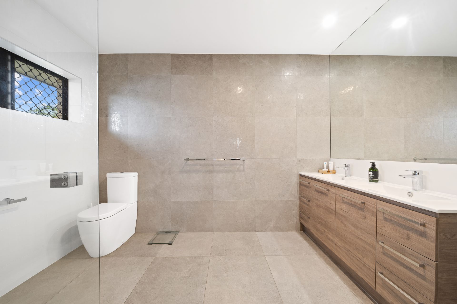 > The master ensuite features floor-to-ceiling tiles, shower with detachable showerhead, wall niches, dual basin vanity with plenty of storage, large frameless mirror, heat/light/extractor down-lighting, sliding window with security screen, towel rail and toilet.