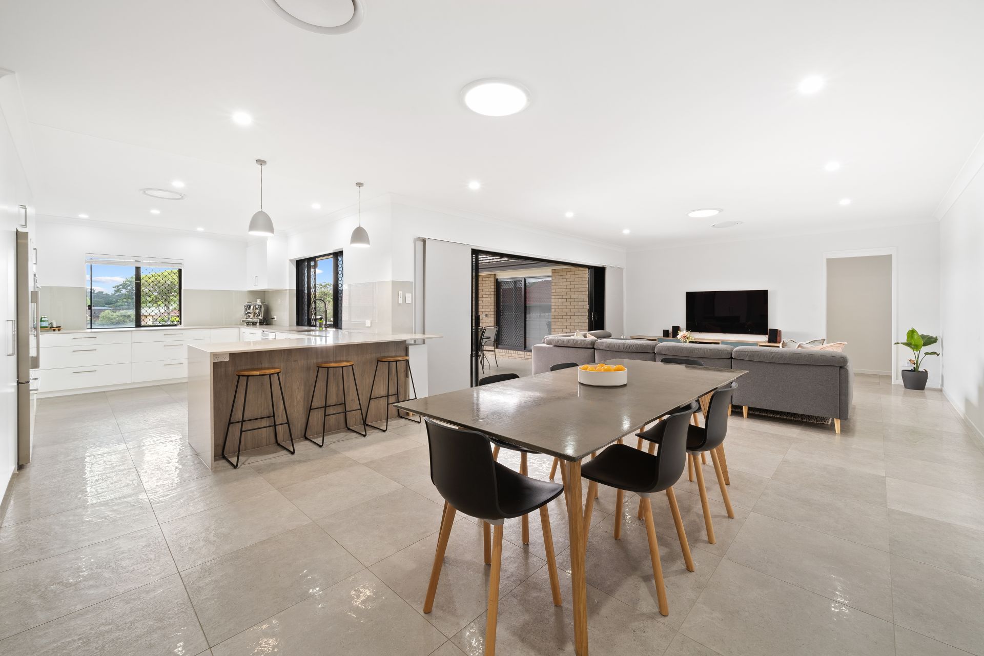 > The open plan lounge/dining areas located at the heart of the home flow effortlessly from the kitchen and through to the outdoor entertaining areas. The light and contemporary colour scheme adds to the expansive nature of the home, featuring extra-high ceilings, ducted air-conditioning, tiled flooring, down-lighting, skylights, extra-wide vertical blinds, custom cabinetry and large glass sliding doors giving you access to the outdoor entertaining.