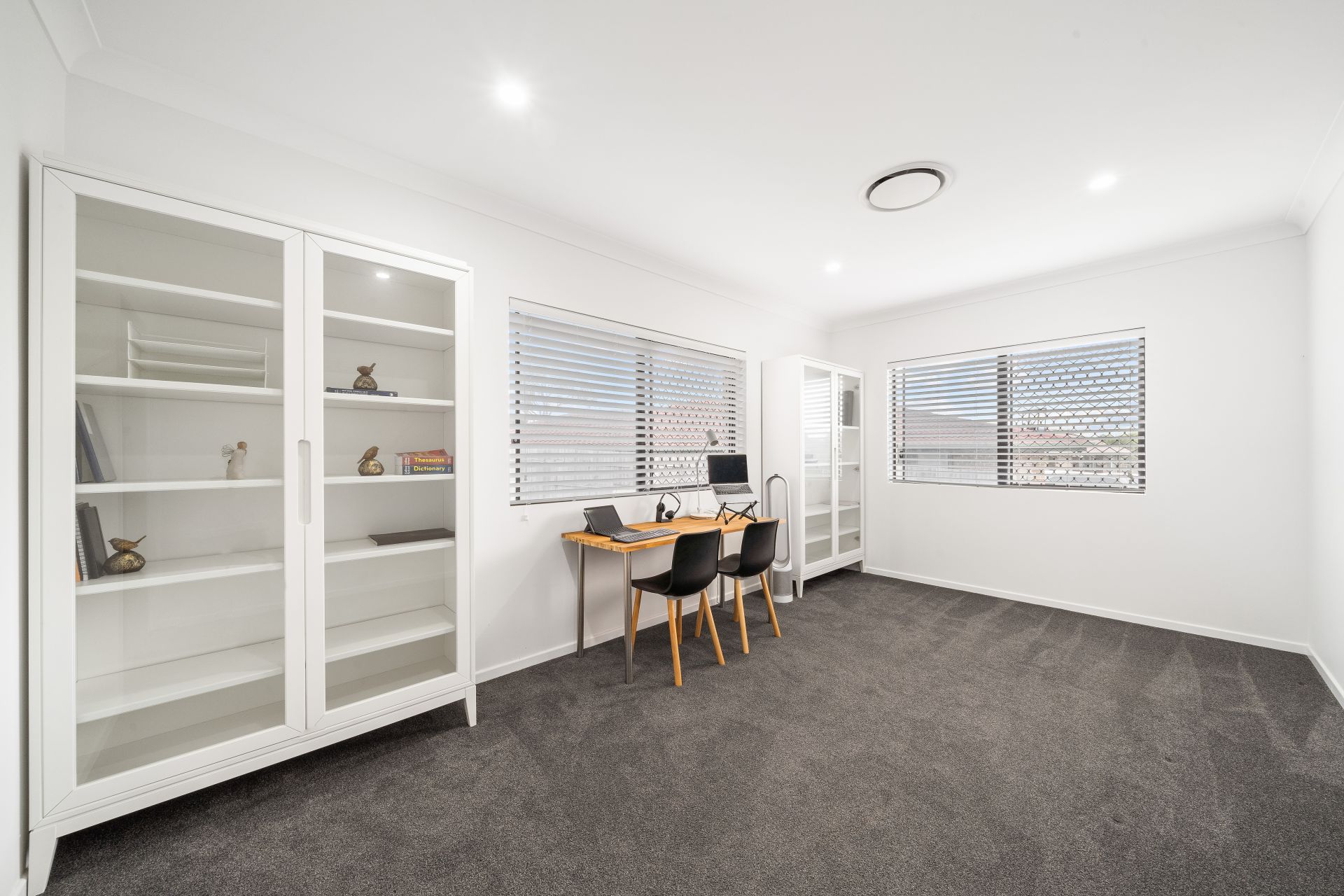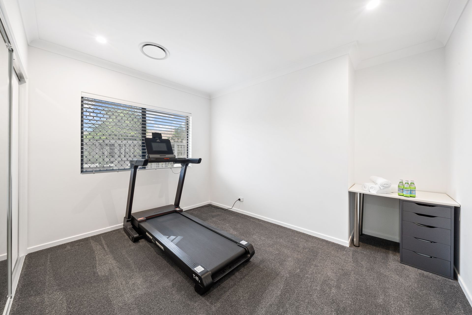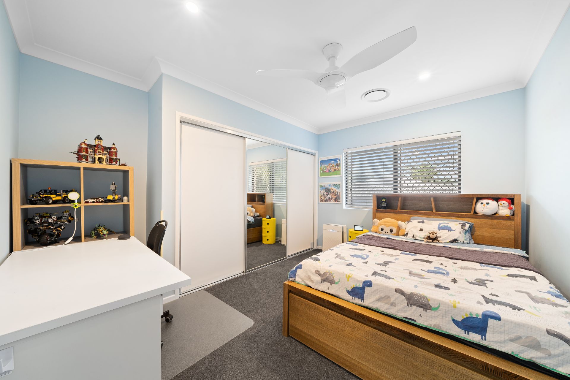 > Bedroom 5 enjoys extra-high ceiling, ducted air-conditioning, carpet flooring, down-lighting, sliding windows with security screens, venetian blinds and built-in robe.