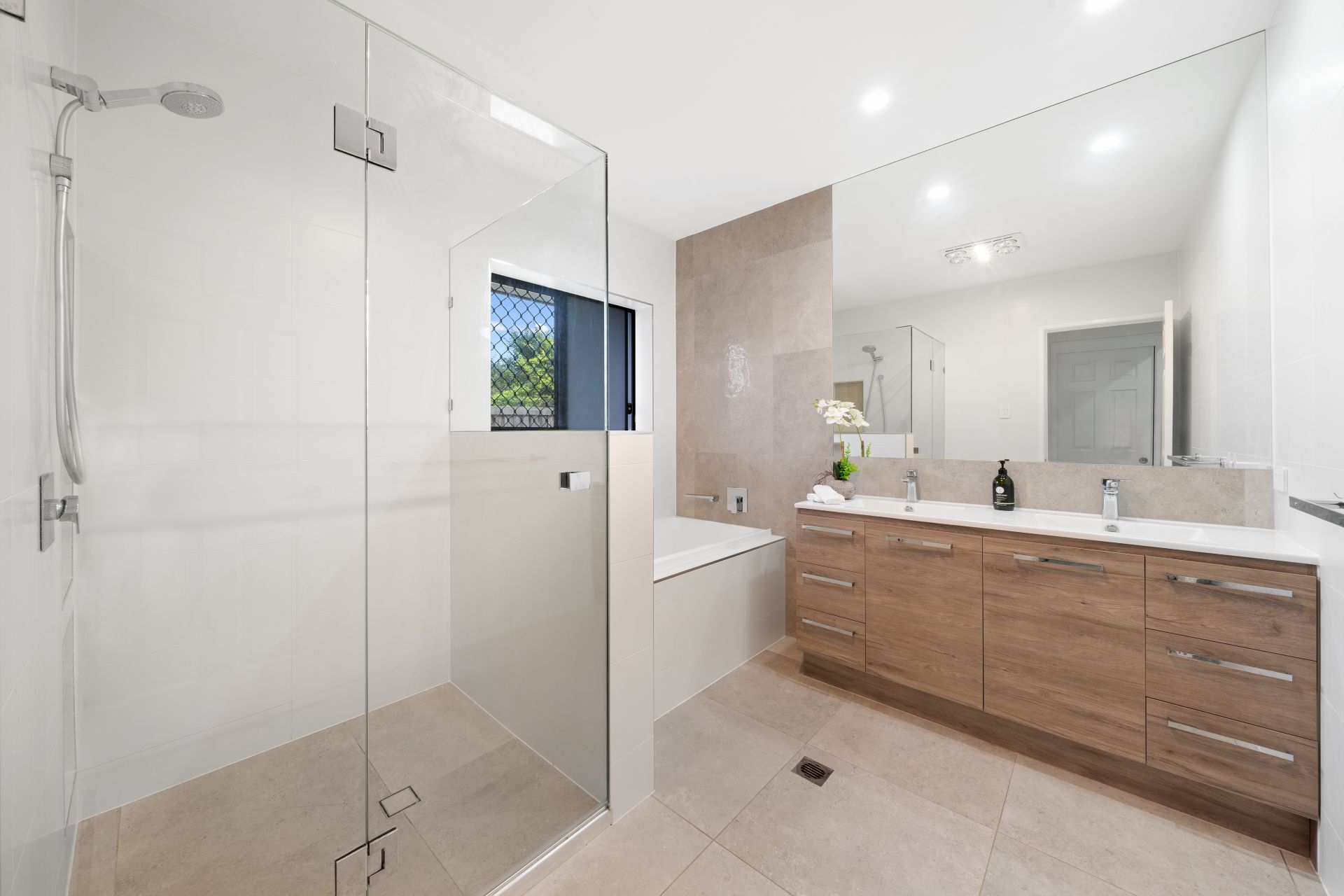 > The main bathroom located off the bedroom wing of the property features floor-to-ceiling tiles, shower with detachable showerhead, wall niches, bath, dual basin vanity with plenty of storage, large frameless mirror, heat/light/extractor down-lighting, sliding window with security screen, towel rail and separate toilet.