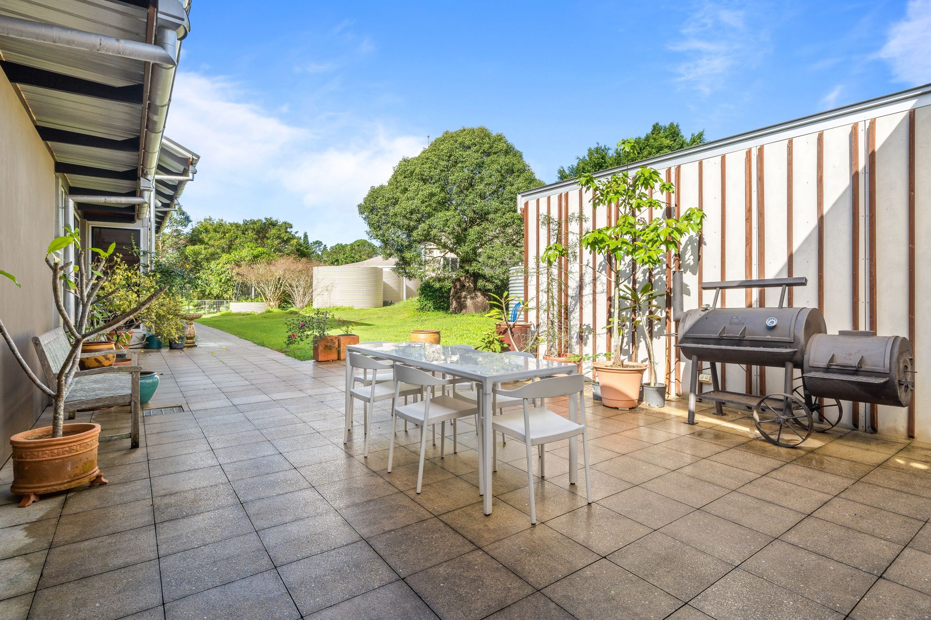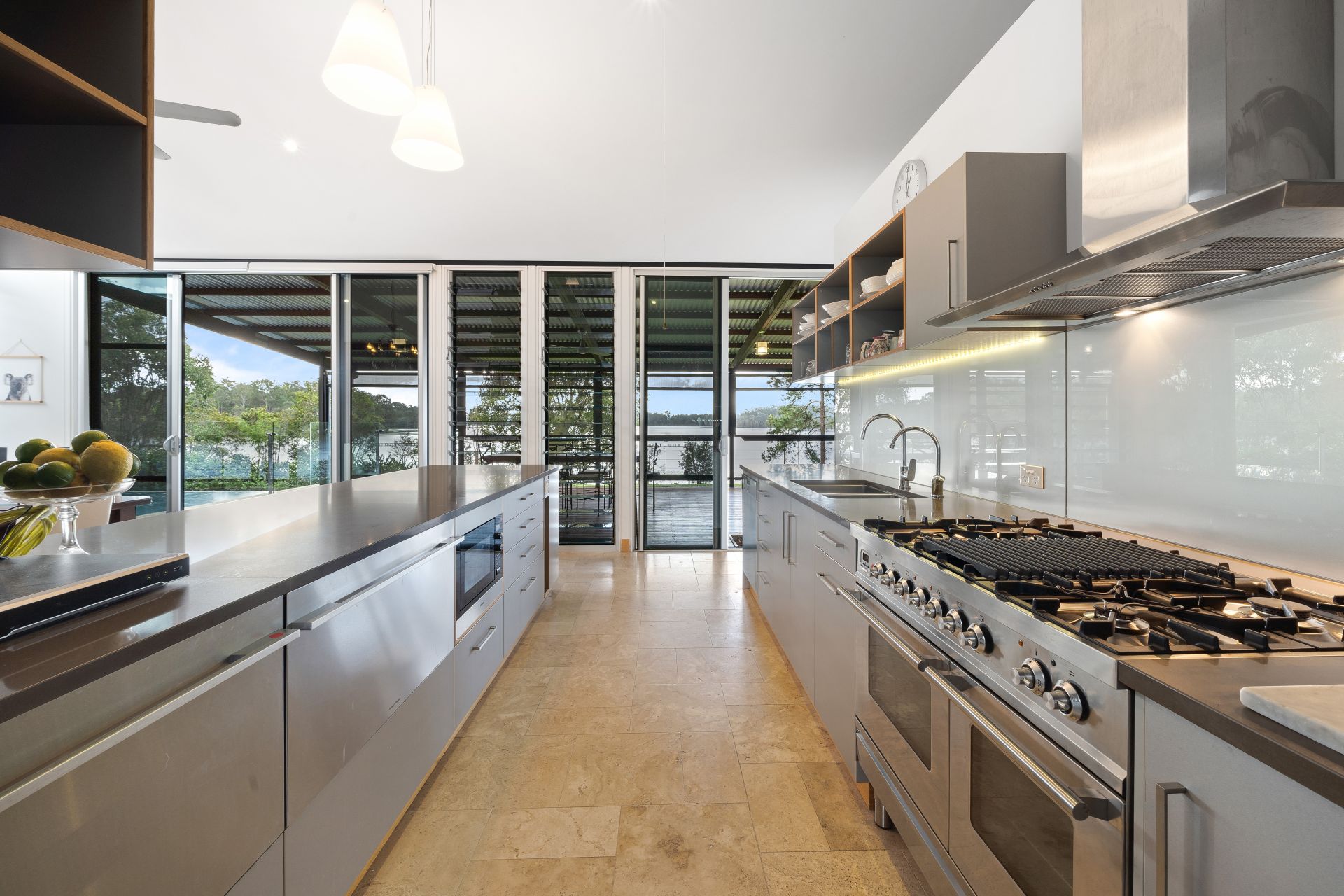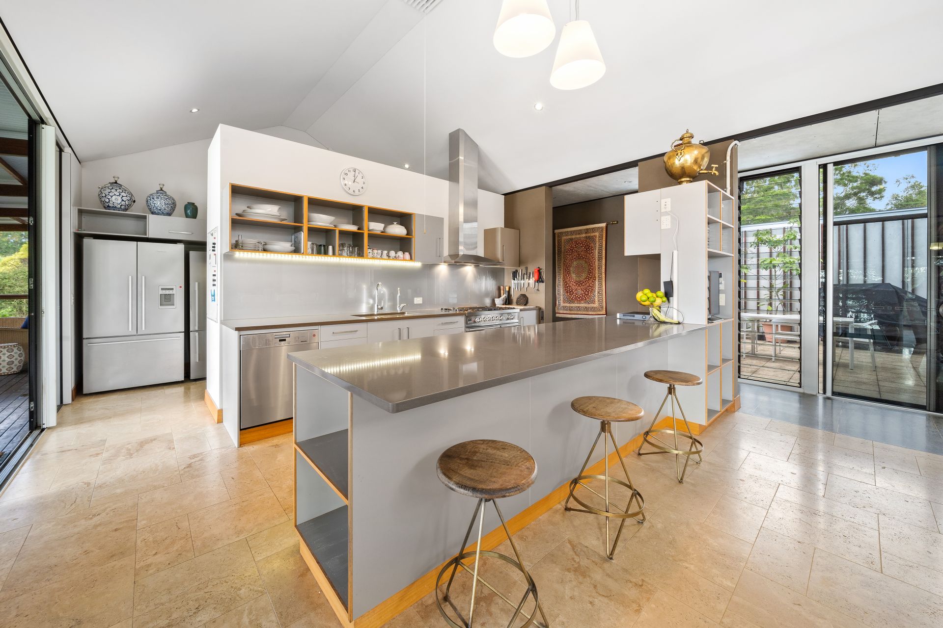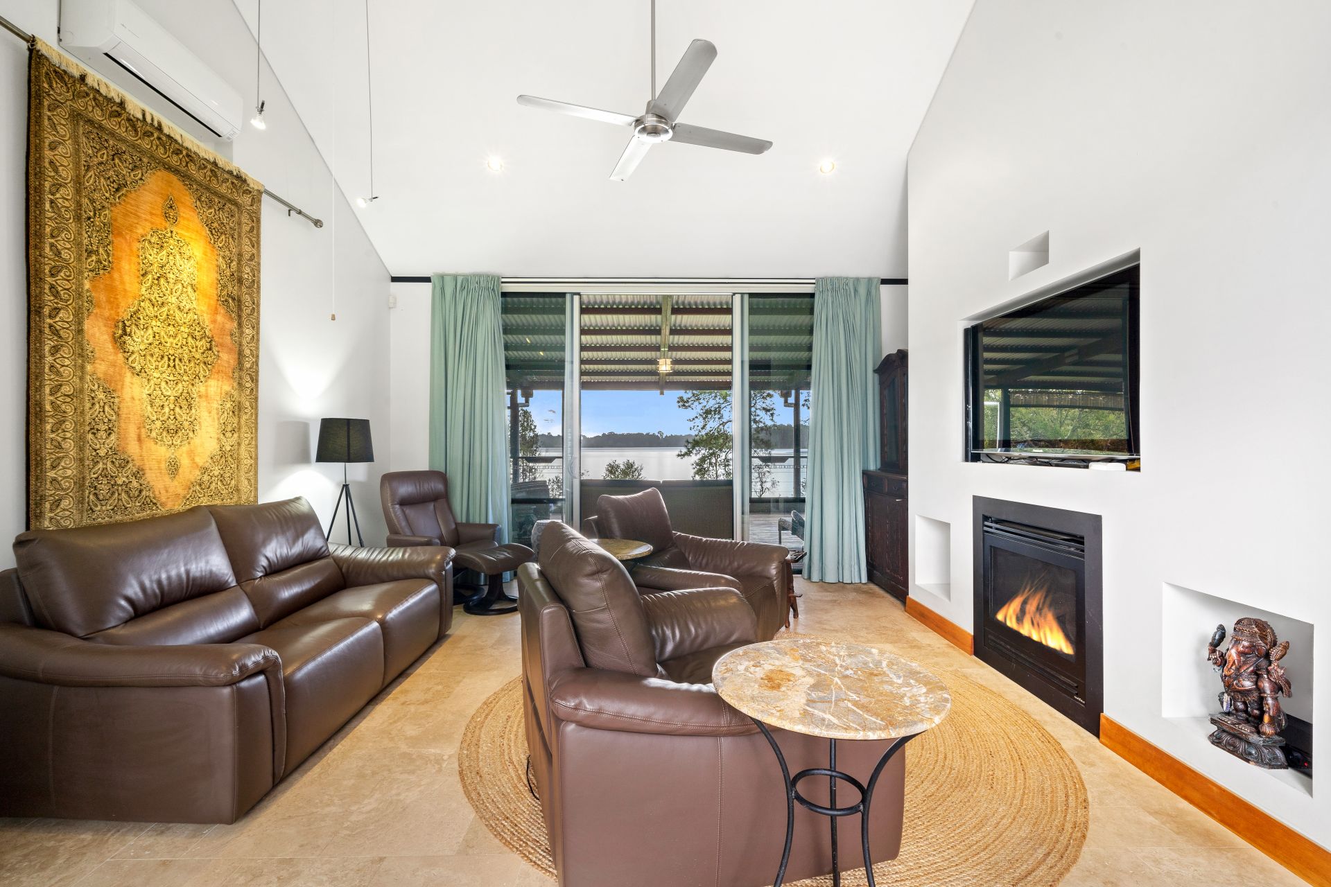 - The main living and dining areas flow effortlessly to the kitchen and through to the North & South facing outdoor entertaining. The light & contemporary colour scheme adds to the expansive nature of the home, boasting a combination of polished concrete & travertine flooring, Jet-Master fireplace, raked ceilings, air-conditioning, ceiling fan, down & gallery lighting, whirly bird, combination of roller blinds & curtains, louver windows, quad bank of large sliding glass & security mesh throughout.