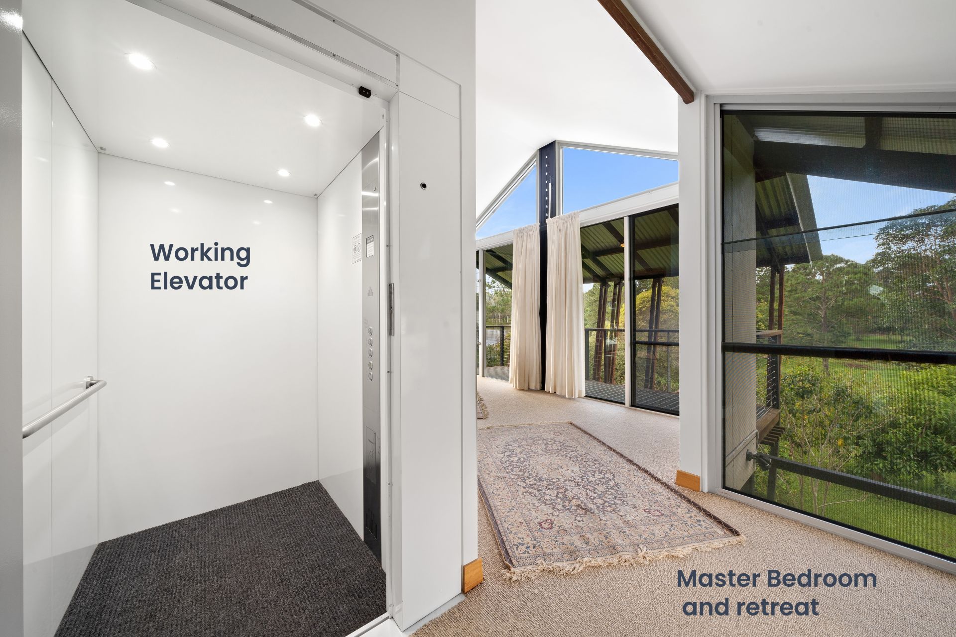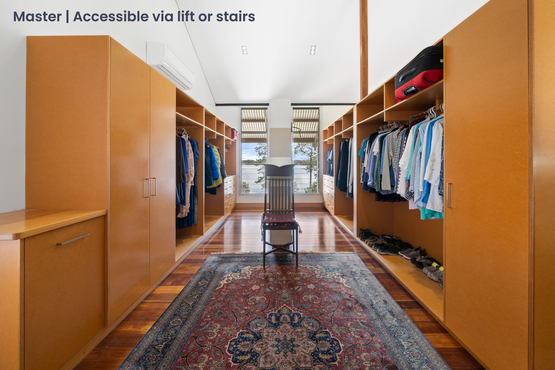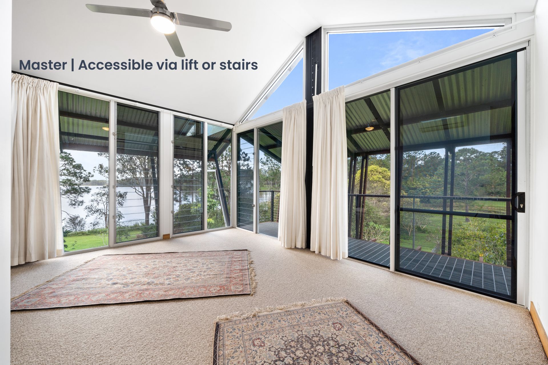 - The palatial master suite is located on its own level boasting panoramic views of Lake Kurwongbah. Featuring a hydraulic elevator, gargantuan walk-in closet, chic ensuite, master retreat, raked ceiling, whirly birds, air-conditioning, combination of carpet & rich timber flooring, sash & louver windows, & large glass sliding doors giving you access to the dual private balconies.