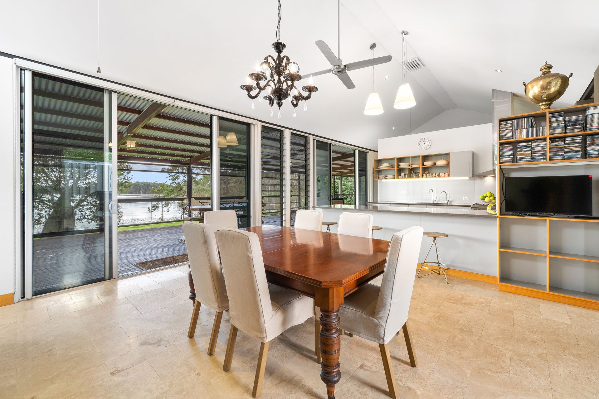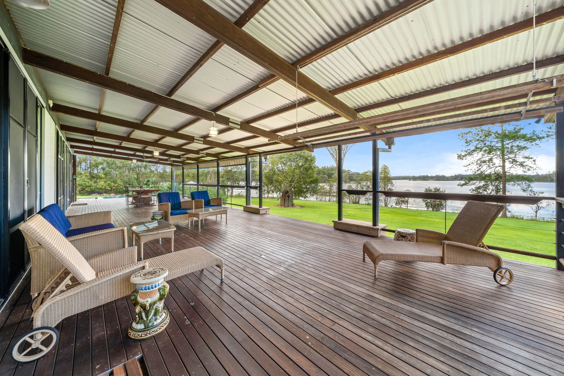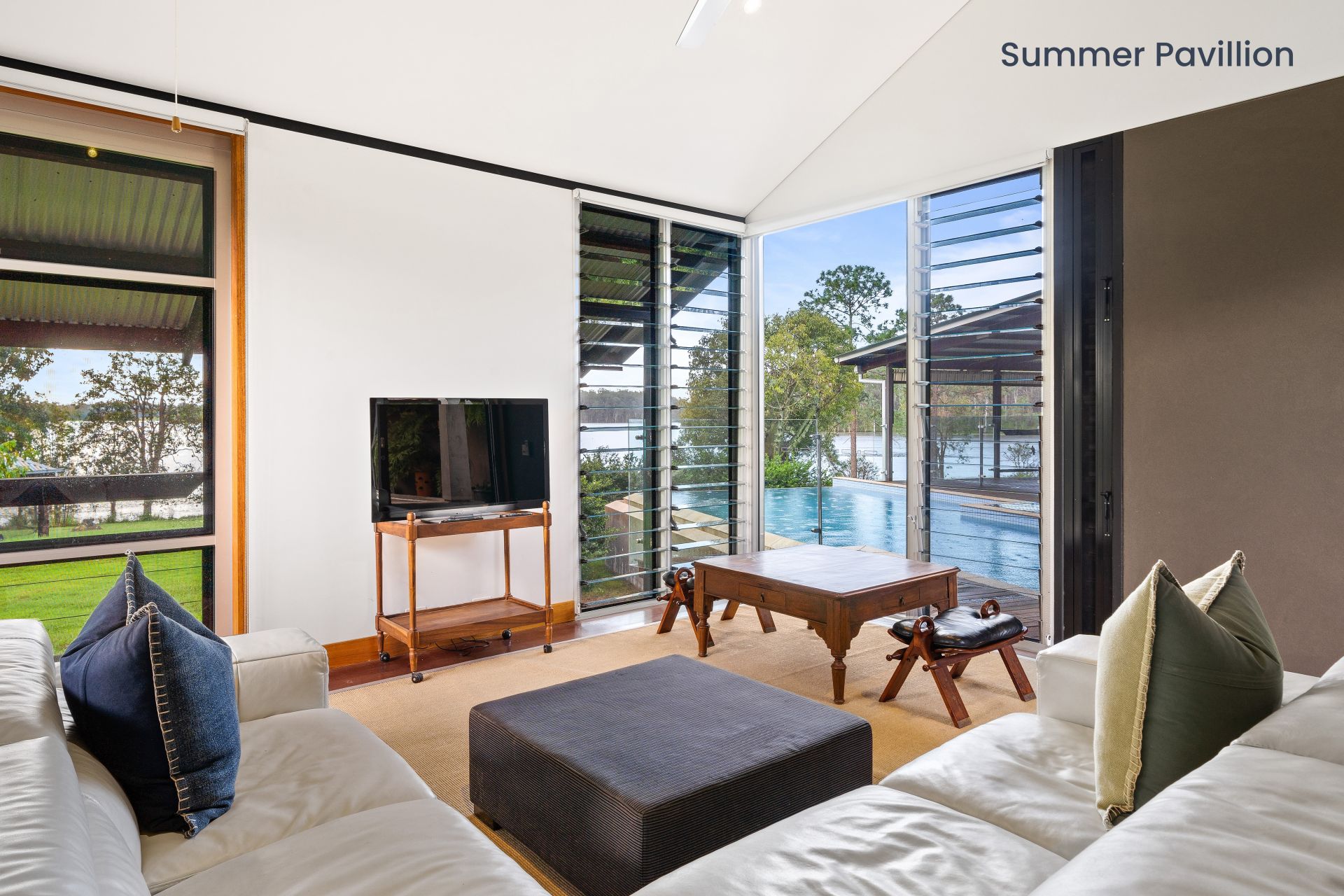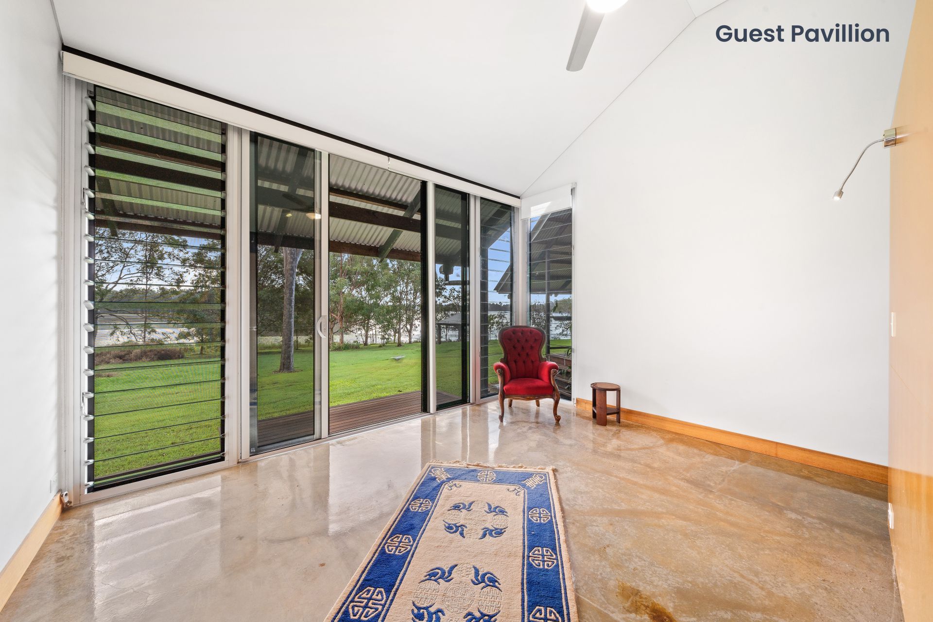 - The second living room boasts views of the lake, raked ceilings, down-lighting, ceiling fan, whirly bird, air-conditioning, sealed concrete flooring, combination of louver windows & large glass sliding doors with security mesh giving you access to the outdoor entertaining area.