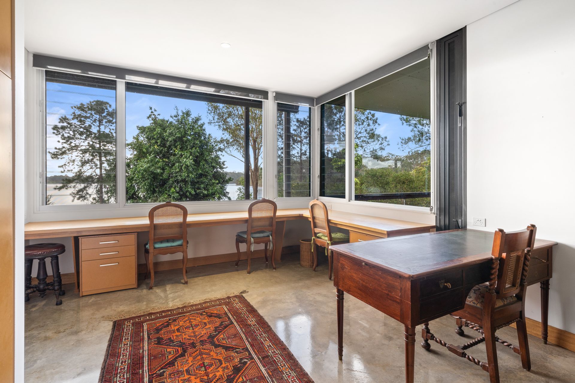 > Bedrooms 3 & 4 feature polished concrete flooring, raked ceilings, whirly birds, down-lighting, custom robes, roller blinds & louver windows with security mesh.
