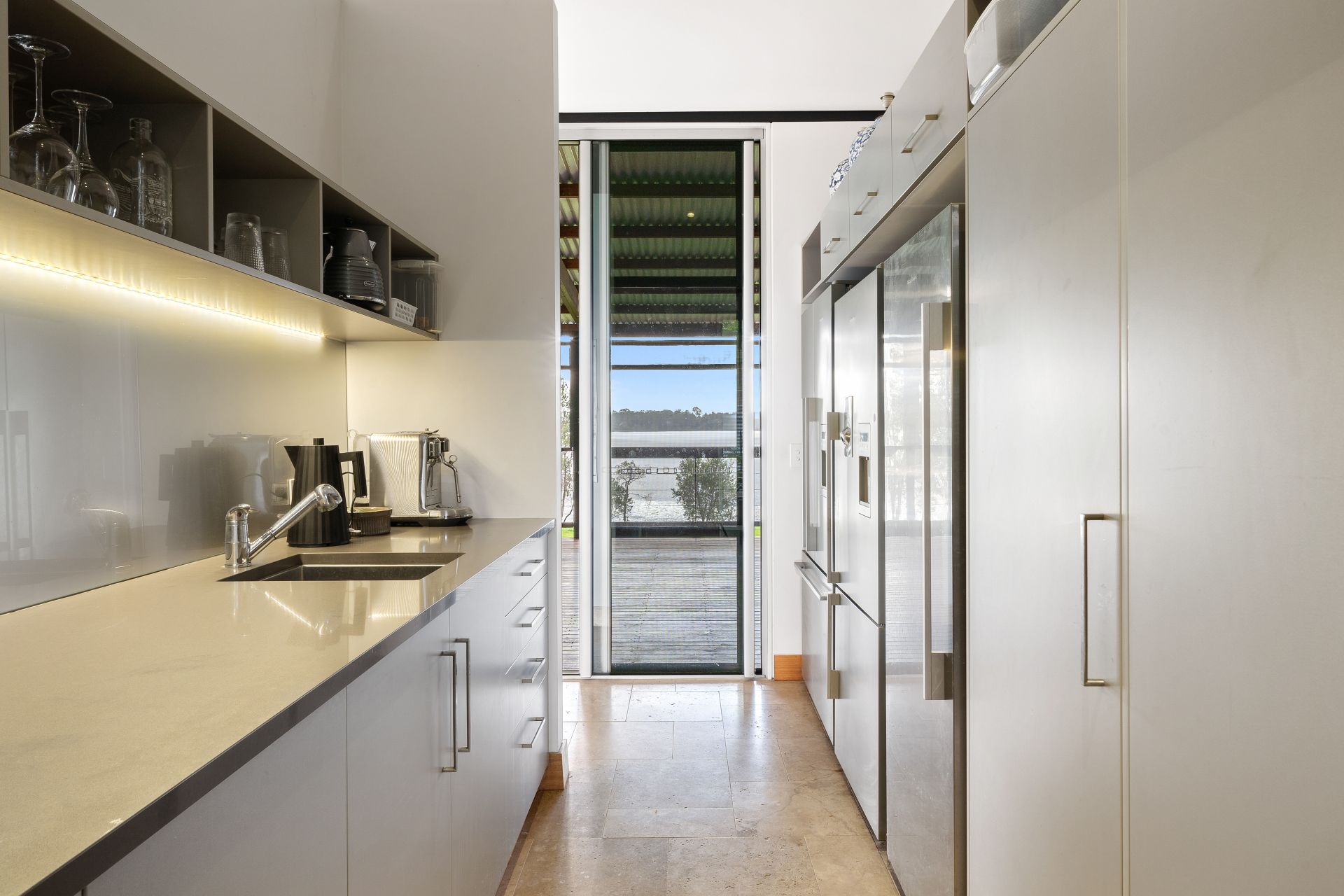 - Located off the bedrooms is the European kitchenette featuring custom cabinetry with single basin, glass splashback, louver windows with security mesh, custom under window day beds.
