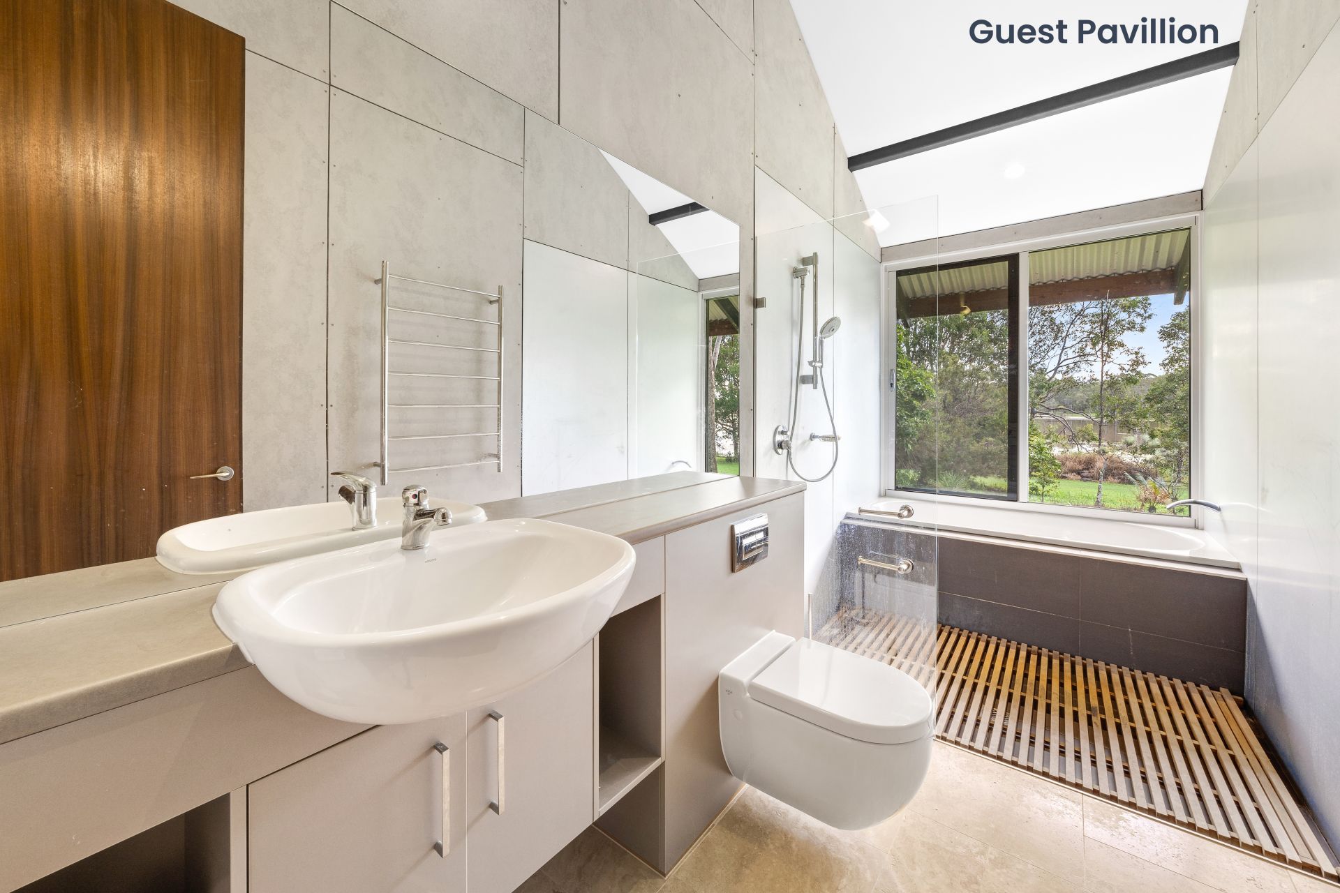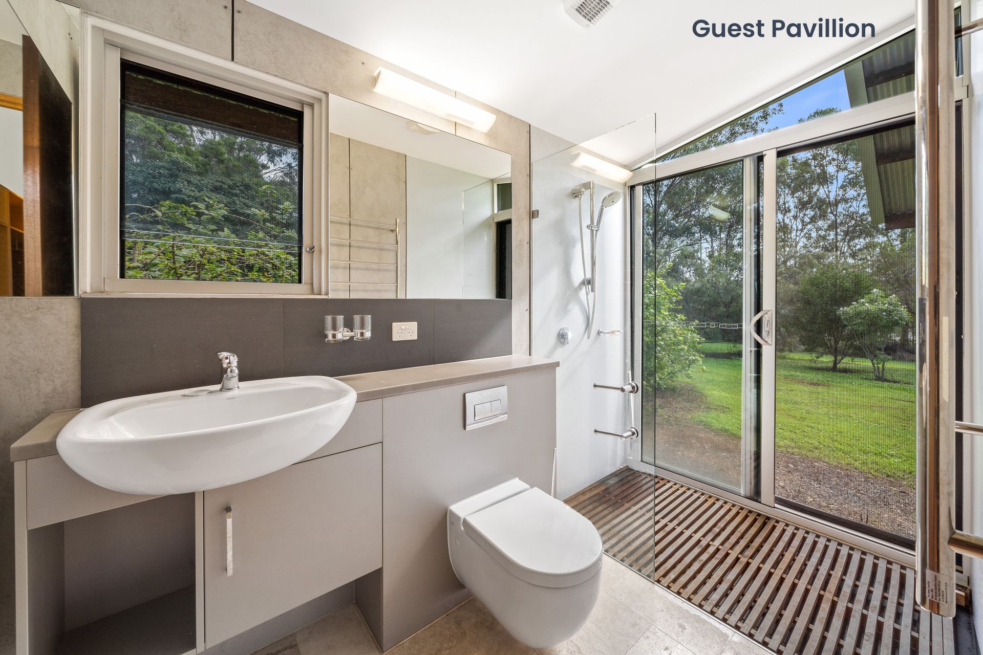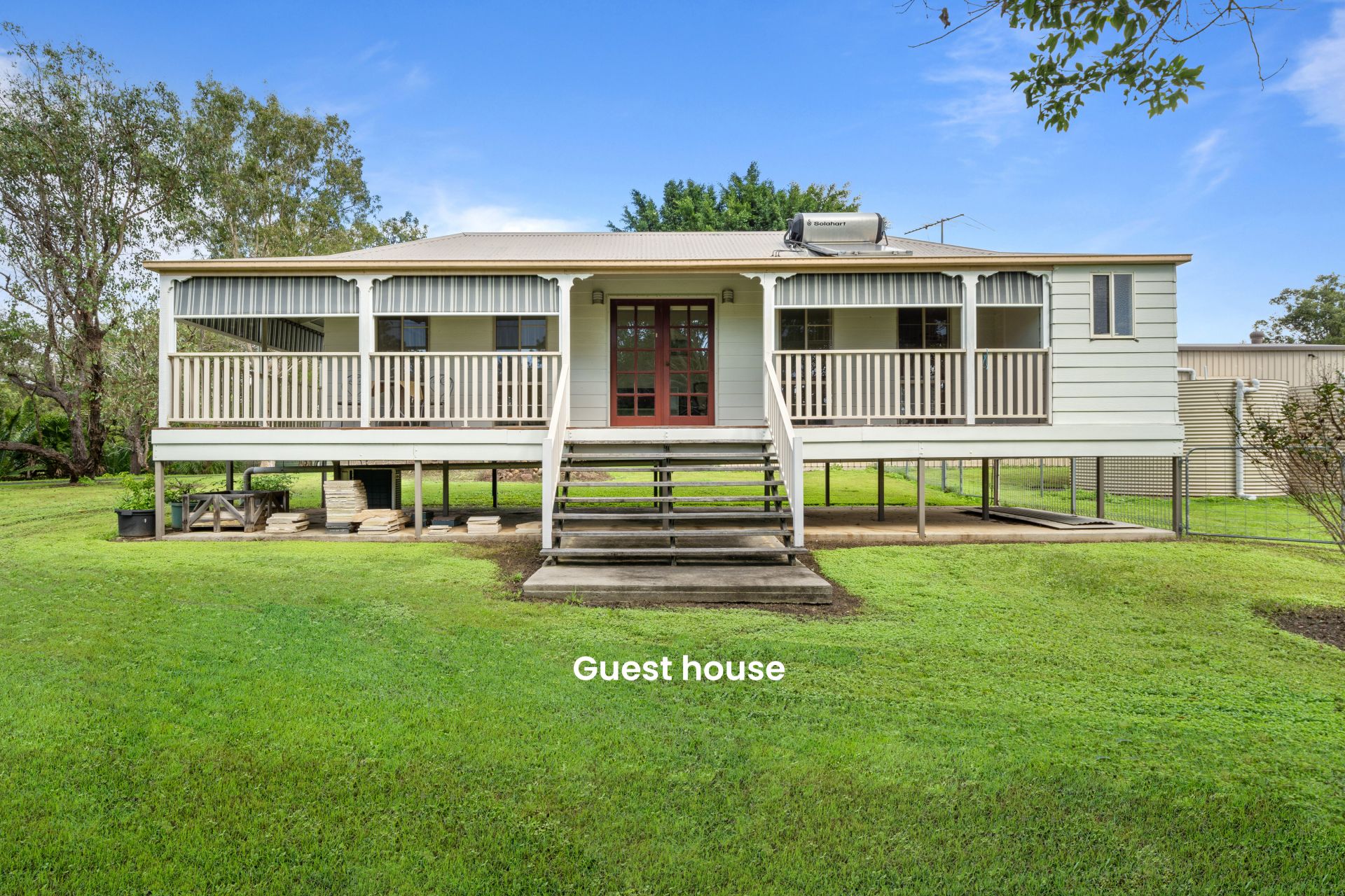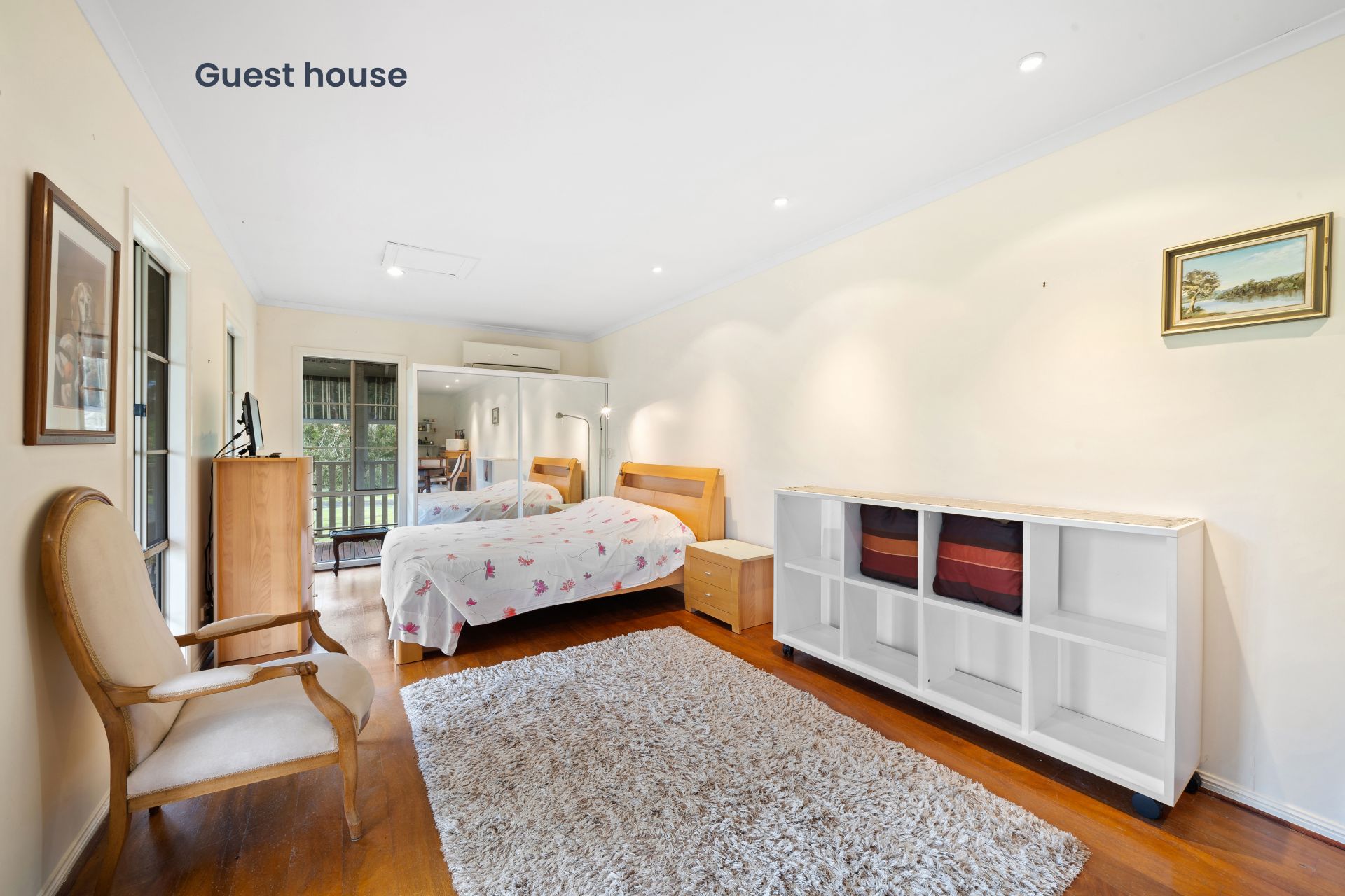 - The detached guest house features open plan layout with kitchenette featuring air-conditioning, timber look flooring, down-lighting, cupboards, sliding windows with flyscreens, access to the front verandah as well as a European bathroom.