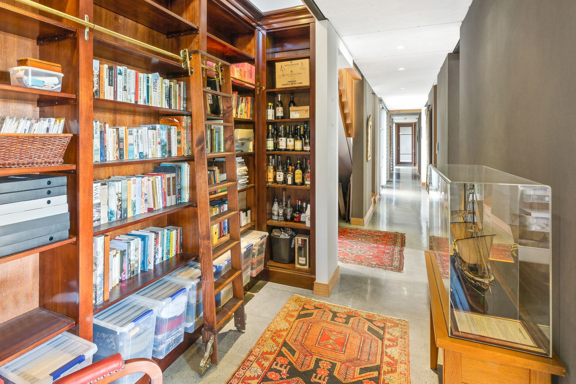- Located just off the home offices is the library featuring custom timber cabinetry with rolling ladder, gallery lighting, polished concrete flooring, under stairs seating & custom wine racks.