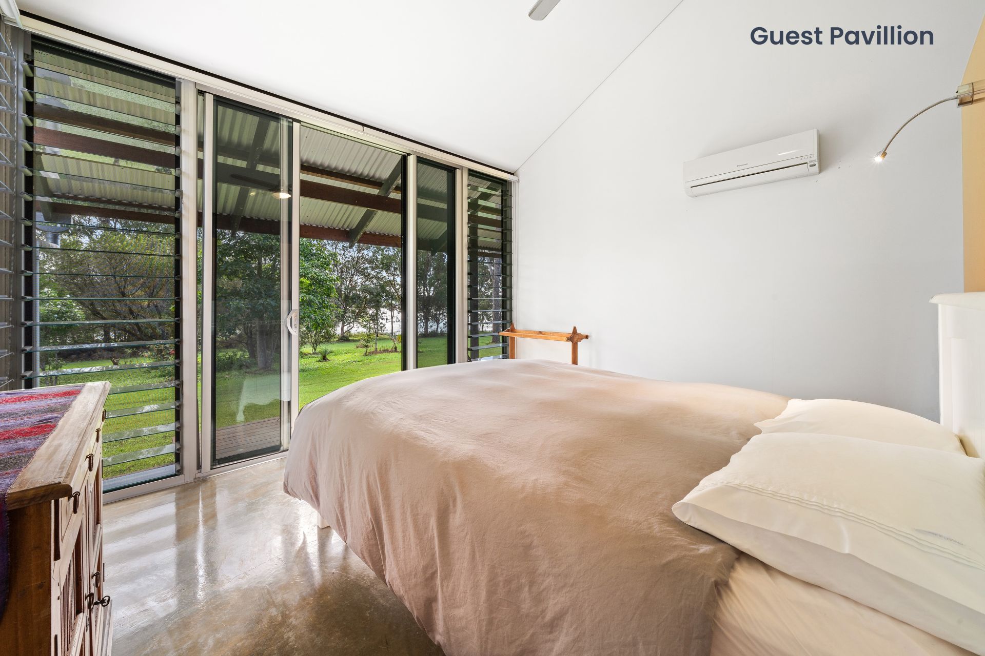 > Bedroom 2 features polished concrete flooring, raked ceilings, air-conditioning, ceiling fan with light, custom robes, roller blinds, louver windows, large glass sliding doors, security mesh & access to a private landing.
