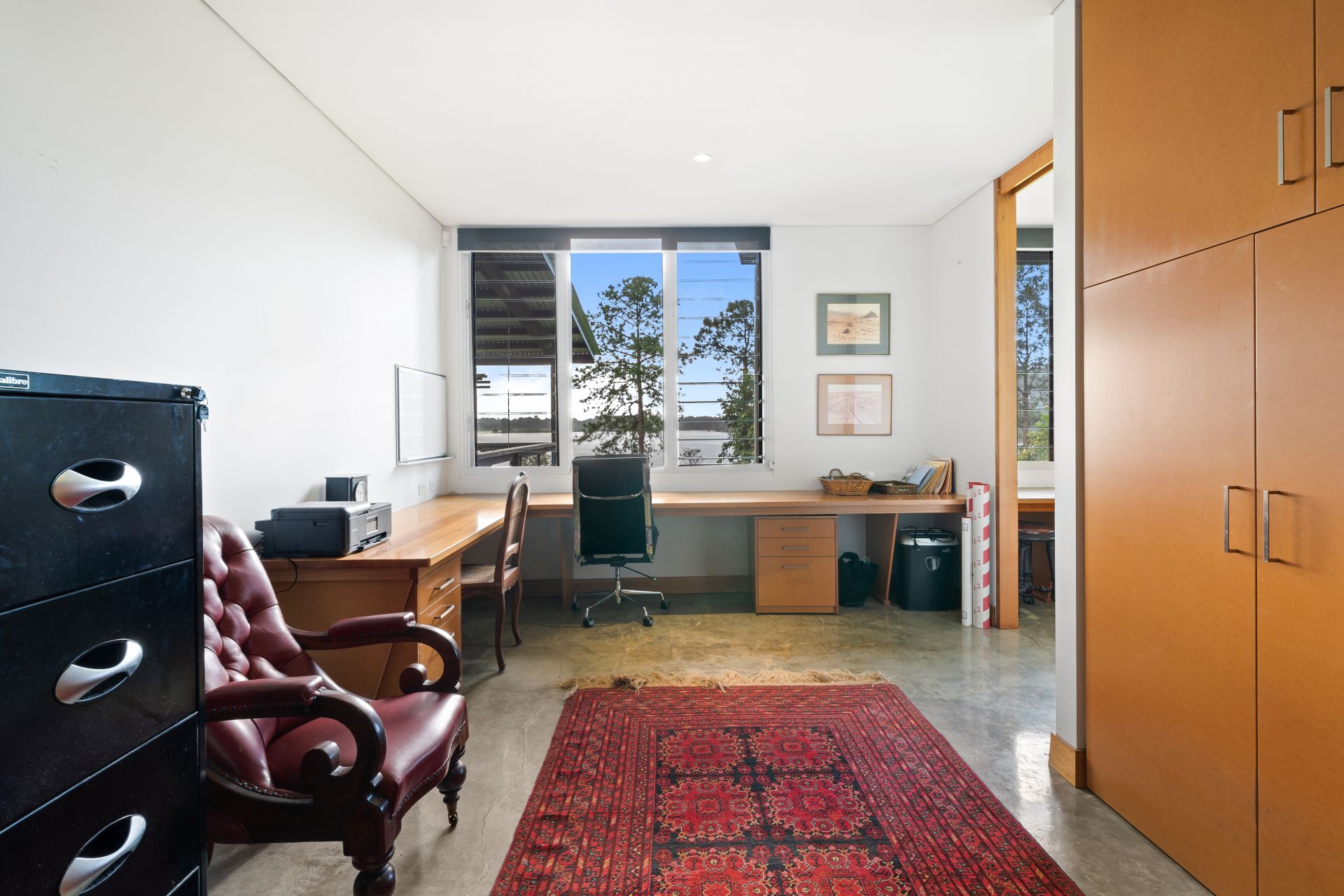 - Located on the entry level are the dual adjoining home offices boasting lake views, polished concrete flooring, extra-high ceilings, down-lighting, louver windows with roller blinds, security mesh, custom cabinetry, custom built-in desks, large partition door between offices & dual air-conditioning.