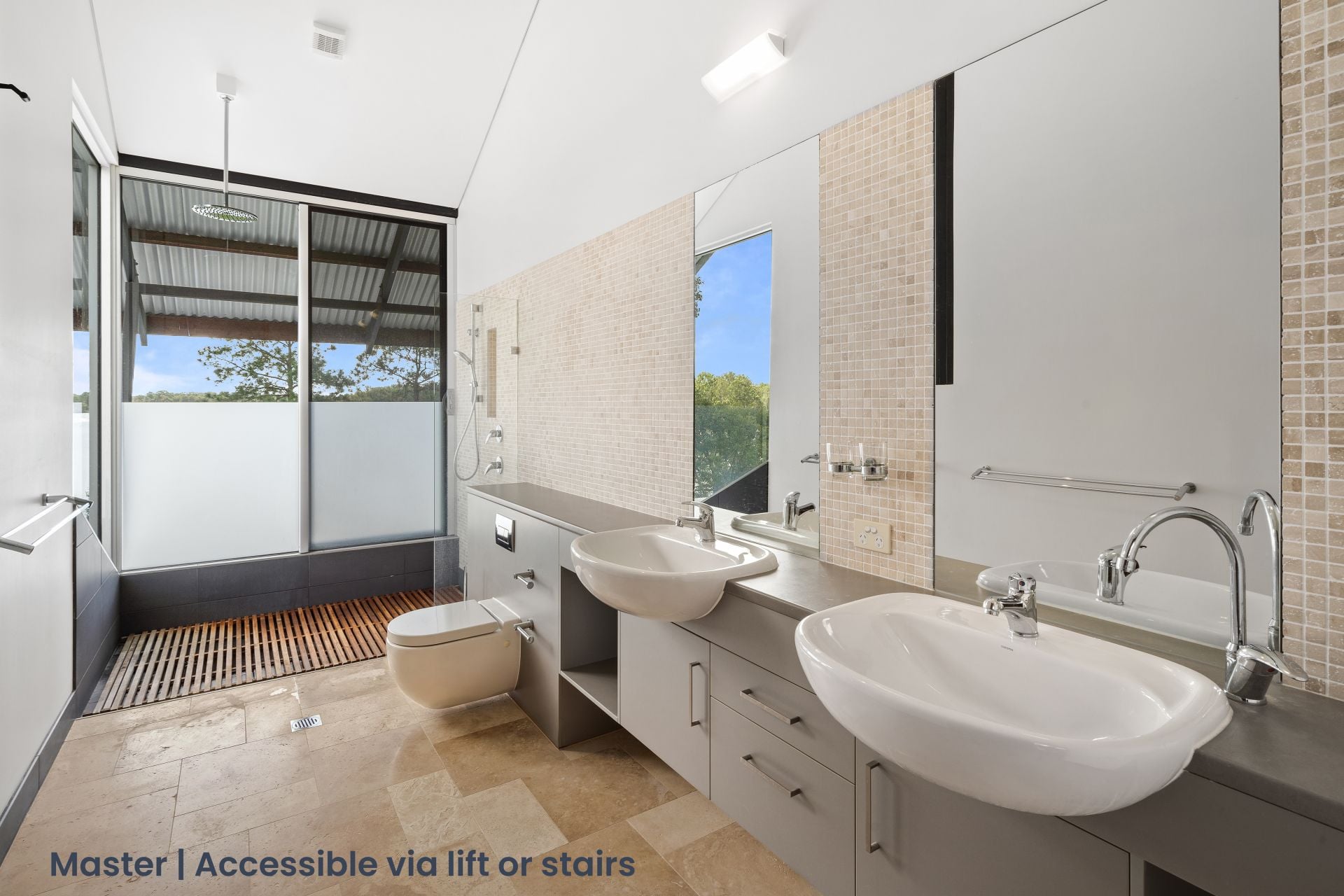 - The ensuite to the master features large shower with dual showerheads, travertine flooring, dual basin vanity with plenty of storage, dual vanity mirrors, raked ceilings, down & sconce lighting, louver & sliding windows with security mesh, extractor, dual towel racks & toilet.
