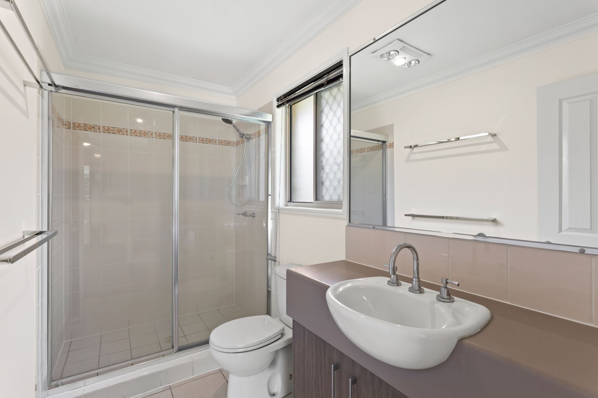 >The spacious ensuite features a large shower, vanity with loads of storage plus a wall mirror, and a toilet