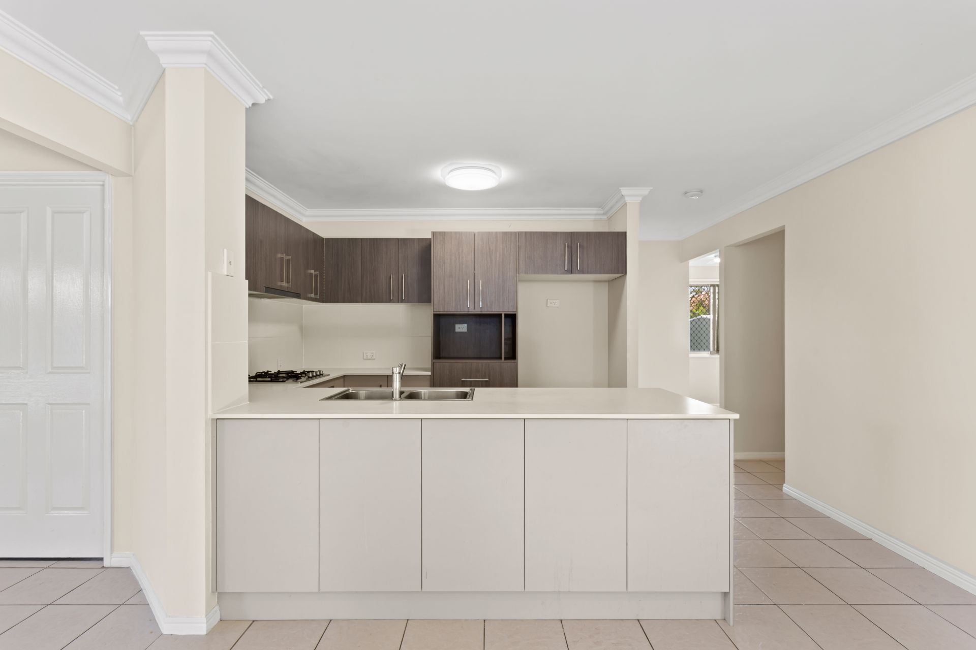 > Off-white tile flooring to hallways, kitchen/living/dining area, bathrooms and outdoor entertaining area
