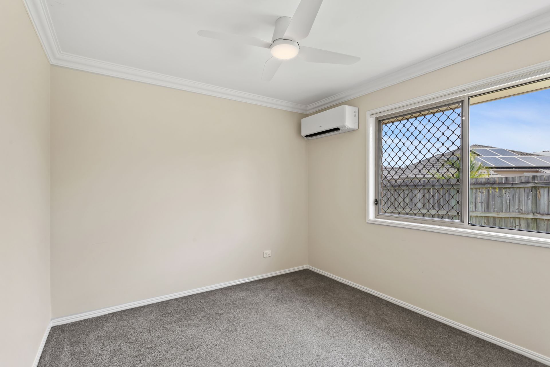 > The spacious master enjoys plush carpet flooring, security screens, split-system air-conditioning, ceiling fan, ensuite, built-in-robe plus direct access to the outdoor entertaining area