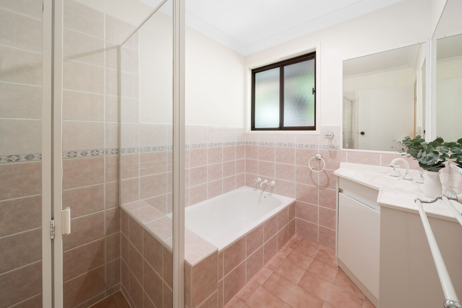 > The main bathroom features a shower with detachable showerhead, bath, single basin corner vanity with storage, large dual framed vanity mirrors, extractor, down-lighting, towel rack, hand towel rack, sliding frosted window and separate toilet.
