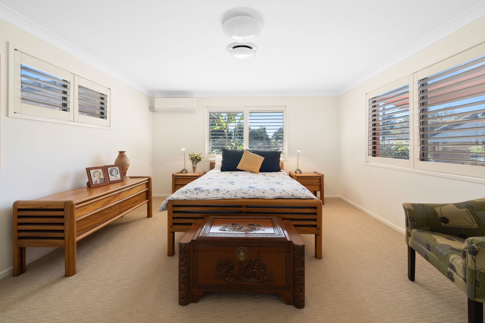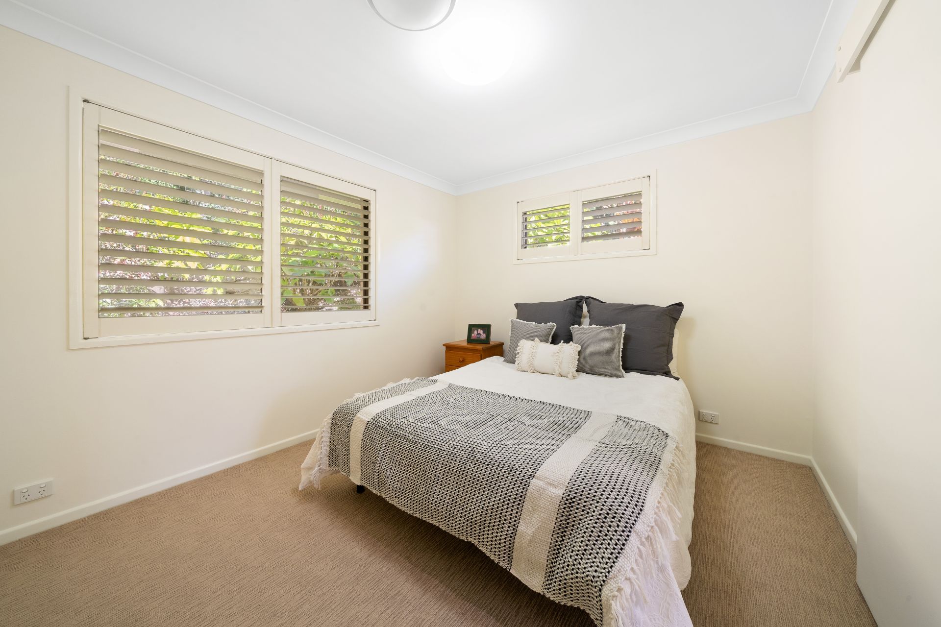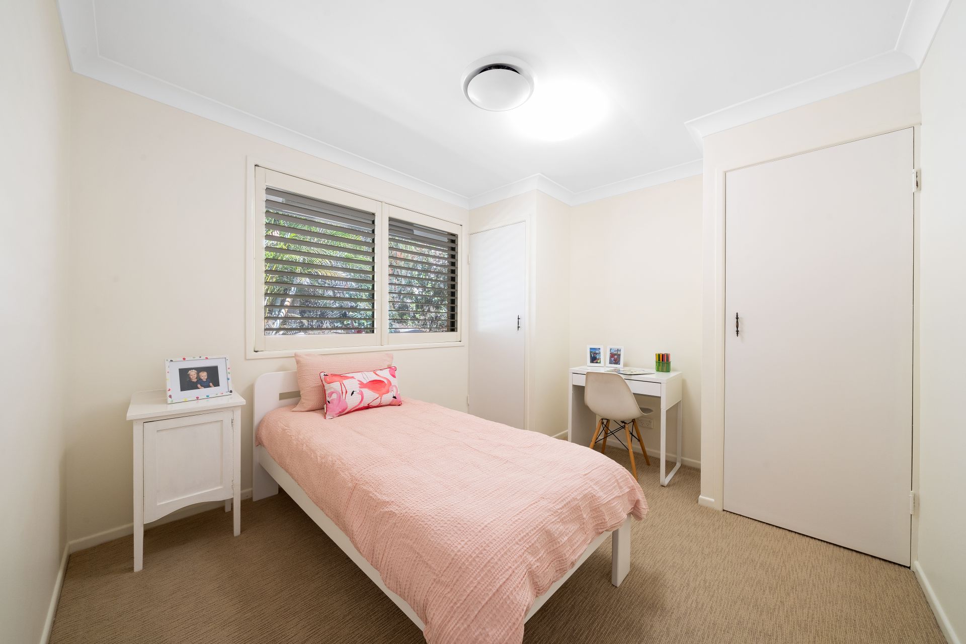> Bedrooms 2 and 3 offer ducted air-conditioning, built-in-robes, carpet flooring, oyster lighting, sliding windows with fly screens and plantation shutters.
