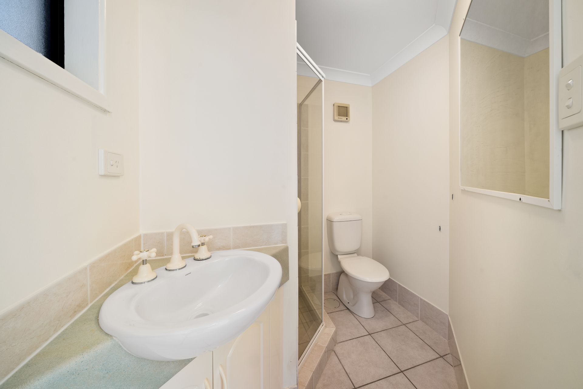 > Bathroom 3 located in the self-contained granny flat features a shower, single basin corner vanity with storage, large framed vanity mirror, extractor, lighting and separate toilet.