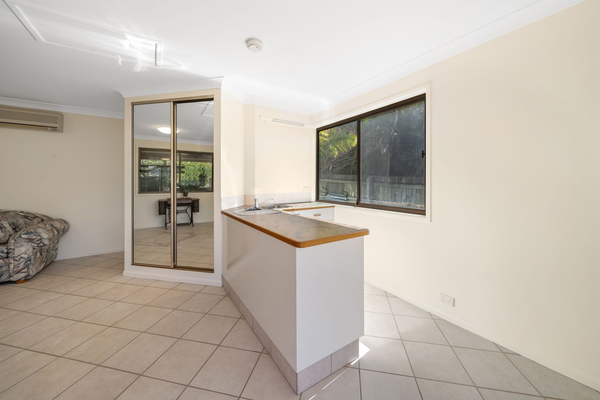 > Located at the back of the block is a self-contained granny flat boasting a sizable kitchenette with laminate benchtops and cabinetry, dual basin stainless-steel sink, tiled flooring, bathroom 3, sliding windows with fly screens as well as sliding doors giving you access to the separate alfresco entertaining.