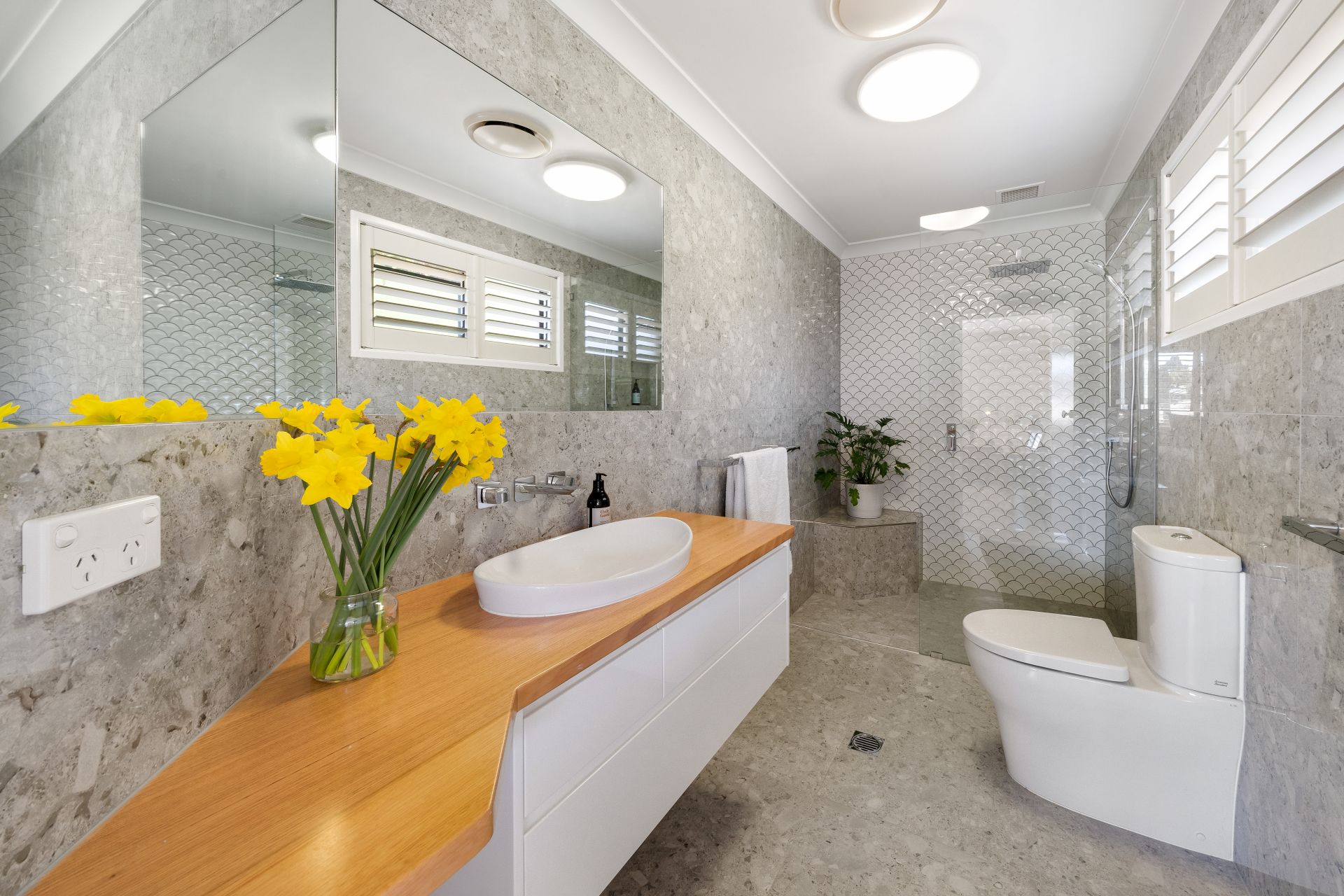> The ensuite bathroom to the master features chic floor-to-ceiling tiles, walk-in shower with a detachable and raindrop showerhead, single floating basin vanity with plenty of storage, large dual vanity mirrors, oyster lighting, extractor, towel rack and hand towel rail, sliding window with plantation shutters and toilet.