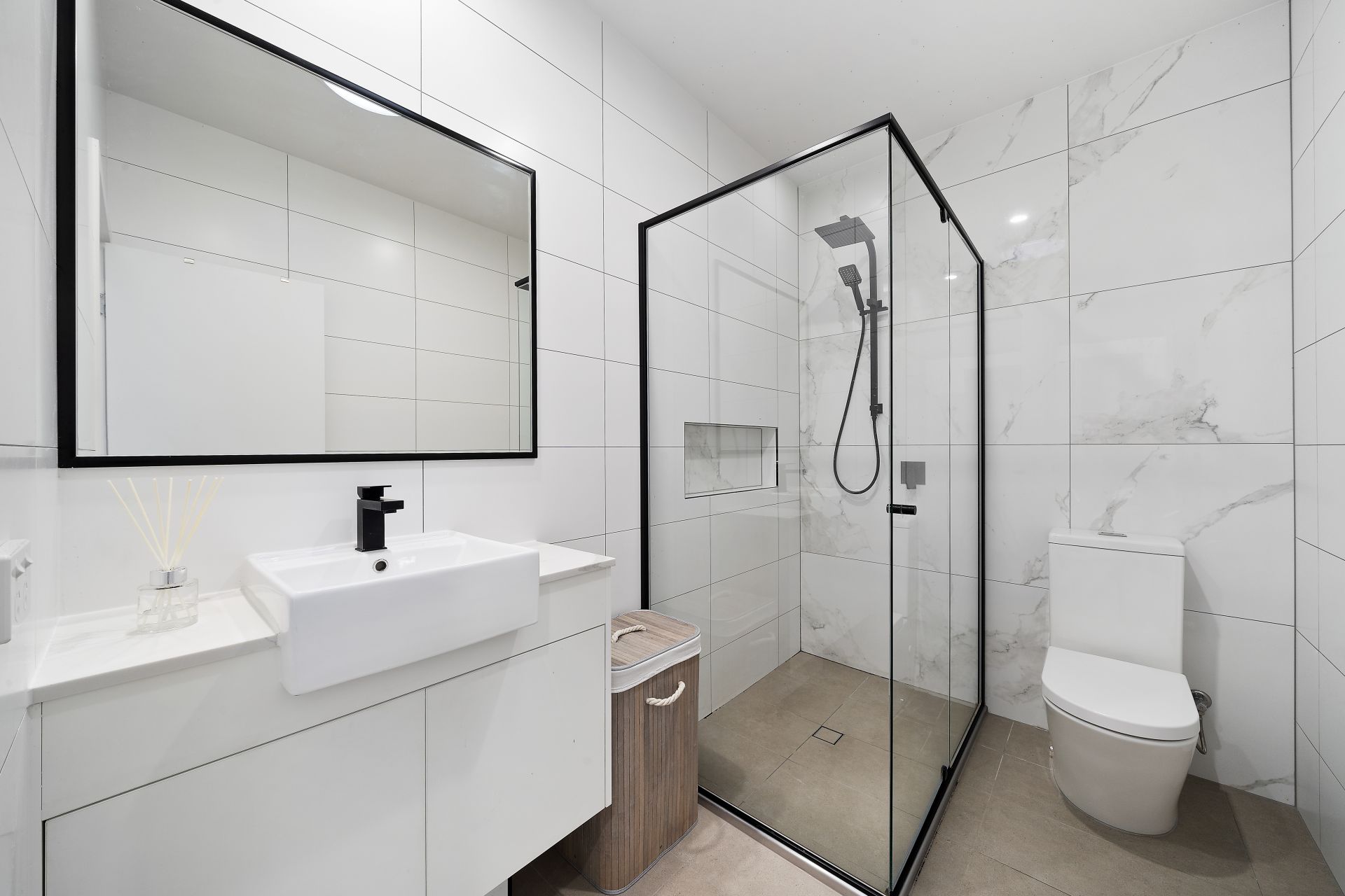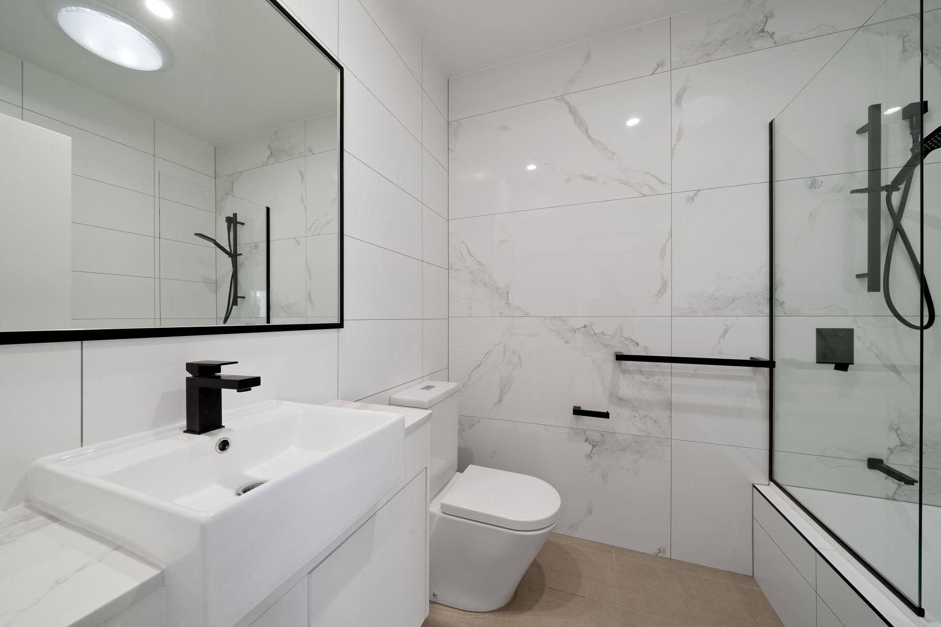 - Master bedroom features a luxury ensuite with floor to ceiling tiles, designer black fixtures, single vanity, large black framed mirror, rain shower head & handheld rose, black towel rails and soft-close toilet