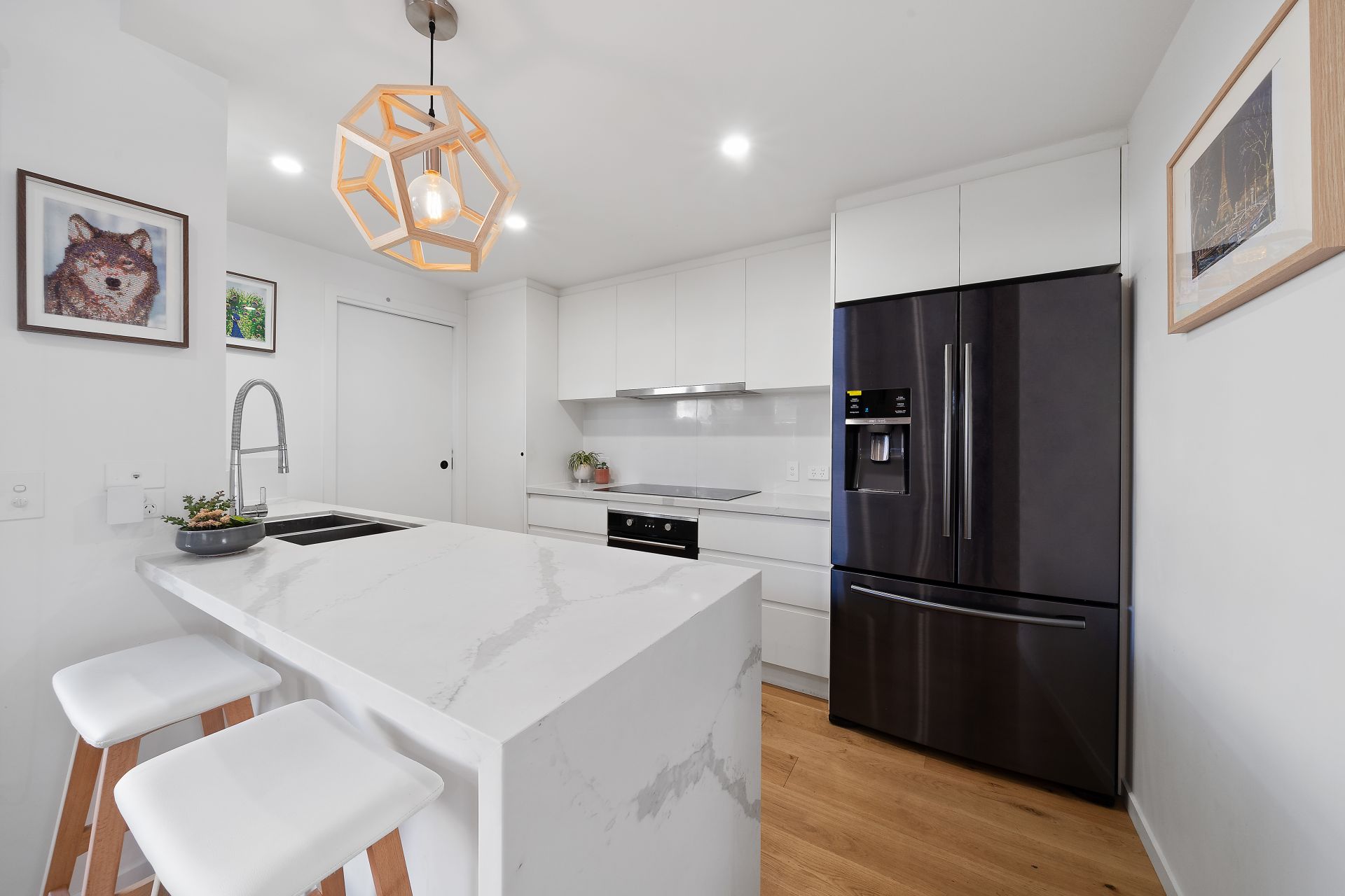 - 40mm stone benchtops, island with waterfall edge