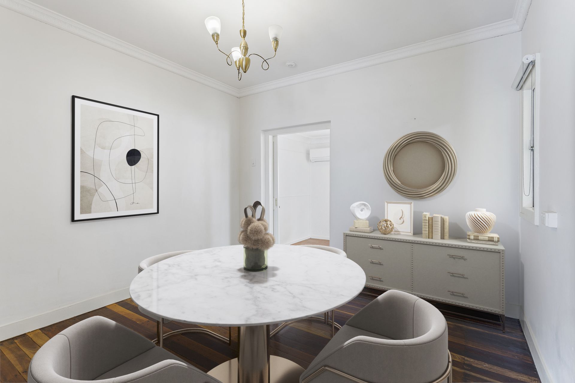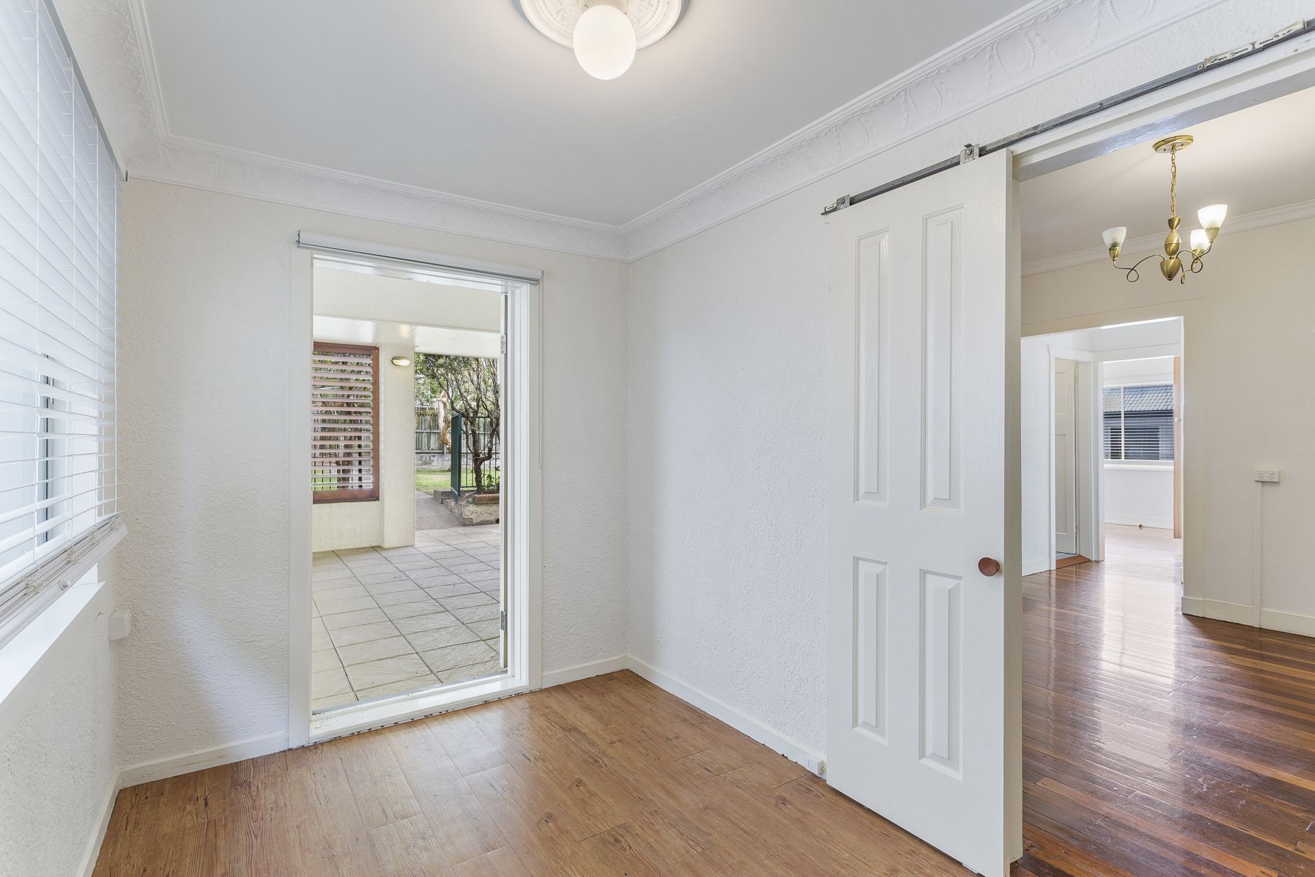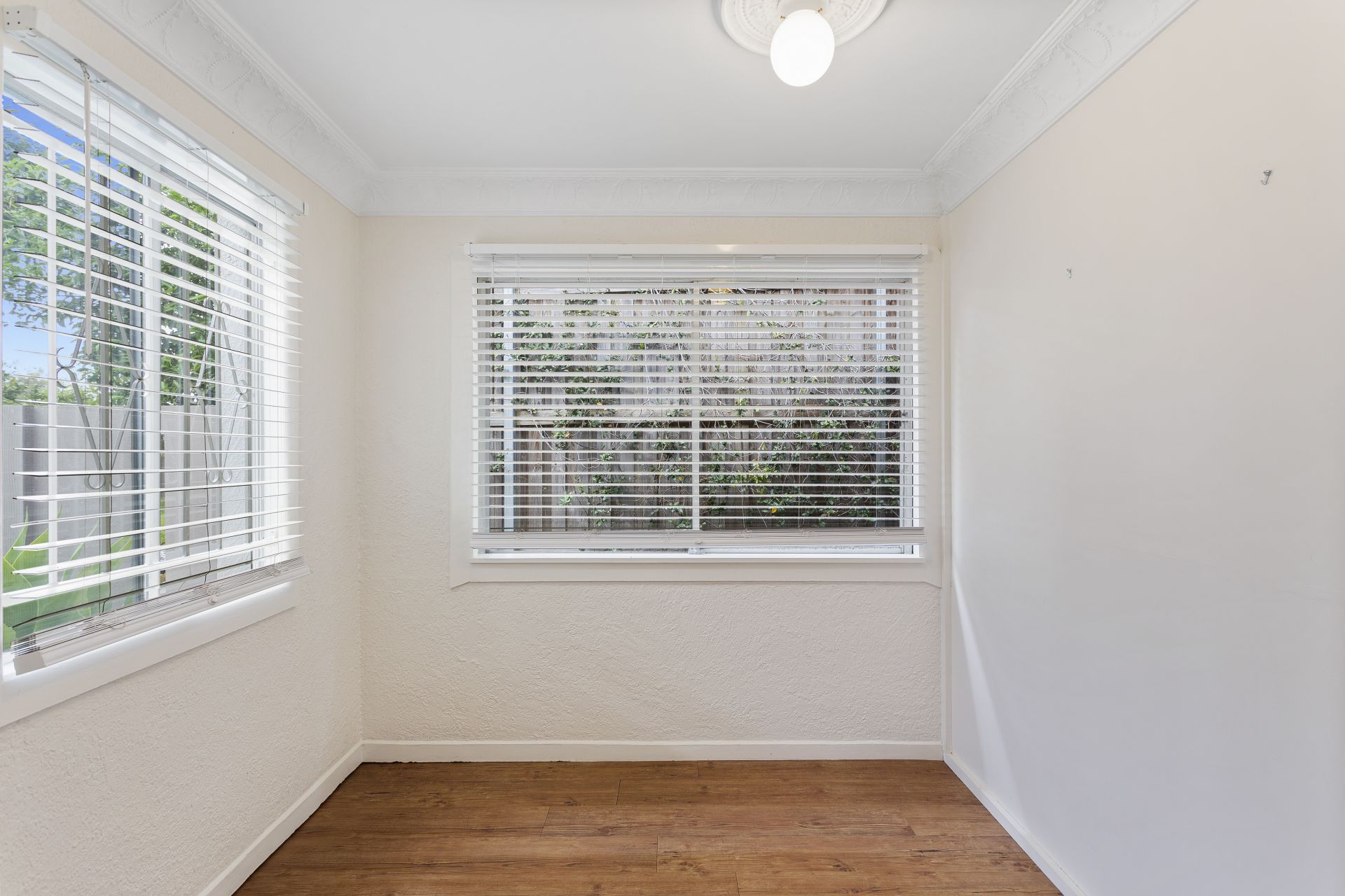 > Study 1 features ornate cornicing with ceiling rose, standard lighting, sliding windows with venetian blinds, security bar on front window and timber look flooring.