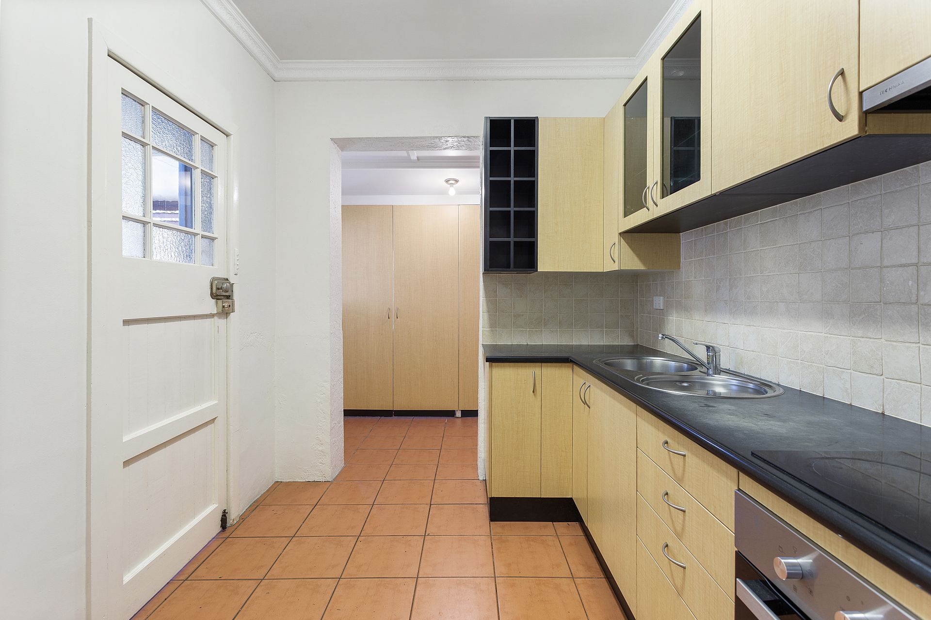 kitchen and through to the outdoor entertaining area, featuring extra high ceilings, ornate cornicing, pendant lighting, casement window and rich timber flooring.