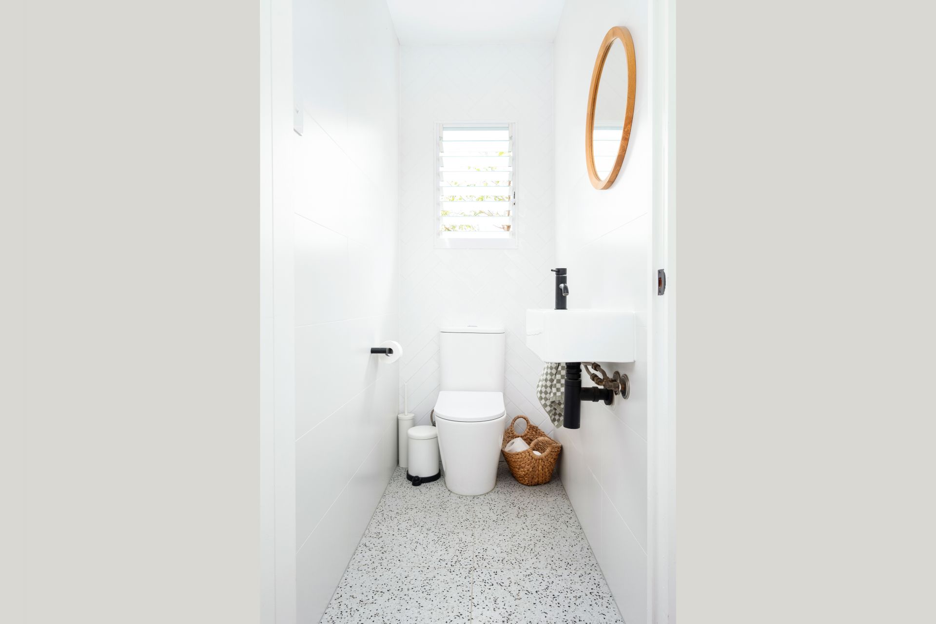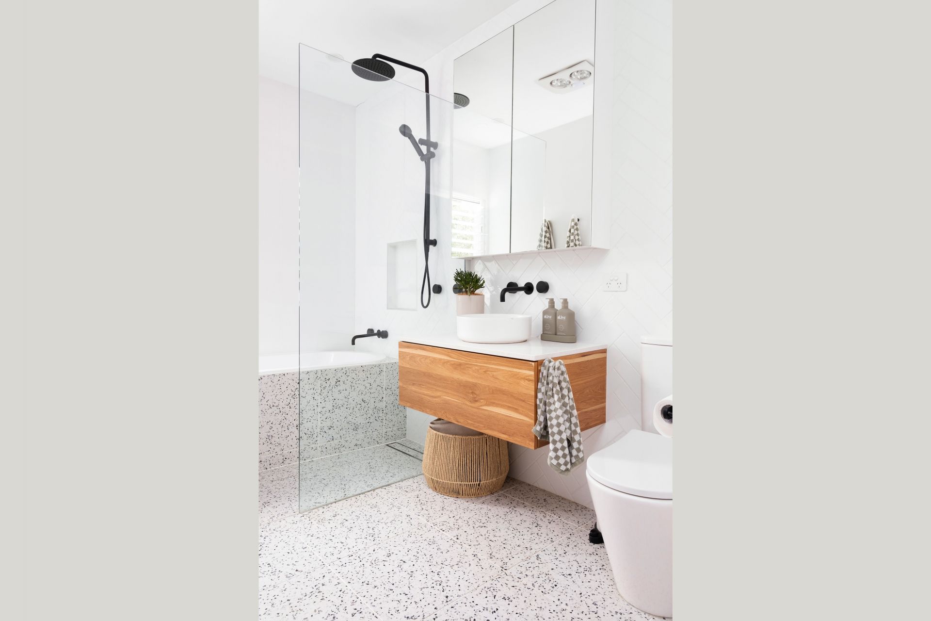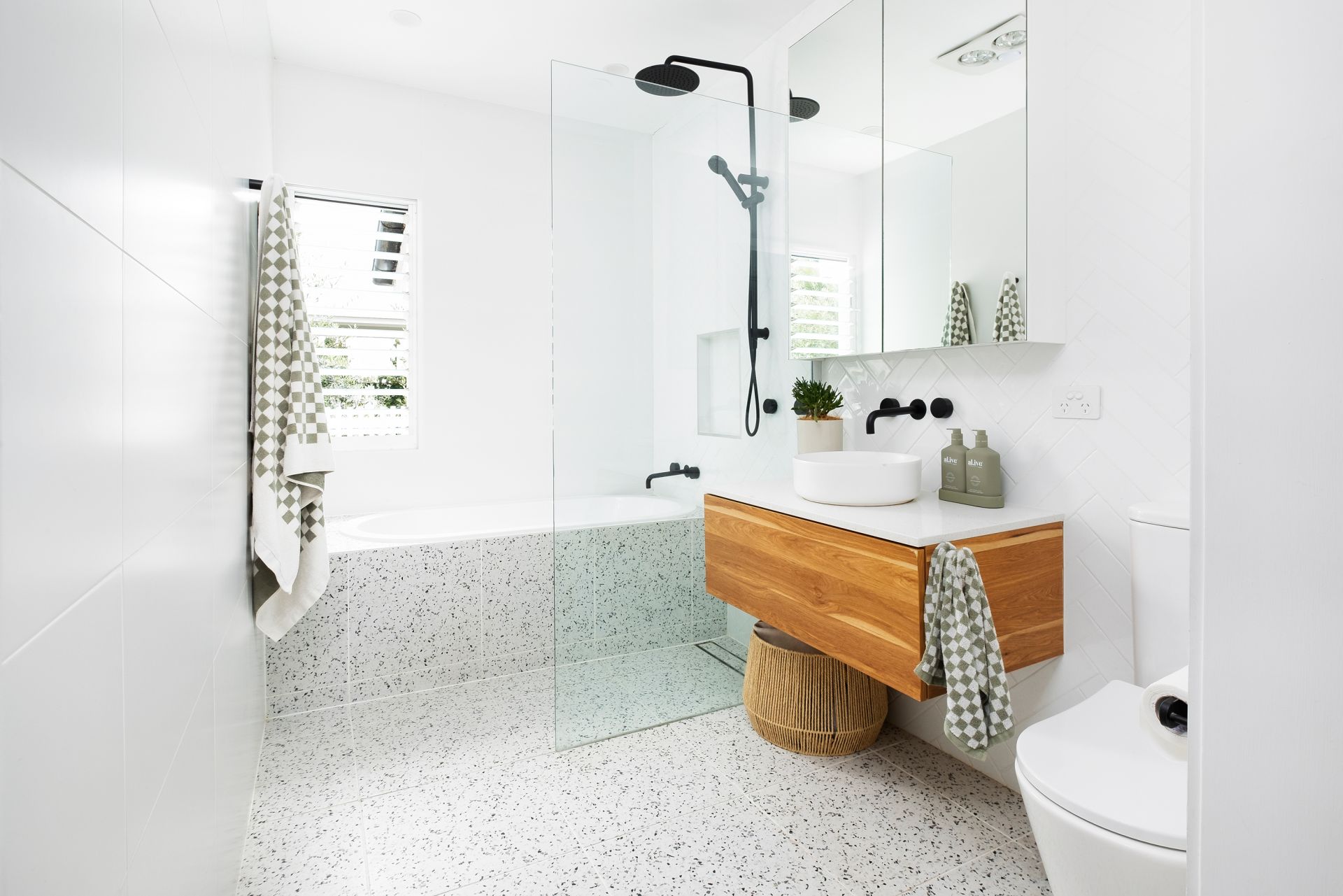 > The main bathroom features chic floor-to-ceiling tiles, separate bath, shower with dual shower heads (detachable and monsoon), single basin 20mm stone topped floating vanity with custom cabinetry, plenty of storage, large mirror faced medicine cabinet, down-lighting, towel hooks, extra-high ceilings, frosted louver window and toilet.